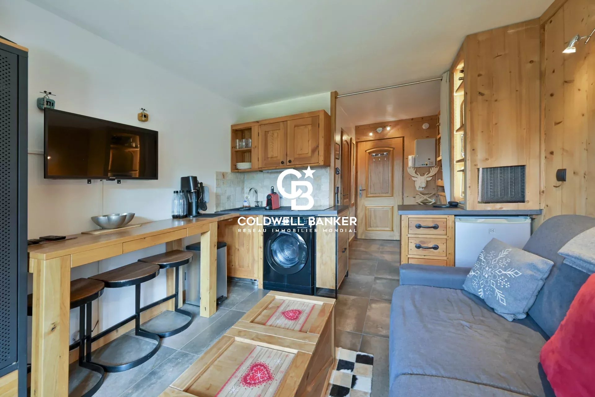 MEGEVE - LE JAILLET - Situation exceptionnelle, à 2 pas du départ de la télécabine du Jaillet pour ce "Studio + Coin montagne", en rez de chaussée, d'une surface de 16.77 m² (Loi Carrez). Il est composé d'une entrée avec placard et coin montagne, d'une salle de bains avec WC -d'un séjour-cuisine avec balcon de 5.00 m². La résidence, style "Chalet savoyard", est édifiée dans un environnement calme et champêtre. La vue est dégagée et imprenable sur le Mont-Joly, le massif de Rochebrune et les Aiguilles Croches. L'exposition plein Sud permet un ensoleillement de grande qualité en toutes saisons. Le centre du village et la zone piétonne sont à 700 m seulement. Il est vendu avec une cave et un casier à skis (Les charges de 80 €/mois comprennent : les parties communes générales, chauffage parties communes et les consommations d'eau chaude et d'eau froide)