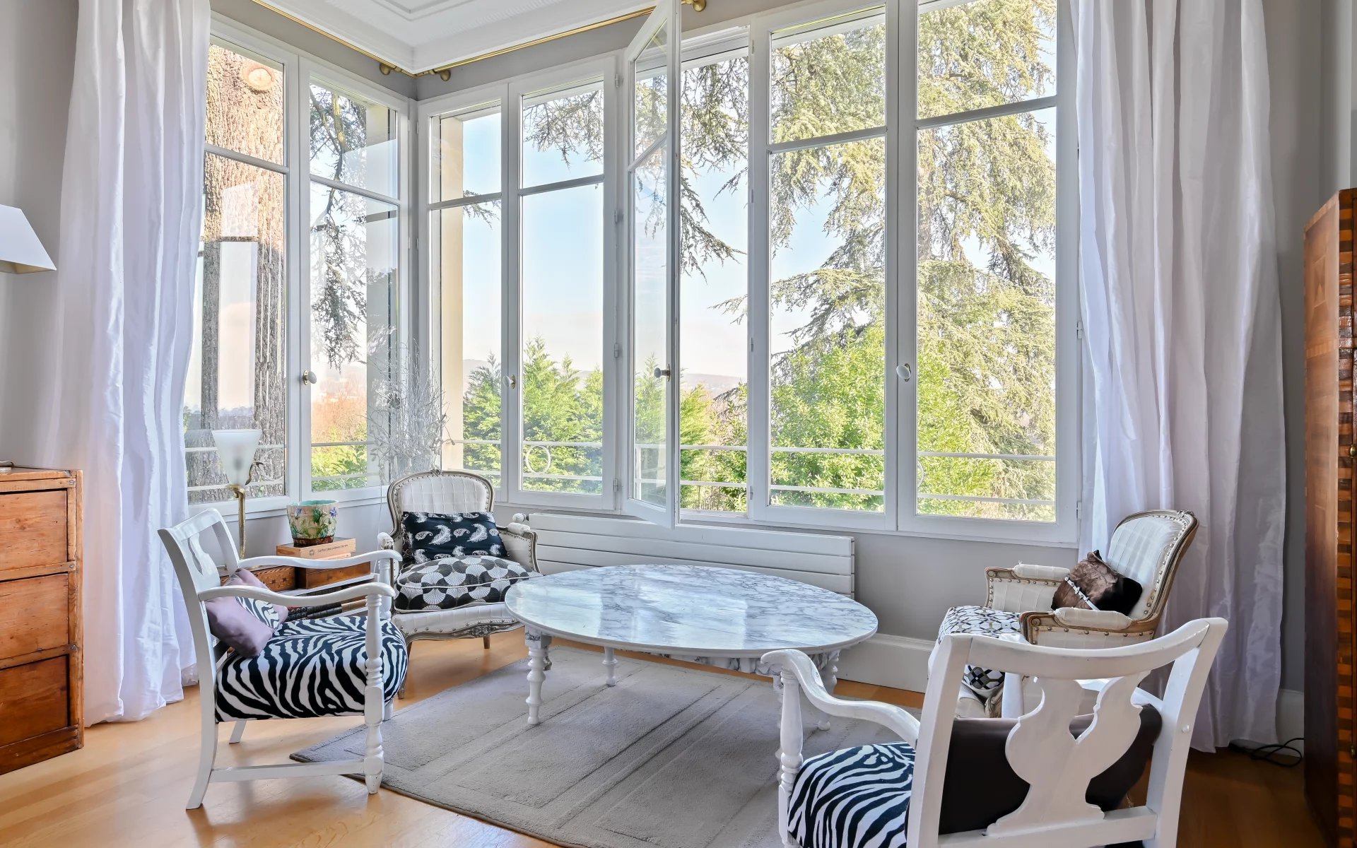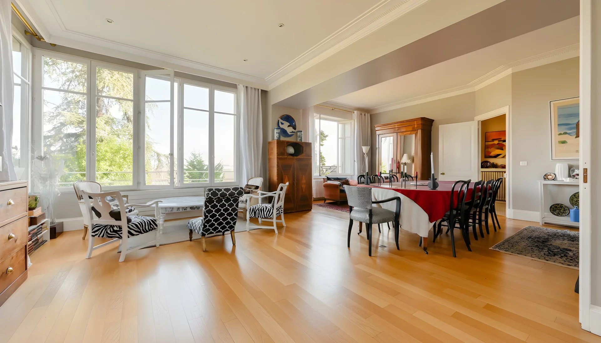 À Dardilly, au seuil des Monts d’Or, se dévoile une propriété Art Déco d’une rare élégance. Une adresse confidentielle, à un quart d'heure de Bellecour, où le calme bucolique rencontre la proximité immédiate de Lyon mais également des commerces de proximité de Dardilly et de ses transports en commun. Édifiée sur un parc paysagé de 2 385 m² — dont une partie à bâtir — cette demeure d’environ 230 m² de surface utile bénéficie d’une lumière exceptionnelle et de volumes généreux sublimés par une belle hauteur sous plafond. Elle dispose de deux entrées et offre une circulation fluide entre ses différents espaces de vie, tous ouverts sur la nature. Le rez-de-chaussée accueille un salon d'angle intimiste avec cheminée, un vaste séjour, salle à manger d'environ 50 m² tourné vers le jardin et une grande cuisine indépendante. À l’étage, on retrouve quatre chambres dont 2 suites et une chambre avec balcon vous offre un coté nuit tout à fait agréable. En rez-de-jardin, une grande suite avec accès direct extérieur permet d’envisager un espace professionnel ou un univers totalement indépendant. Chaufferie, cave et garage / atelier complètent la partie technique. À l’abri des regards, la piscine s’intègre harmonieusement au jardin arboré, véritable écrin de tranquillité. La situation est idéale : centre de Dardilly, commerces, écoles, restaurants et bus vers Gorge de Loup accessibles en quelques minutes à pied. Les amoureux des espaces verts rejoindront aisément le parc de Lacroix-Laval, les terrains de tennis ou les parcours de golf voisins. Un lieu rare, empreint de caractère et de douceur, pour une vie familiale ou professionnelle d’exception aux portes de Lyon.