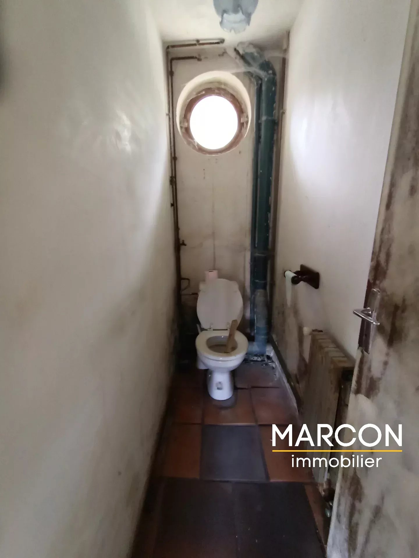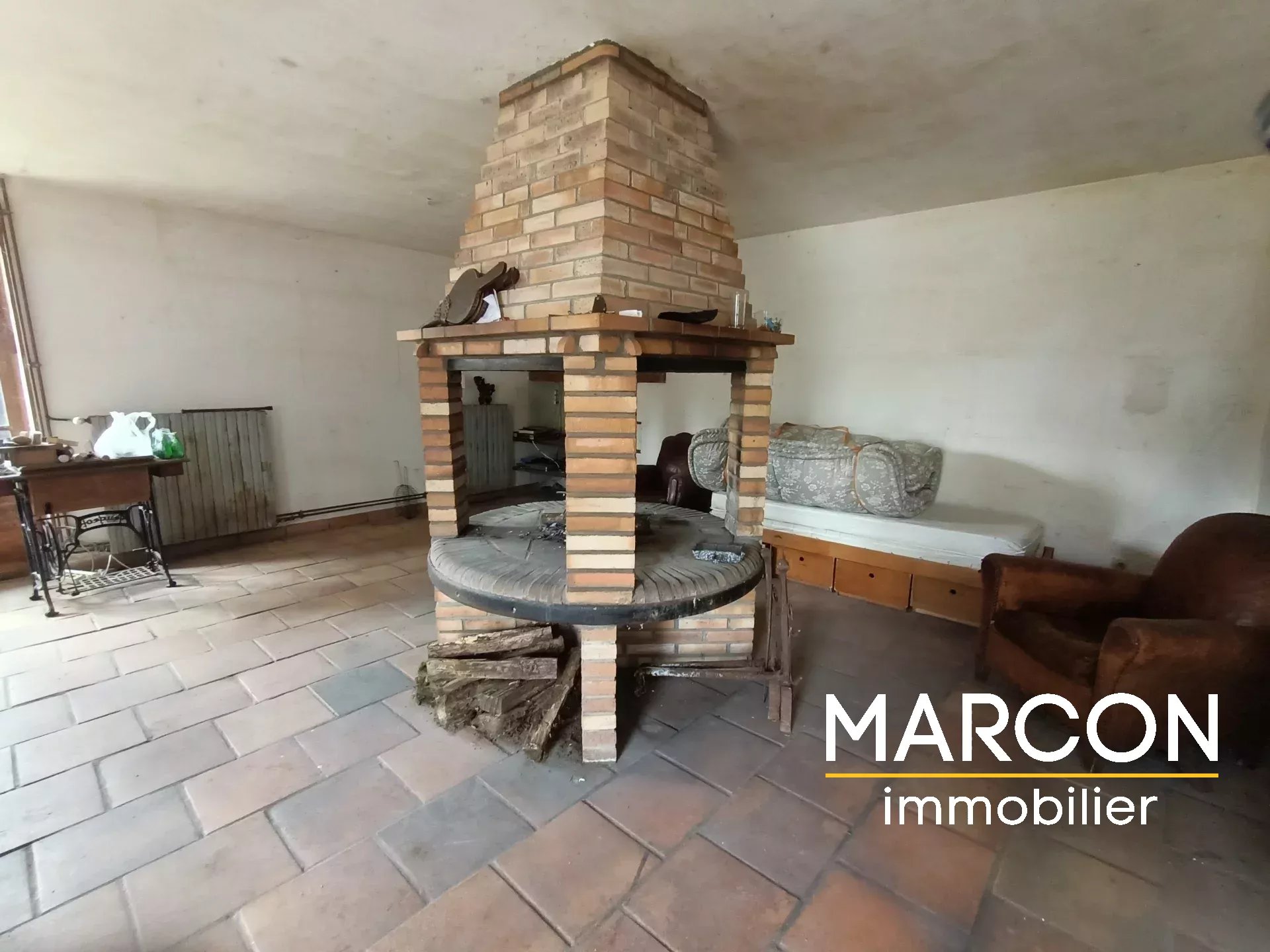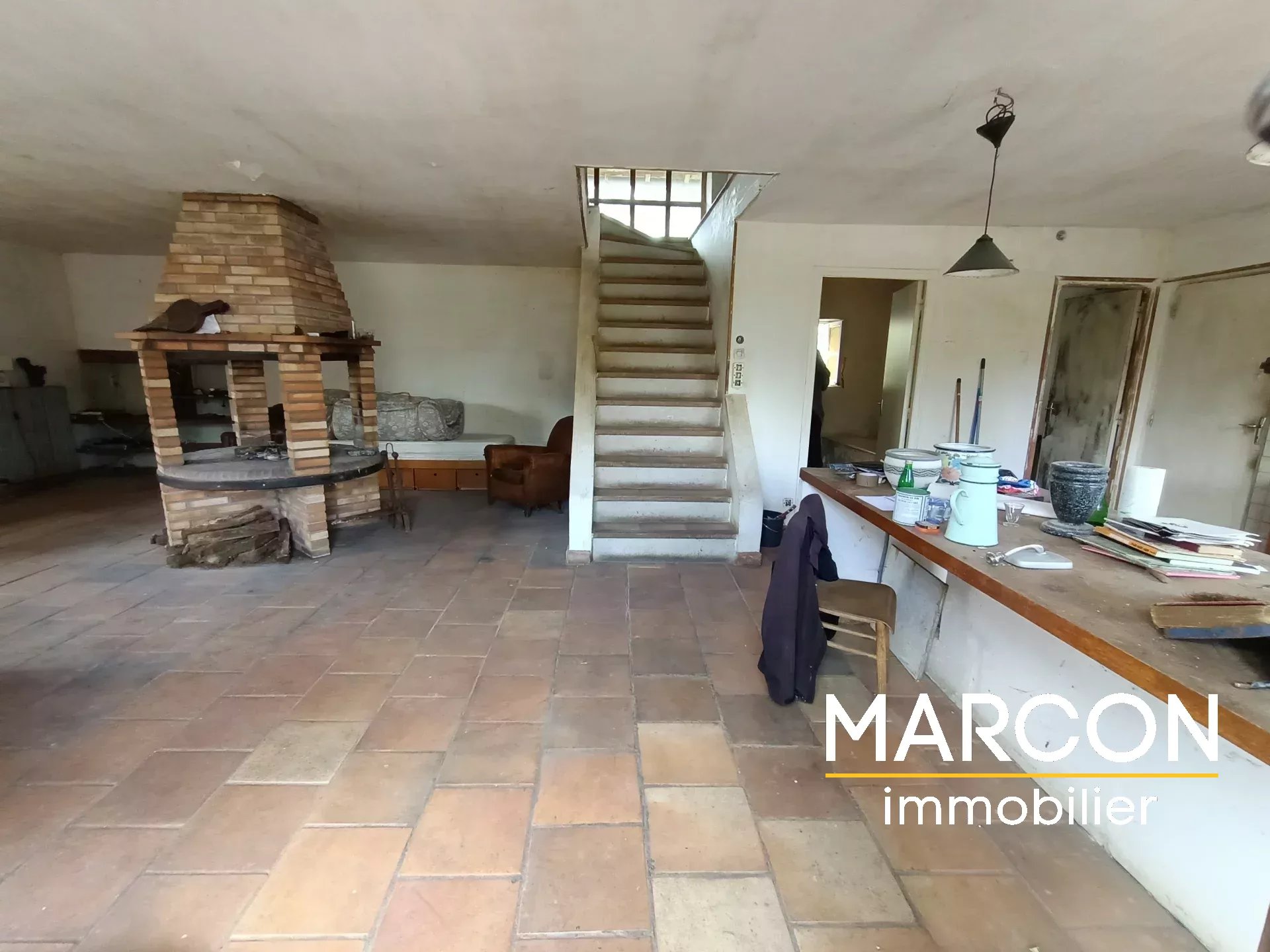 Une vaste pièce de vie accueillante avec cheminée centrale qui donne sur une cuisine ouverte, avec une accès direct sur une terrasse de 60m², une salle de bains, un wc, et un hangar attenant avec un coin chaufferie.