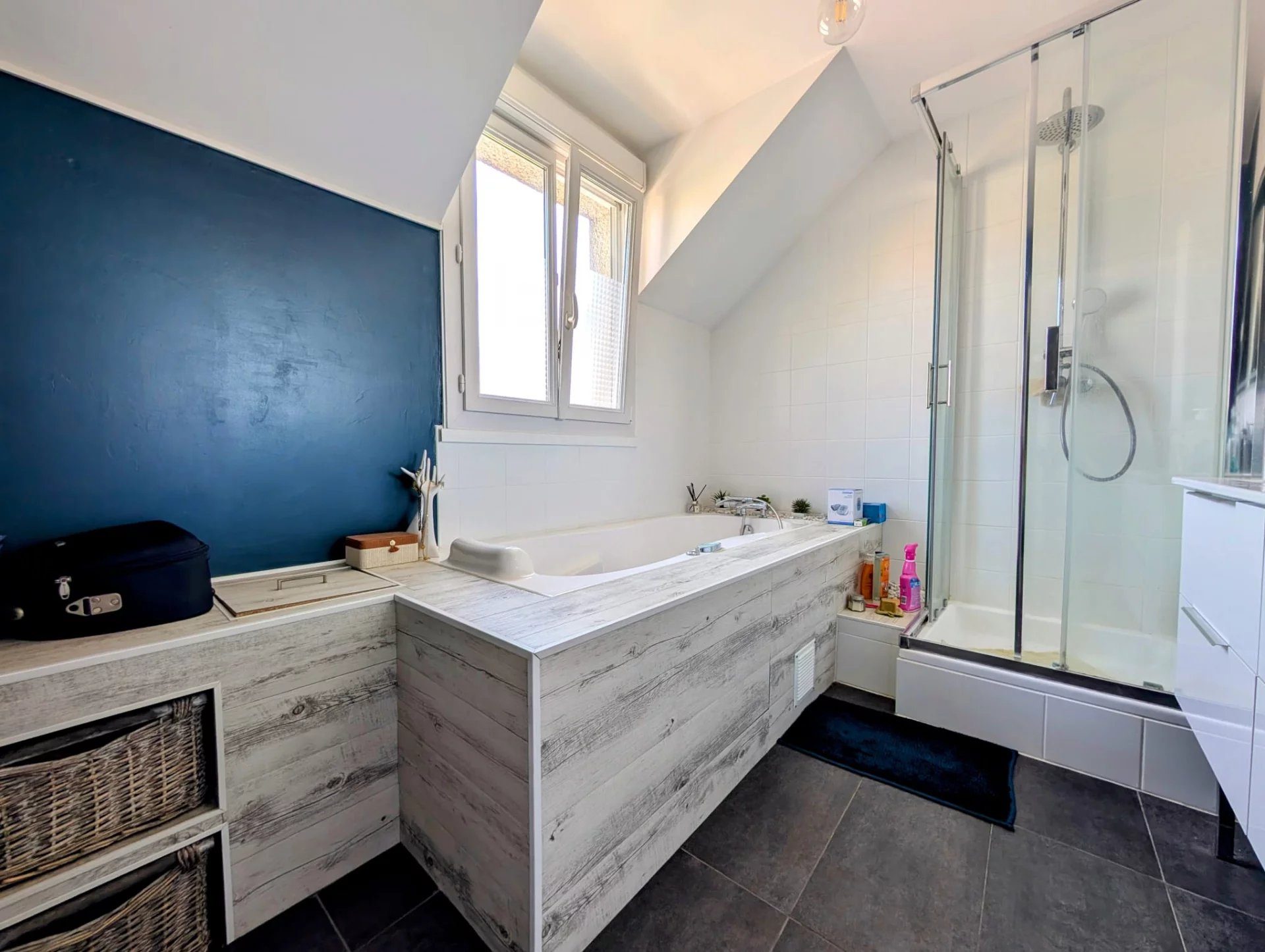 A l’étage. 3 chambres avec placards intégrés dont une chambre parentale avec salle de bains et douche privative . une salle d'eau avec WC et un dressing.