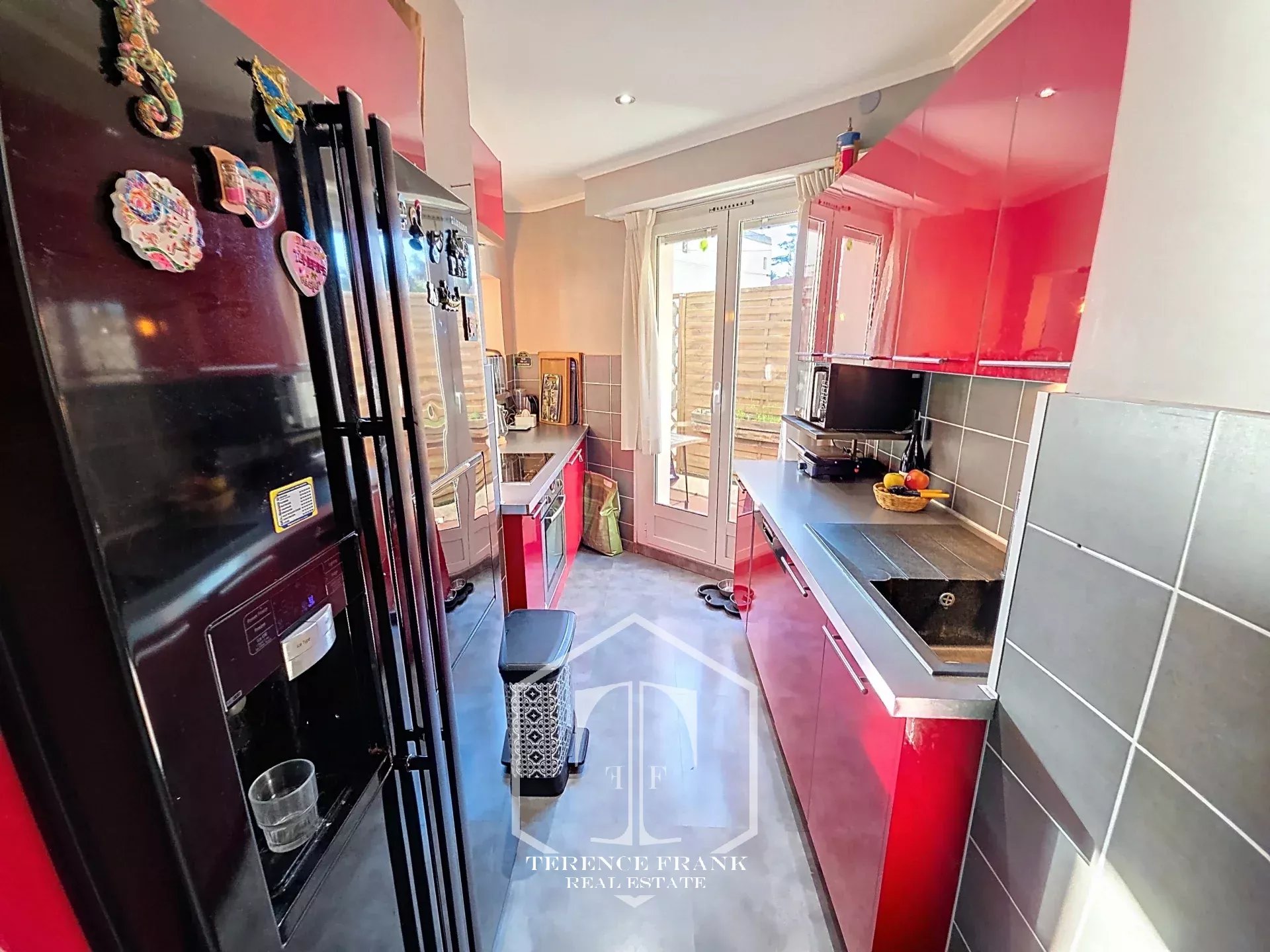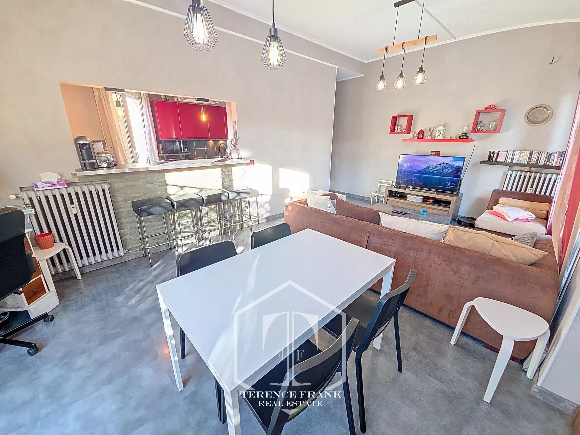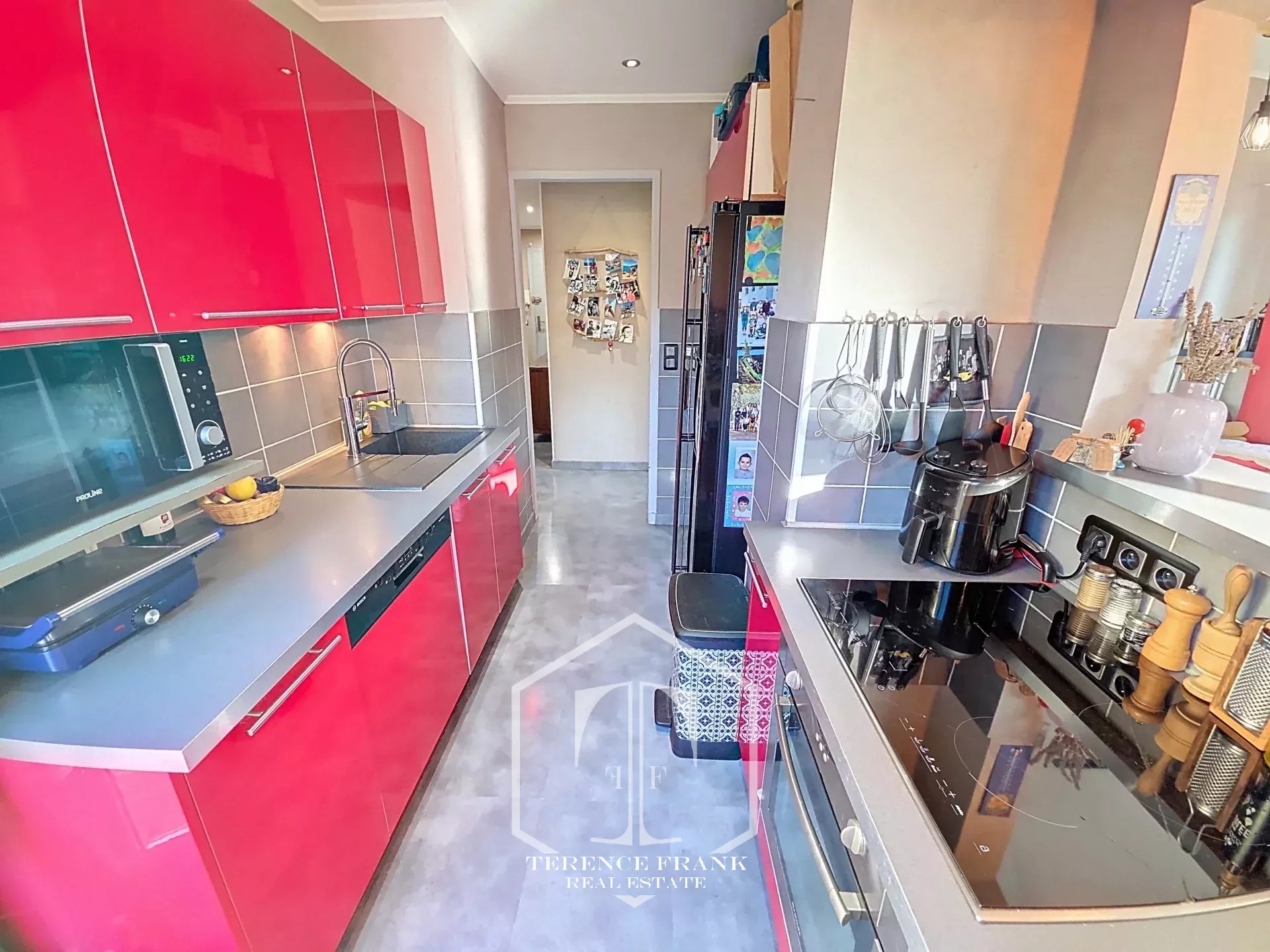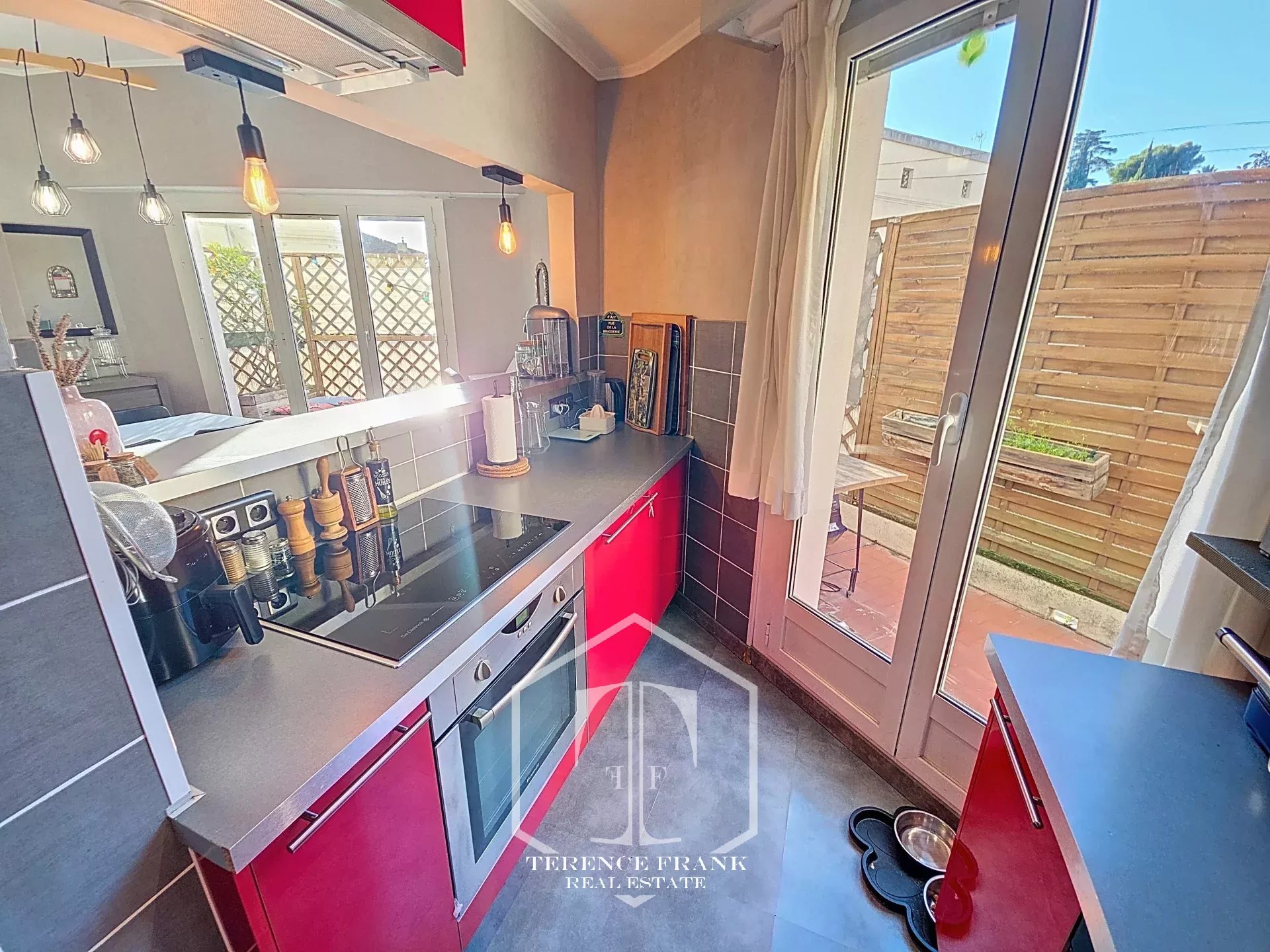 La cuisine semi américaine, entièrement aménagée et équipée, s’intègre harmonieusement à la pièce de vie, offrant un espace convivial et fonctionnel.