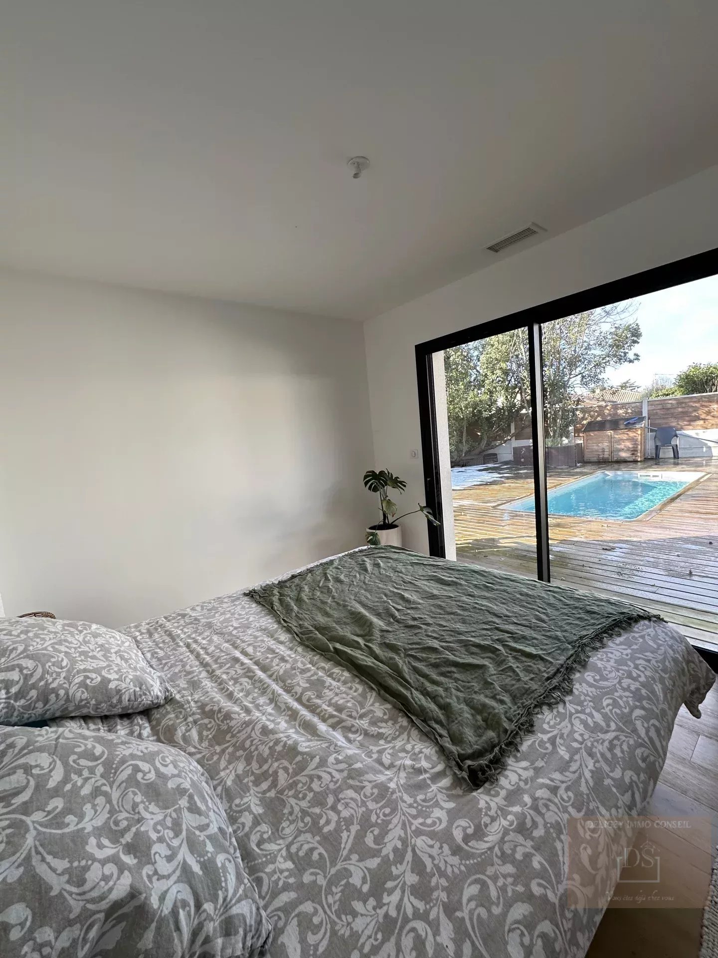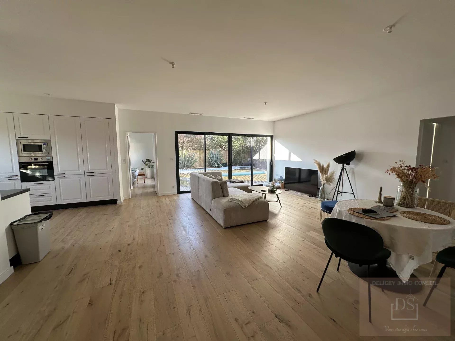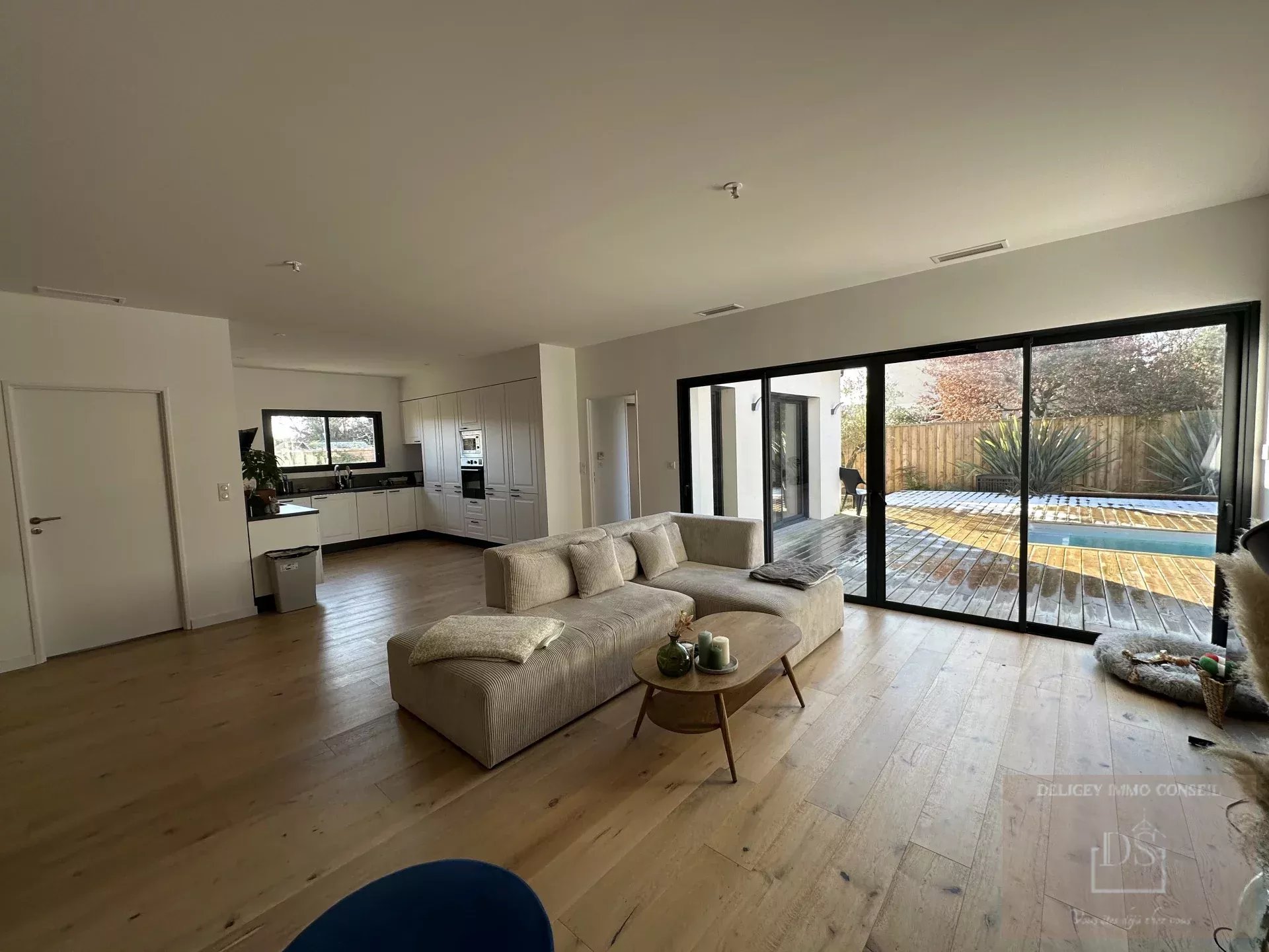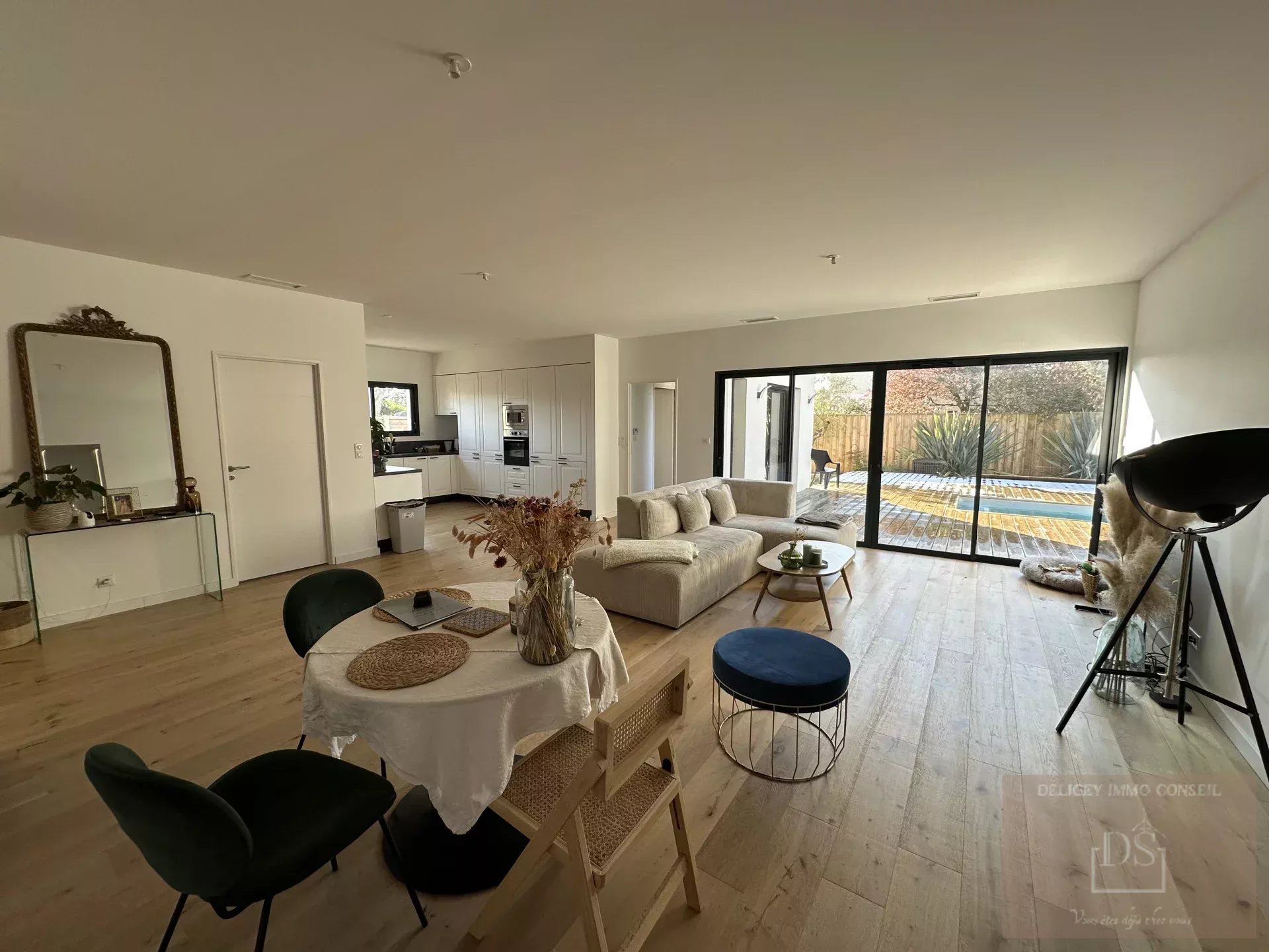 Découvrez cette superbe contemporaine de 2025, pensée dans les moindres détails pour offrir un cadre de vie d’exception. Sa vaste pièce de vie, orientée sud‑ouest, se distingue par une luminosité remarquable et une hauteur sous plafond qui sublime les volumes. La cuisine ouverte, entièrement équipée, s’intègre harmonieusement à l’ensemble et se prolonge par un cellier fonctionnel. La suite parentale de 25 m², avec salle d’eau et dressing sur mesure, offre un véritable espace privé. Trois chambres supplémentaires, une salle de bain complète (baignoire + douche), deux toilettes et un garage attenant complètent ce niveau de confort. Côté prestations, la maison bénéficie d’équipements haut de gamme : climatisation gainable, thermostats connectés par zone, cumulus thermodynamique et volets roulants centralisés, garantissant un confort optimal en toute saison. À l’extérieur, sur une parcelle de 600 m², une magnifique terrasse en bois de 130 m² entoure la piscine, créant un espace de détente privilégié, idéal pour recevoir ou profiter de moments en toute tranquillité. Sa situation à proximité immédiate des commerces et à 10 mn à pied de la gare en fait un atout supplémentaire. Frais de notaire réduits, garanties décennales, dommage ouvrage, une opportunité rare pour un bien de cette qualité. Il ne vous reste plus qu'à récupérer les clefs...Vous êtes déjà chez vous !!! Les informations sur les risques auxquels ce bien est exposé sont disponibles sur le site Géorisques : georisques.gouv.fr
