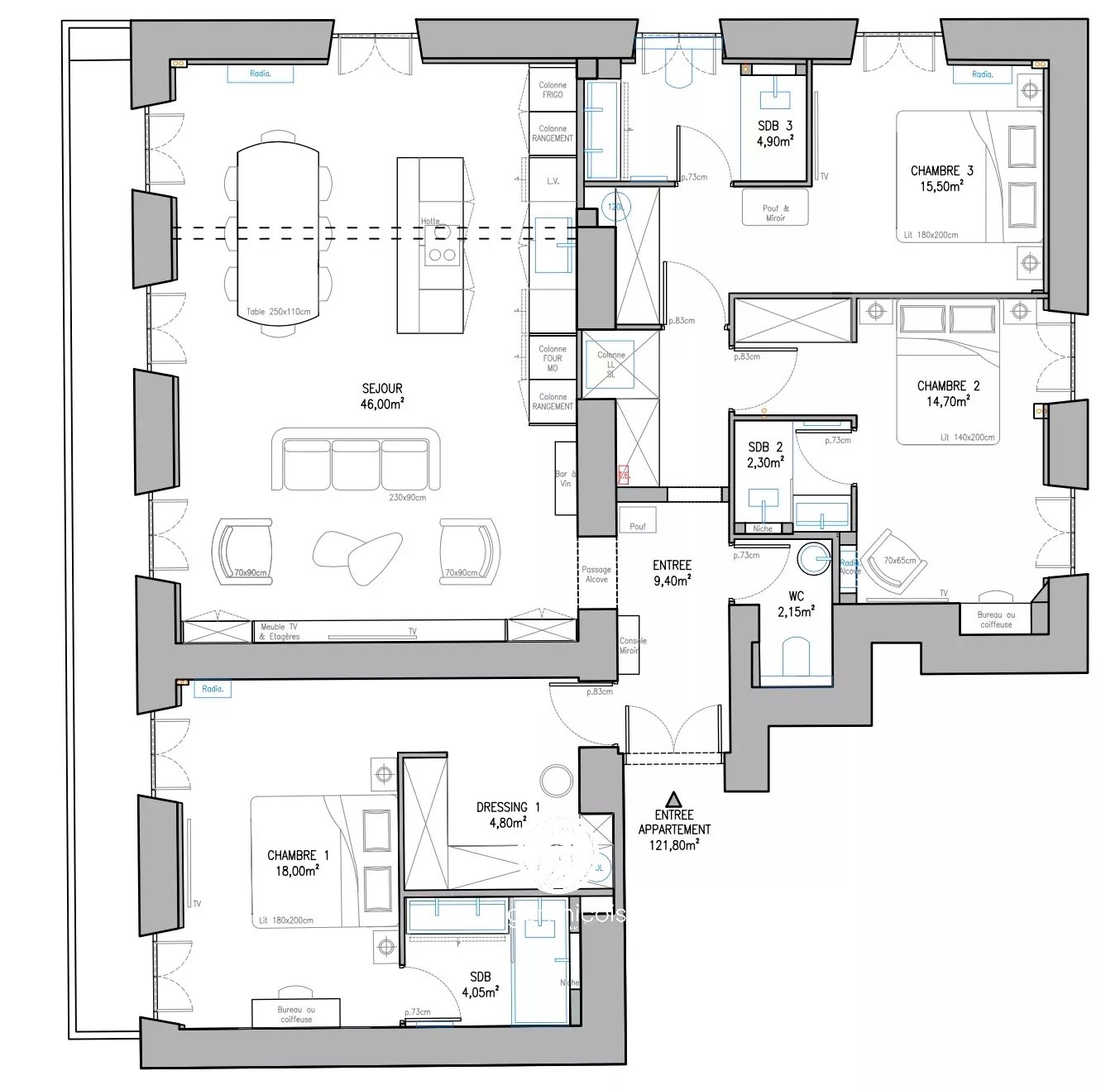 Un couloir dessert harmonieusement l’ensemble des pièces.