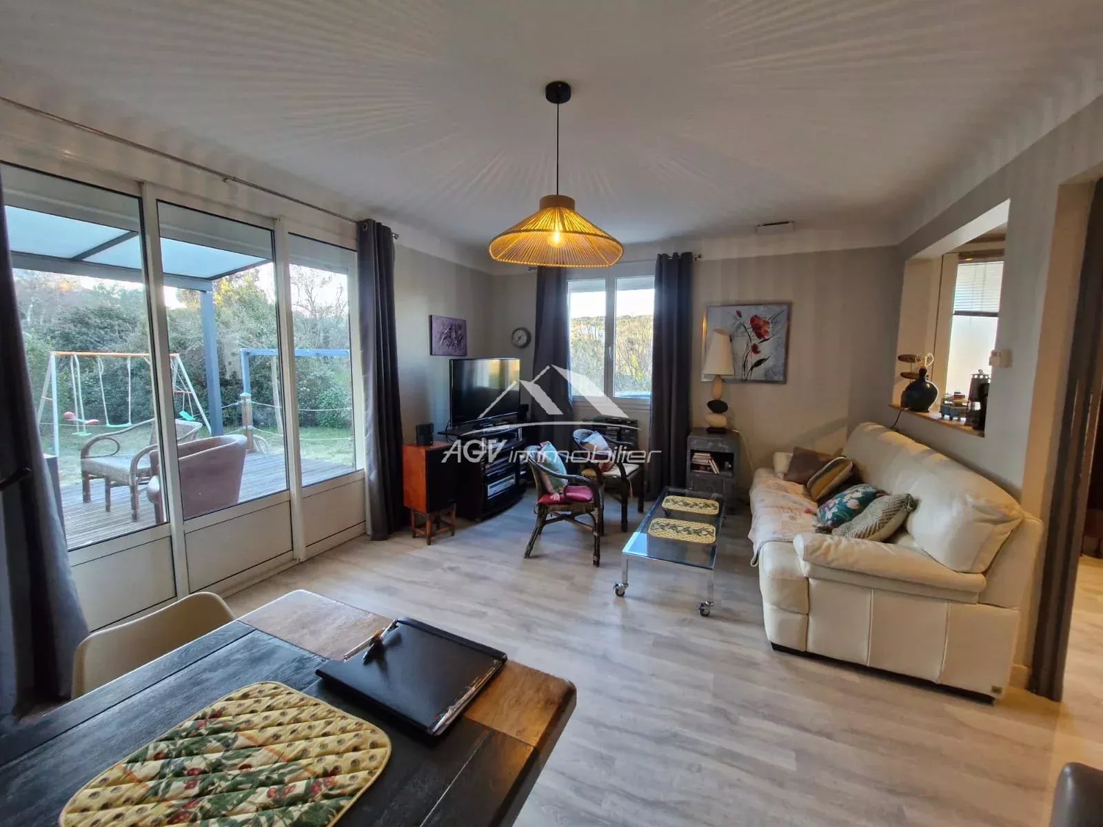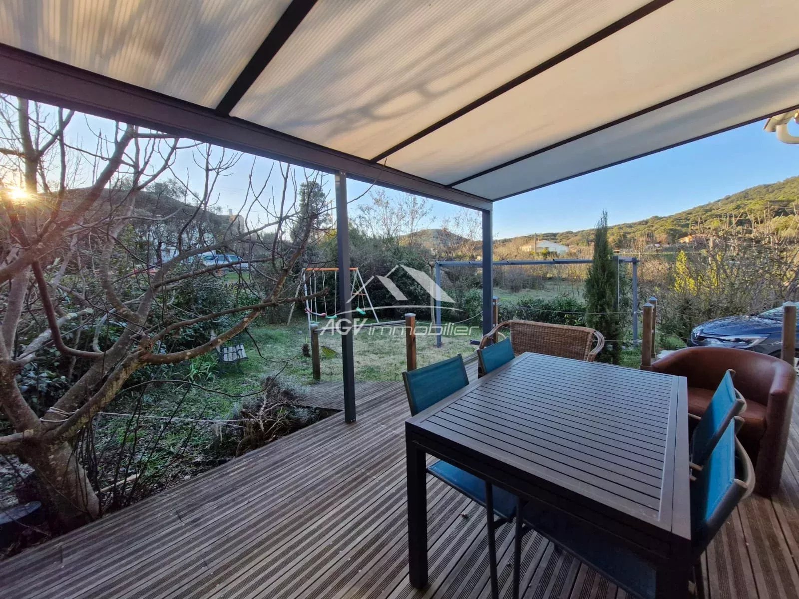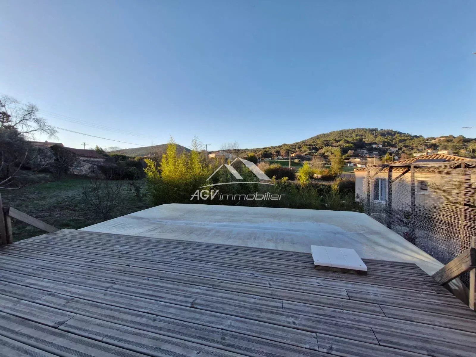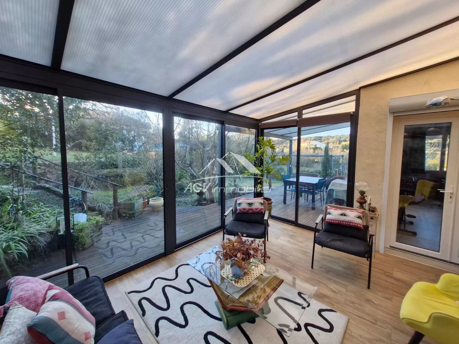 Située au calme dans un environnement verdoyant, maison de plain-pied, rénovée avec goût, se compose d'une entrée, une cuisine, un séjour, une véranda, deux chambres, une salle d'eau et un toilette. La maison dispose d'une piscine hors-sol, une terrasse et un terrain attenant d'environ 1663 m² avec vue panoramique.