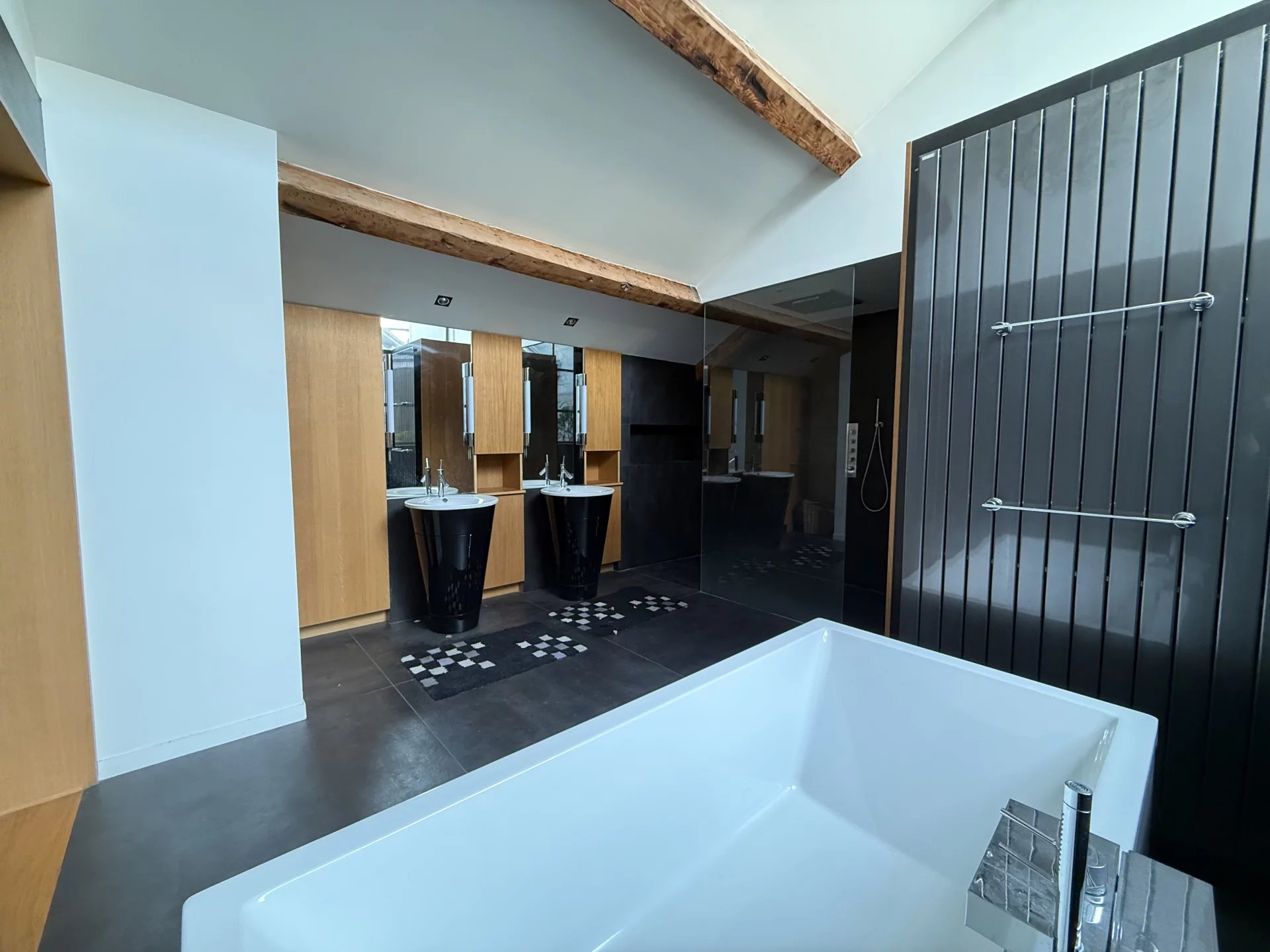 L'espace nuit se compose de deux chambres, chacune disposant de sa propre salle de bain, garantissant confort et intimité ainsi que d'une très grande suite parentale de 19.7m2, dotée de deux dressings indépendants et d'une magnifique salle de bain privative comprenant un wc, une douche et une baignoire.