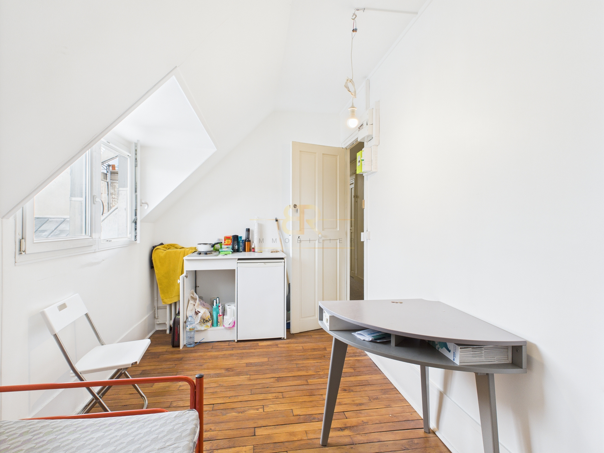 Le bien se trouve au 8e étage avec ascenseur dans un bel immeuble ancien. Il se compose d'une pièce principale optimisée avec une petite kitchenette, idéale pour une location meublée ou un pied-à-terre.