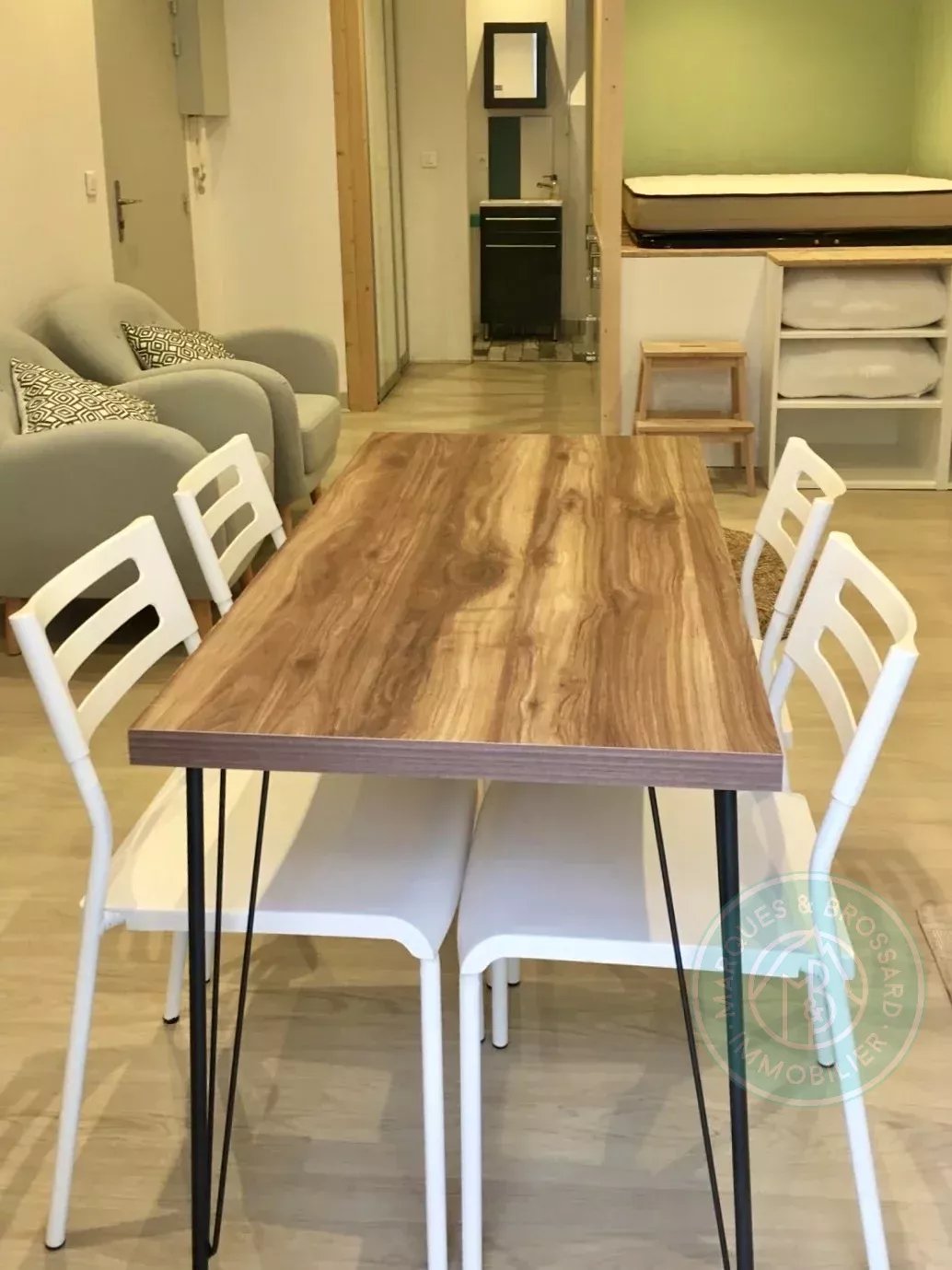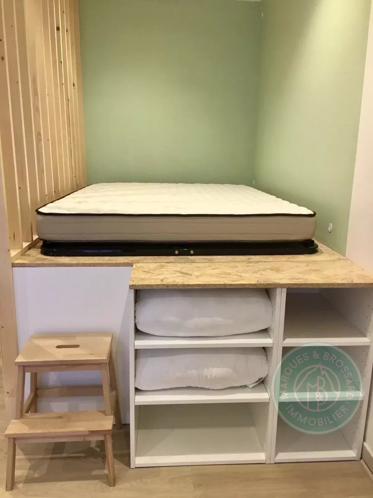 L’appartement se compose d’une pièce de vie chaleureuse, intelligemment agencée avec un coin nuit surélevé, une cuisine ouverte aménagée et équipée,un espace repas ainsi que d’une salle d’eau avec WC.