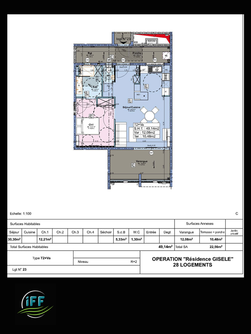 Il se compose d'un séjour avec cuisine aménagée et équipée (plaques et hotte), 1 chambre, une salle d'eau avec double vasque, un wc et une varangue de 12.08m2.