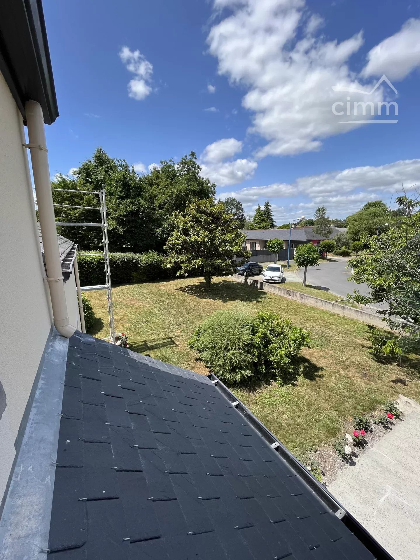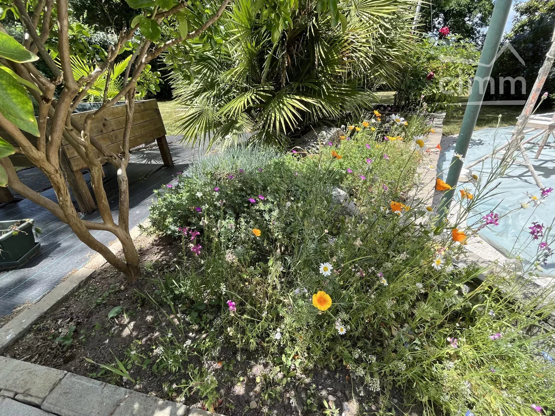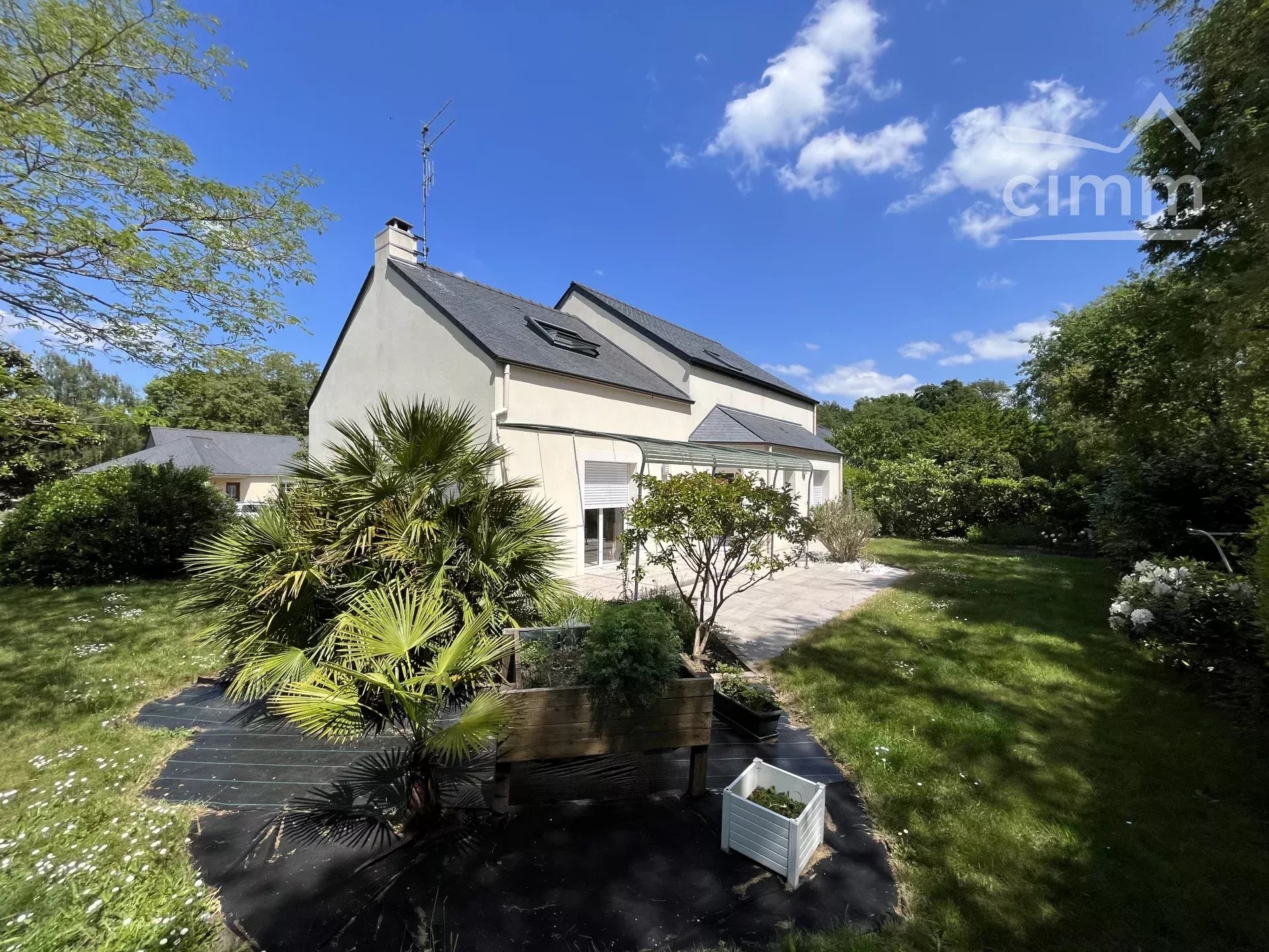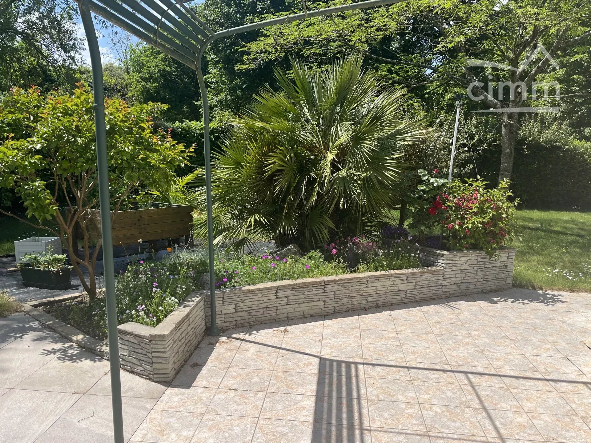 un beau jardin arboré et clos et un espace bitumé au niveau du garage.