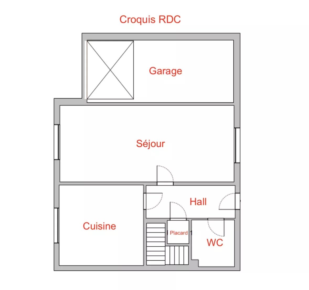 - De plain pied avec accès au jardin : un garage, un hall, une cuisine fermée, un séjour / salle à manger, un WC séparé.