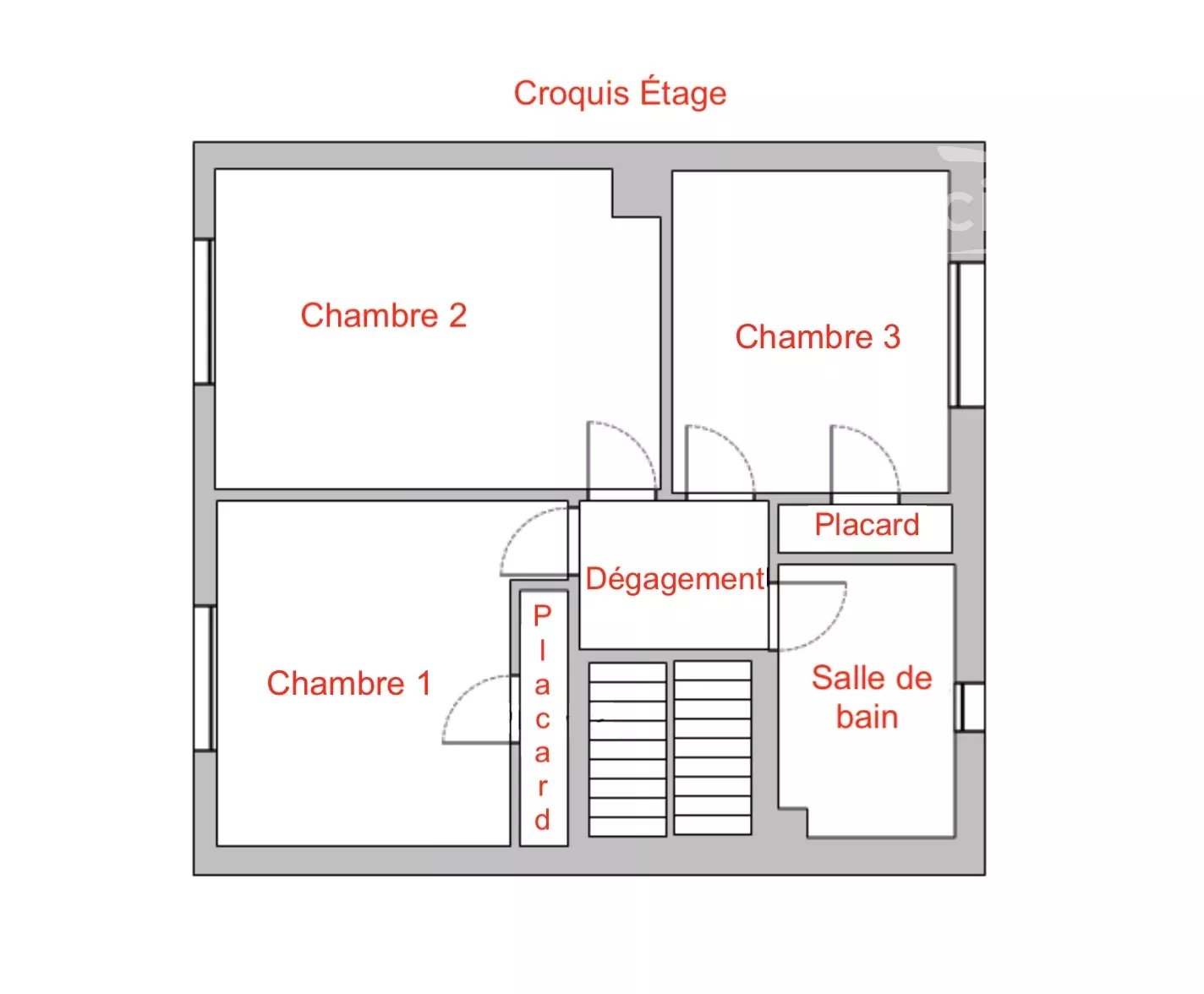 - À l'étage: trois chambres et une salle de bain avec WC.