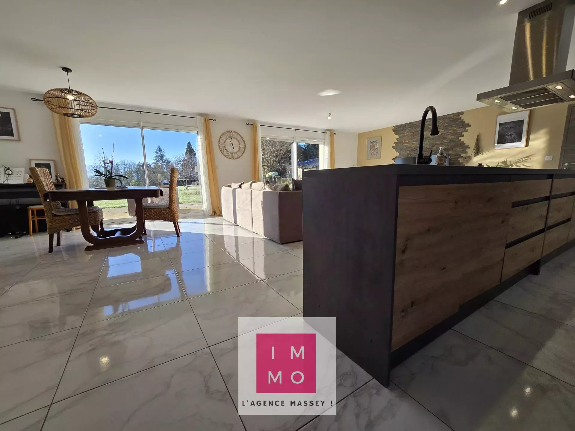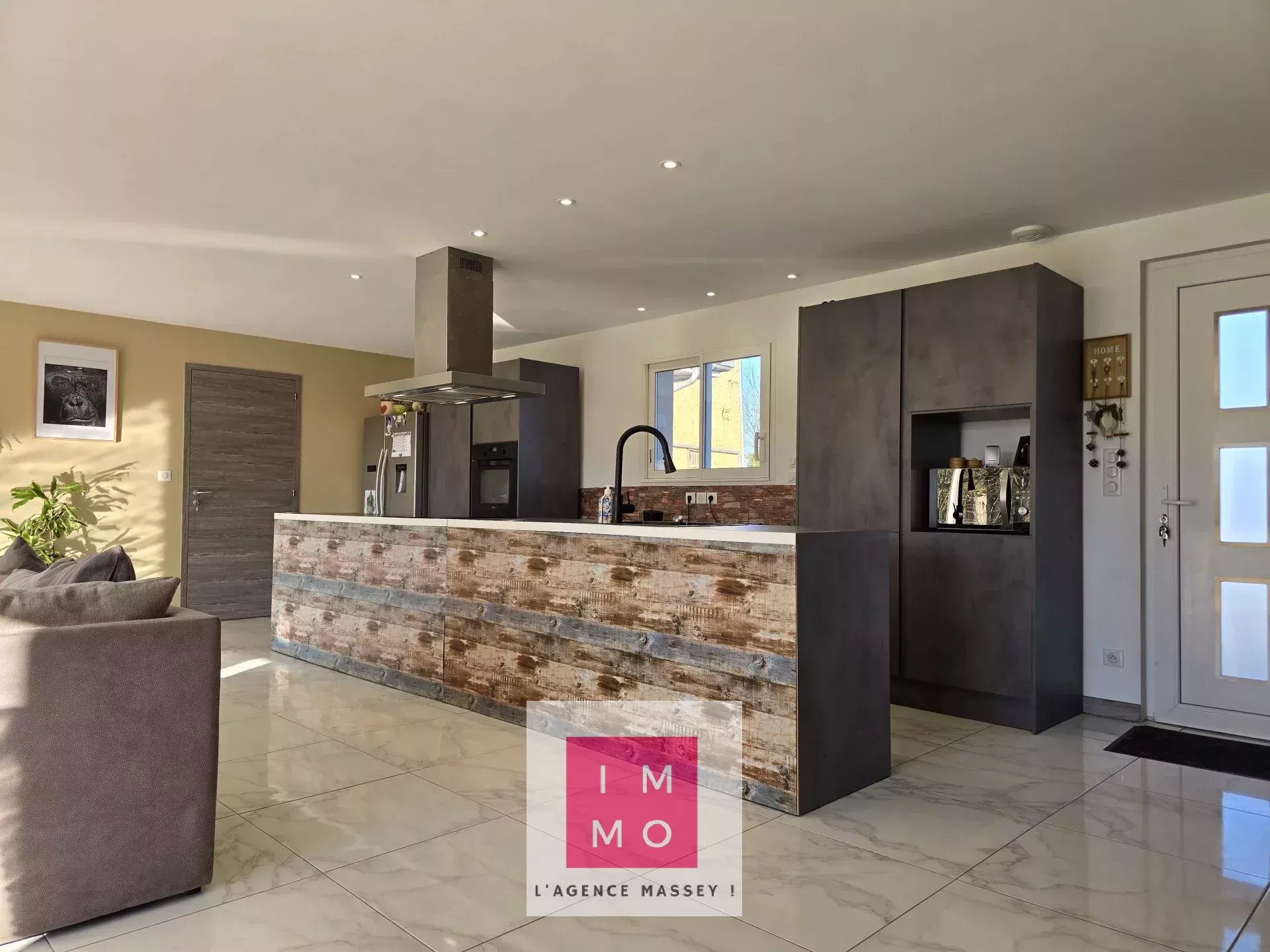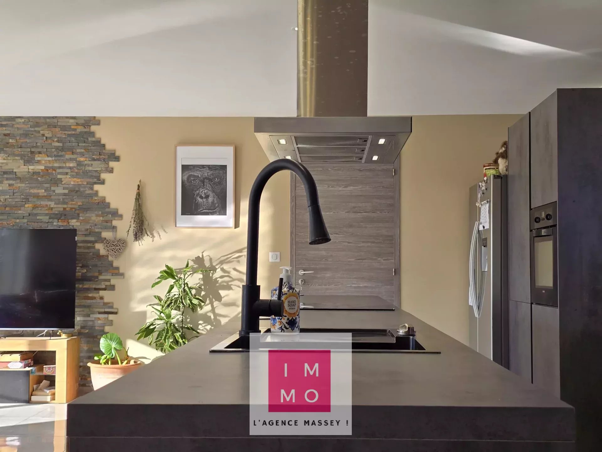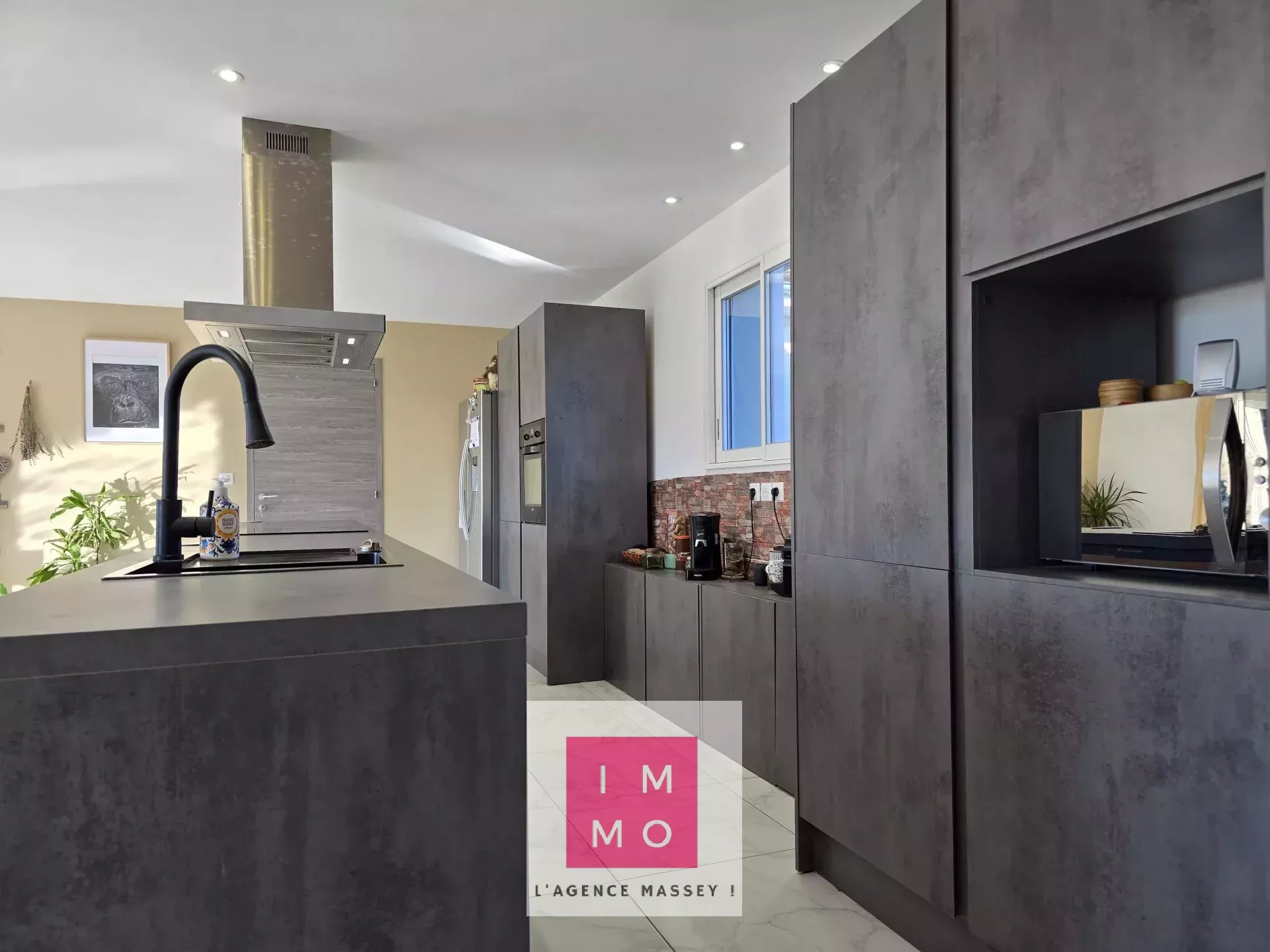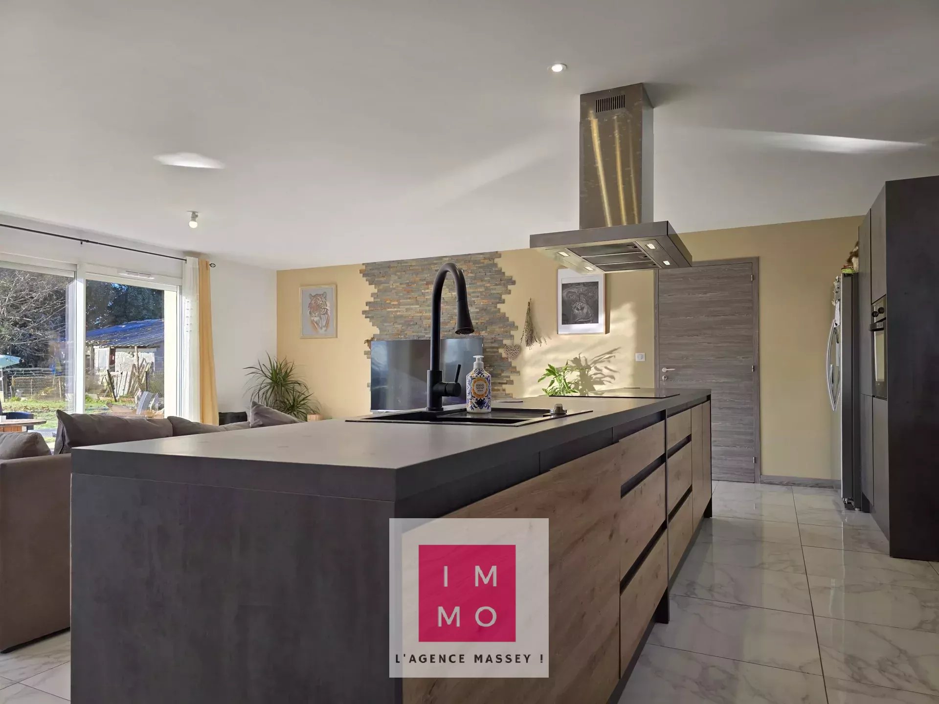 - une belle cuisine équipée, esthétique et fonctionnelle avec un grand îlot central avec blocs cuisson et évier et repas type mange-debout