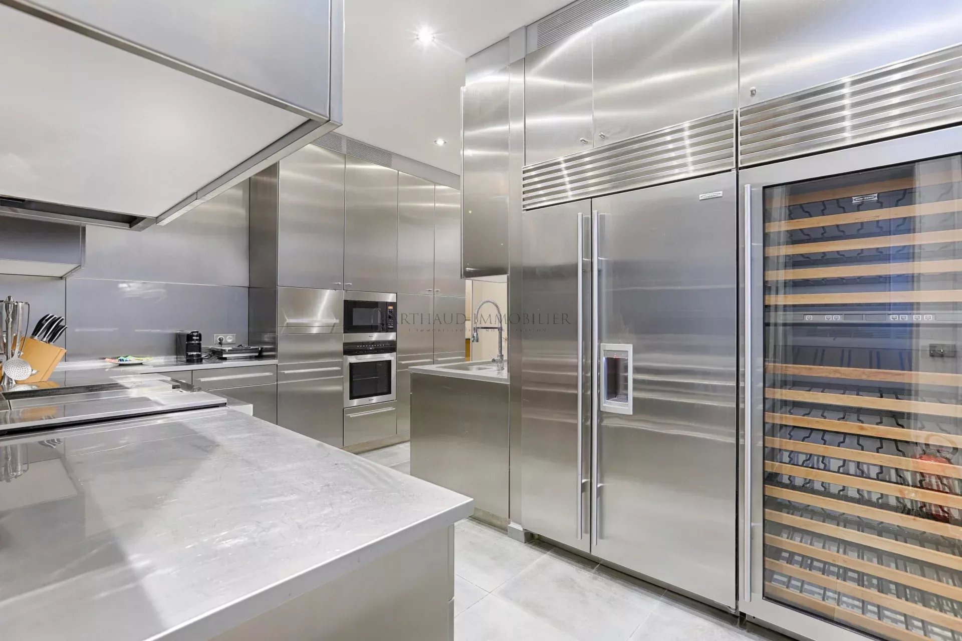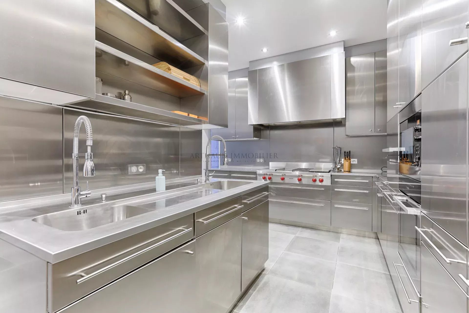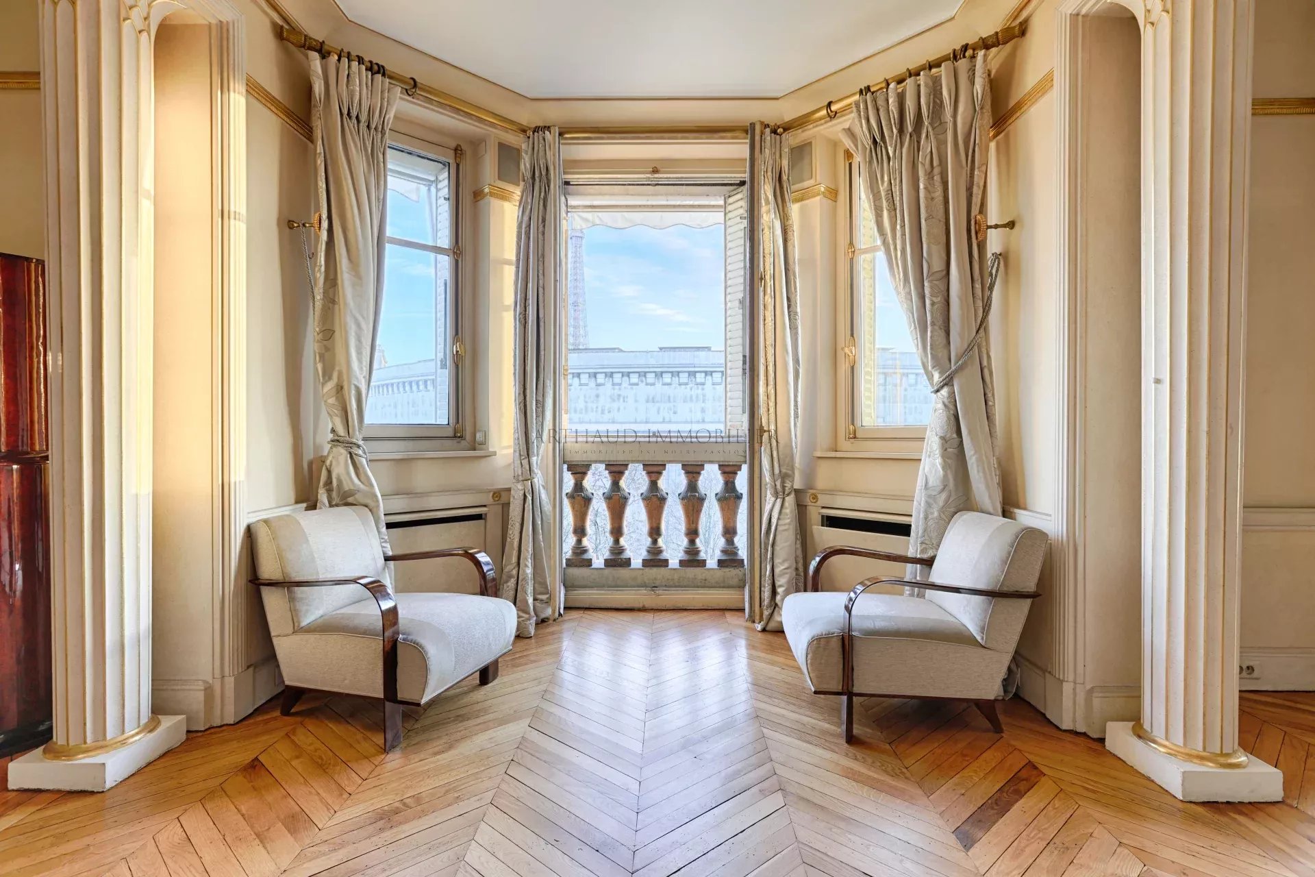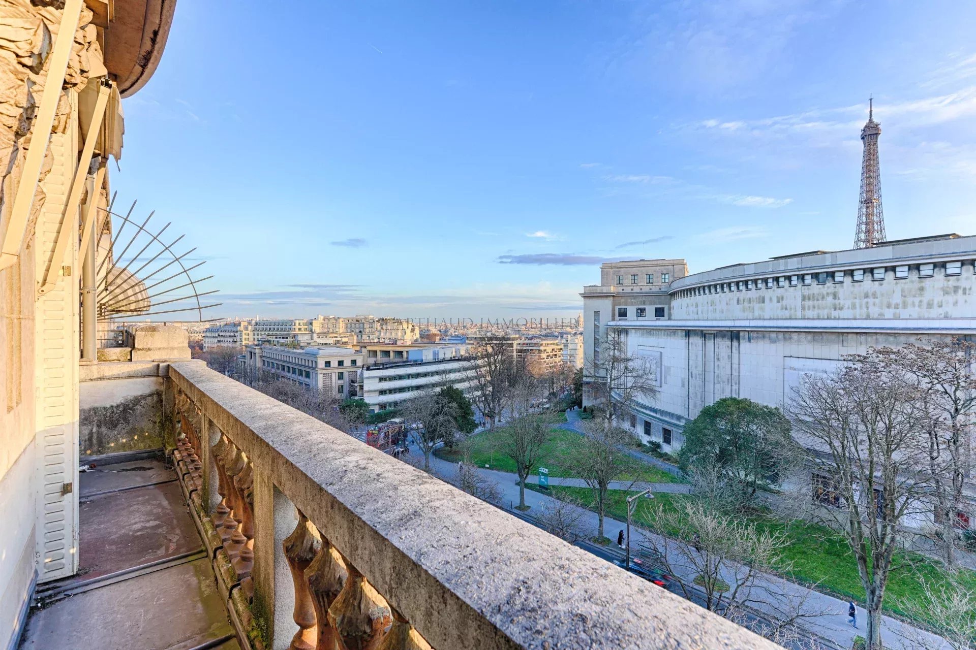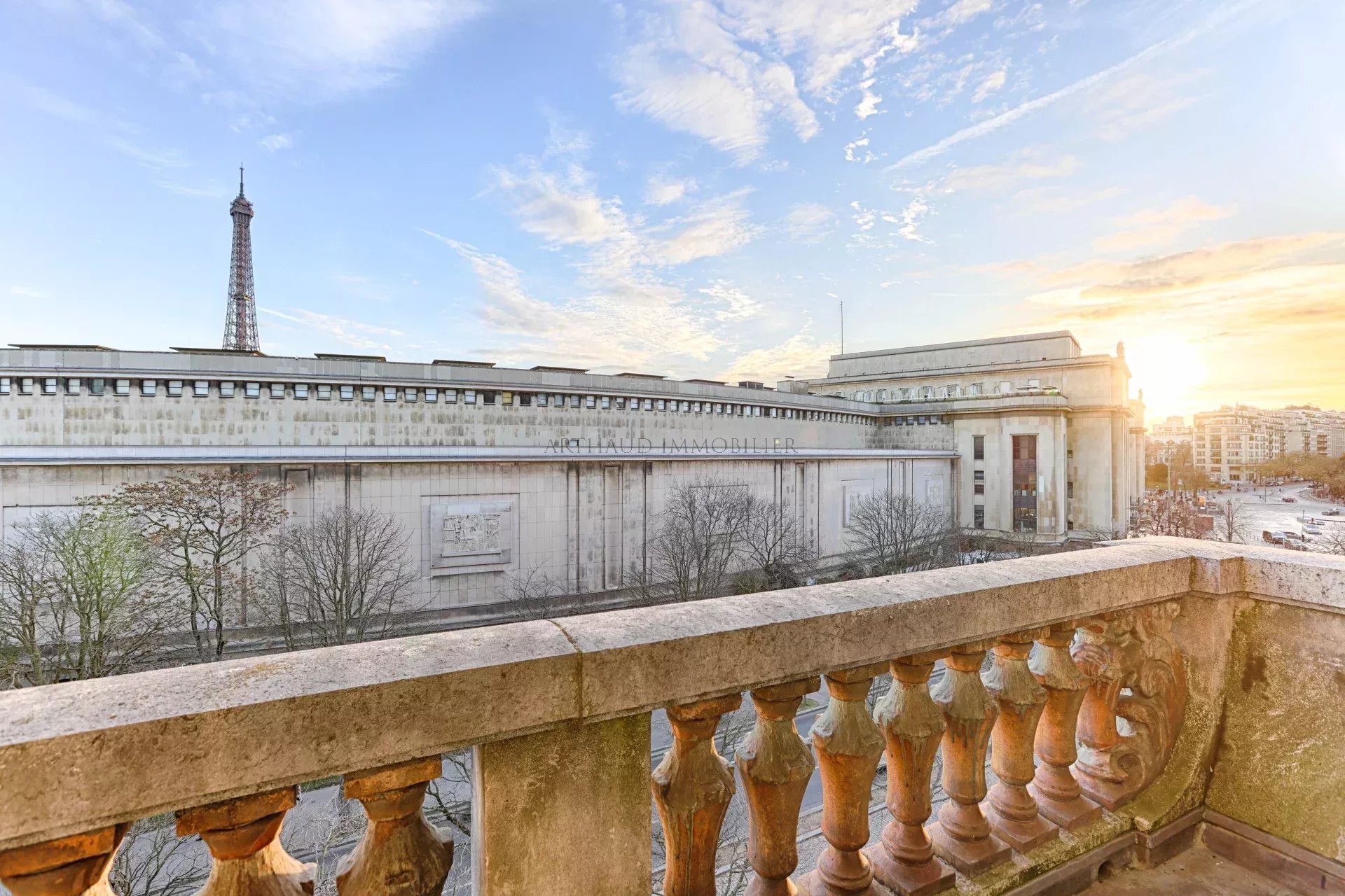 L’entrée s’ouvre sur une galerie majestueuse desservant de vastes espaces de réception : un salon de réception, une élégante salle à manger et un salon TV, l’ensemble prolongé par un balcon filant. Depuis ces pièces de vie, le regard embrasse une vue spectaculaire sur le Palais de Chaillot et la tour Eiffel, offrant un panorama parisien d’une rare élégance.