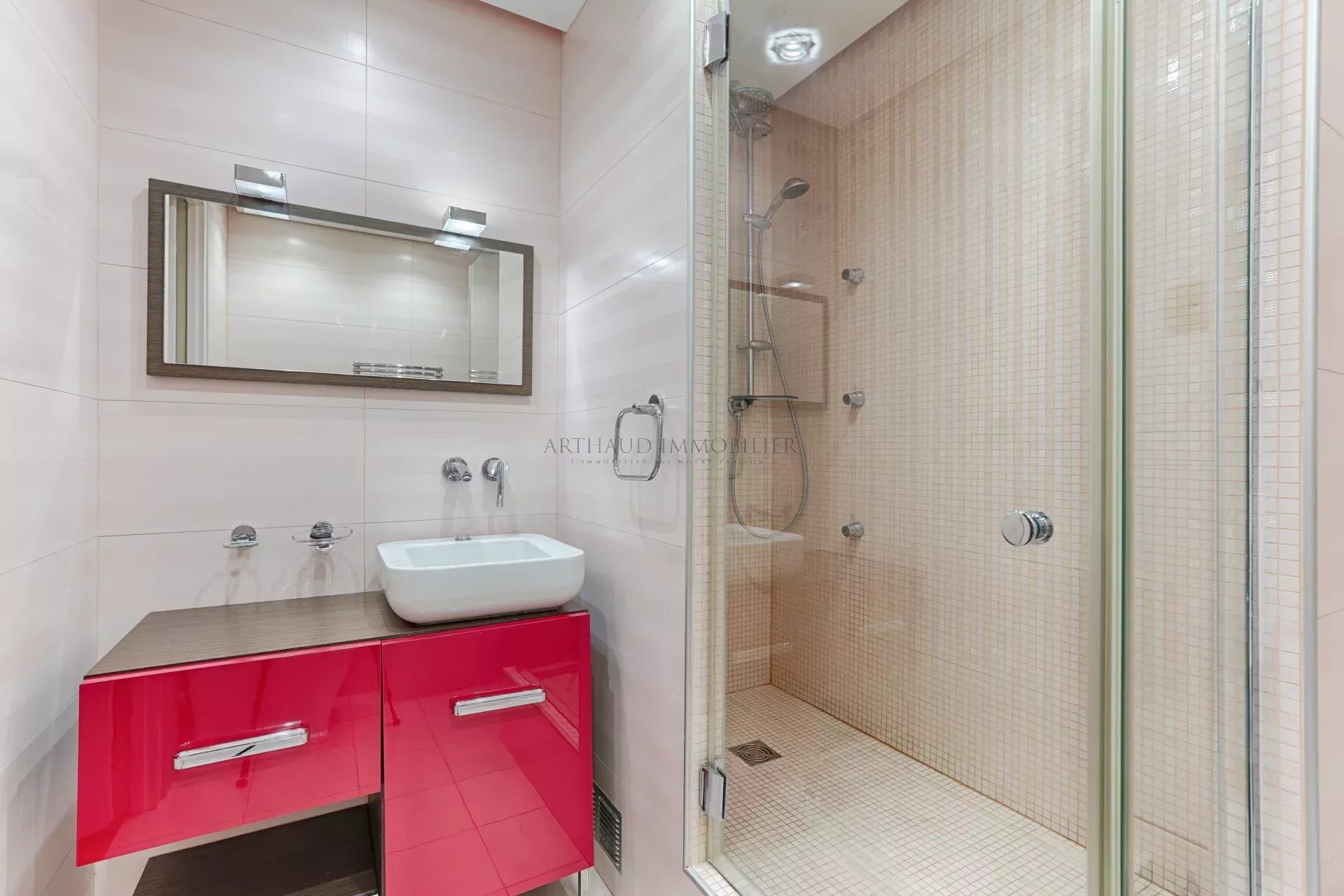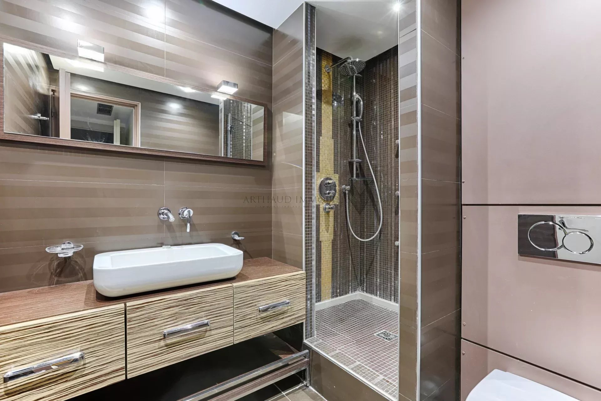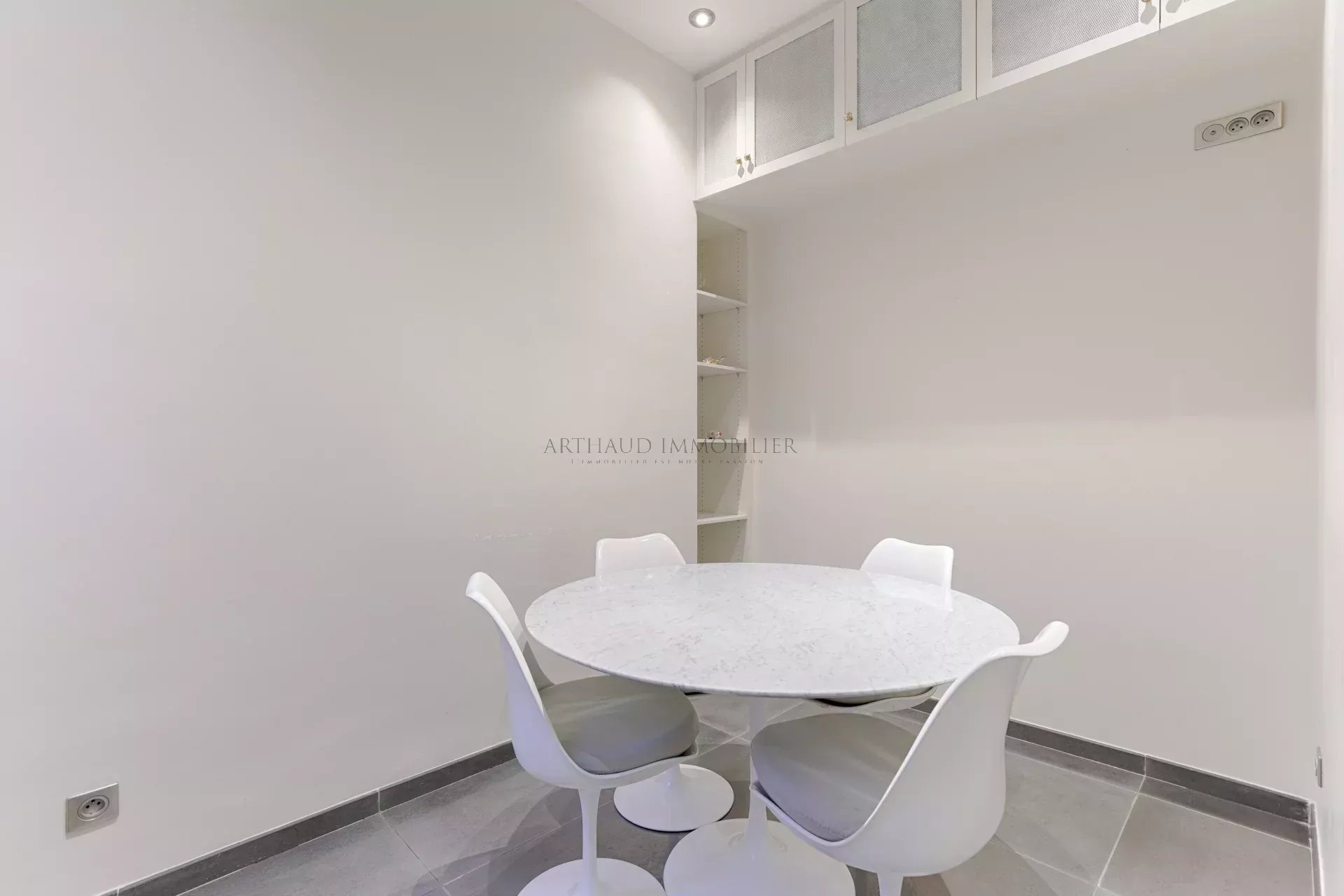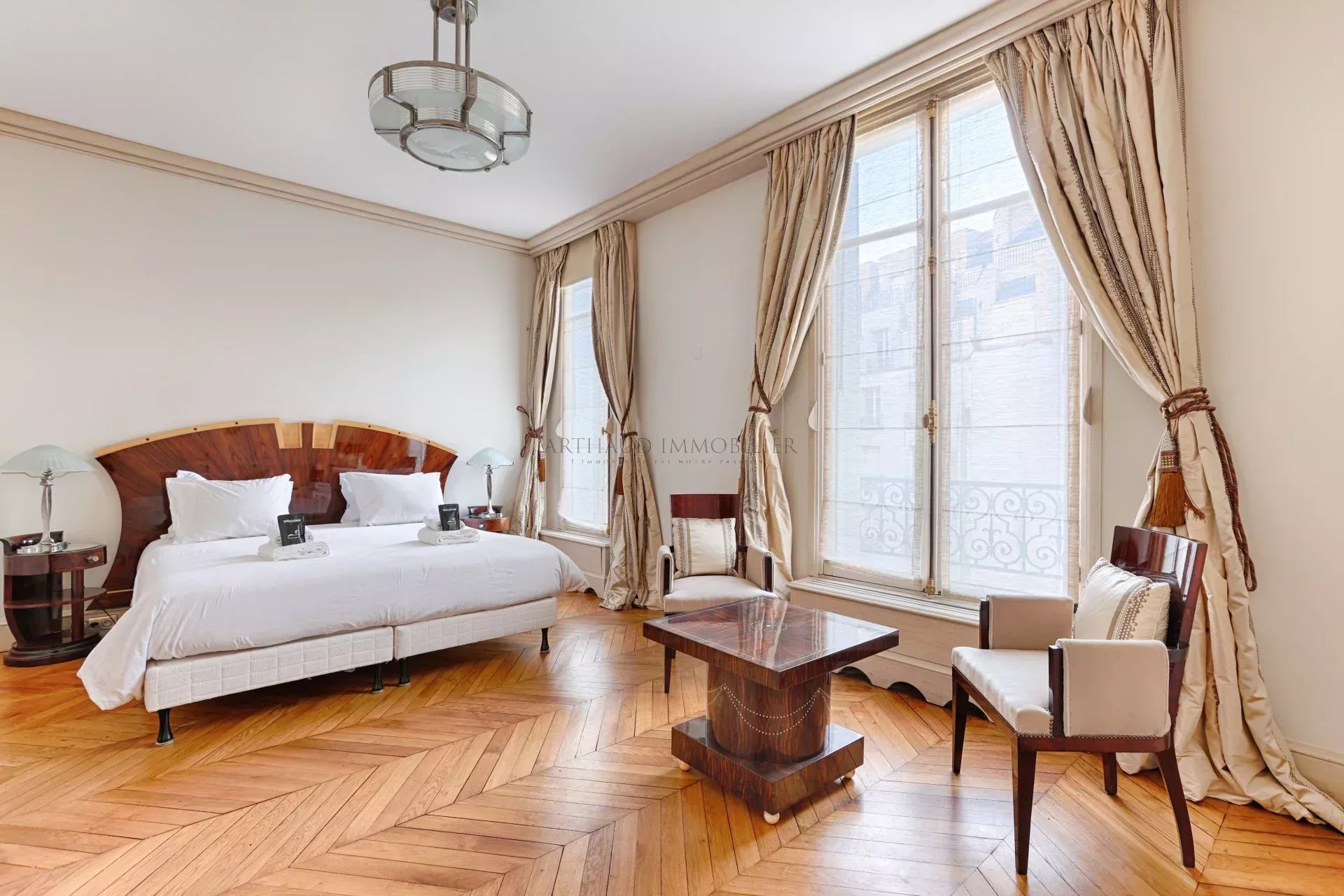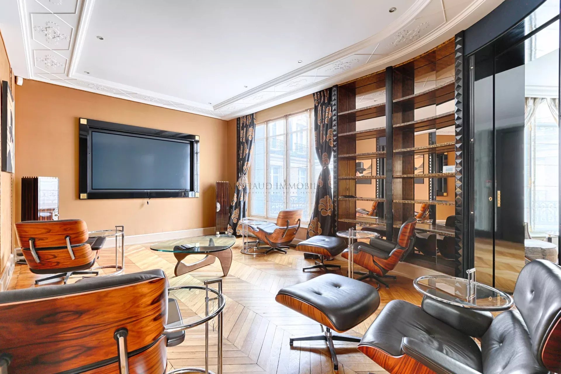 L’entrée s’ouvre sur une galerie majestueuse desservant de vastes espaces de réception : un salon de réception, une élégante salle à manger et un salon TV, l’ensemble prolongé par un balcon filant. Depuis ces pièces de vie, le regard embrasse une vue spectaculaire sur le Palais de Chaillot et la tour Eiffel, offrant un panorama parisien d’une rare élégance.
