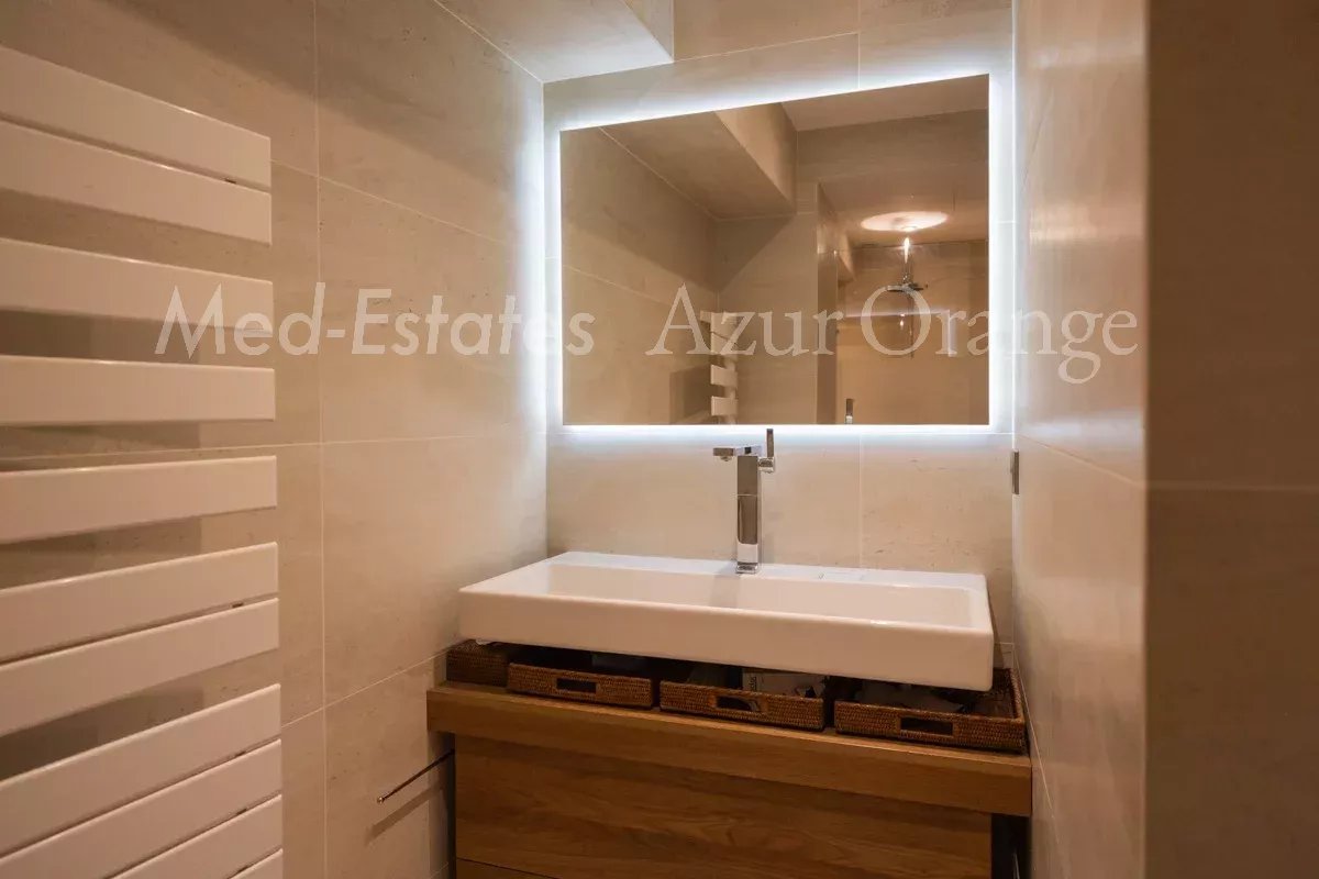 L’extérieur est tout aussi séduisant : à l’avant, une grande terrasse d’environ 50 m² avec vue sur la mer ; à l’arrière, un jardin privatif exposé plein sud d’environ 200 m² avec cuisine barbecue et accès direct à un jardin commun paysager avec piscine. La piscine chauffée de 12 × 4 m, équipée d’un volet roulant automatique, permet de profiter de la baignade toute l’année. Deux caves en sous-sol et quatre places de parking (droit d’usage) complètent ce bien d’exception.