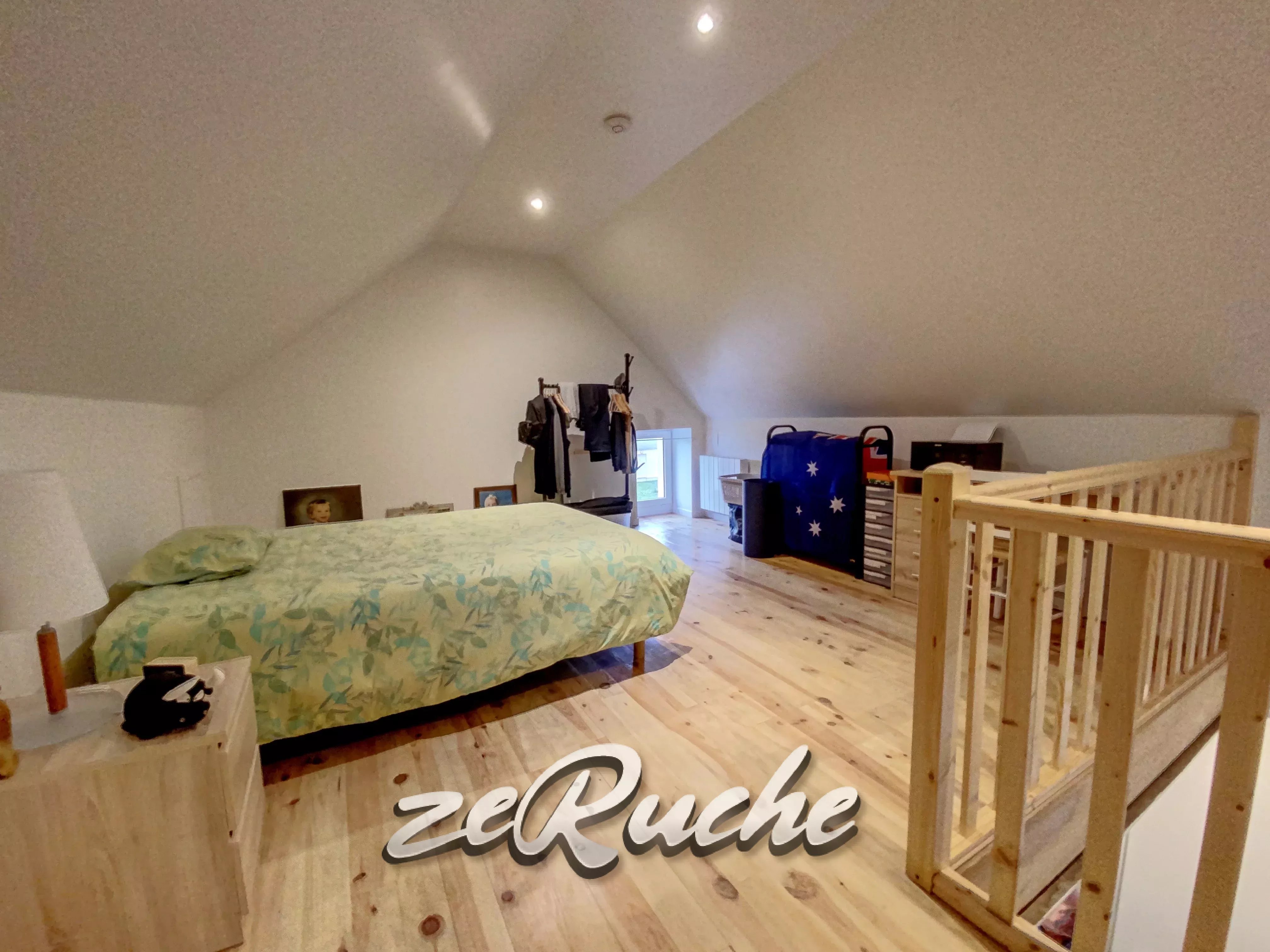 À l’étage, vous découvrirez une grande chambre sous combles, apportant charme et confort.