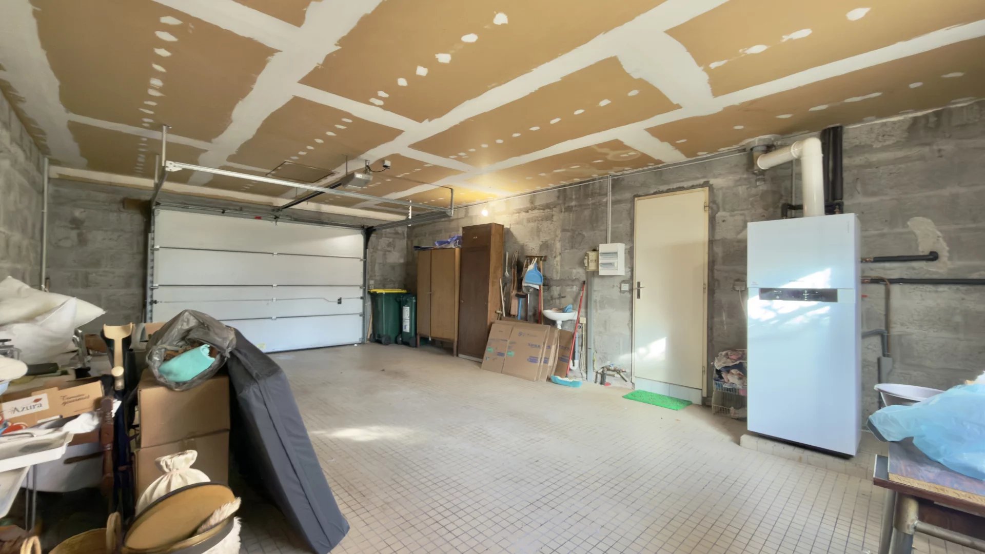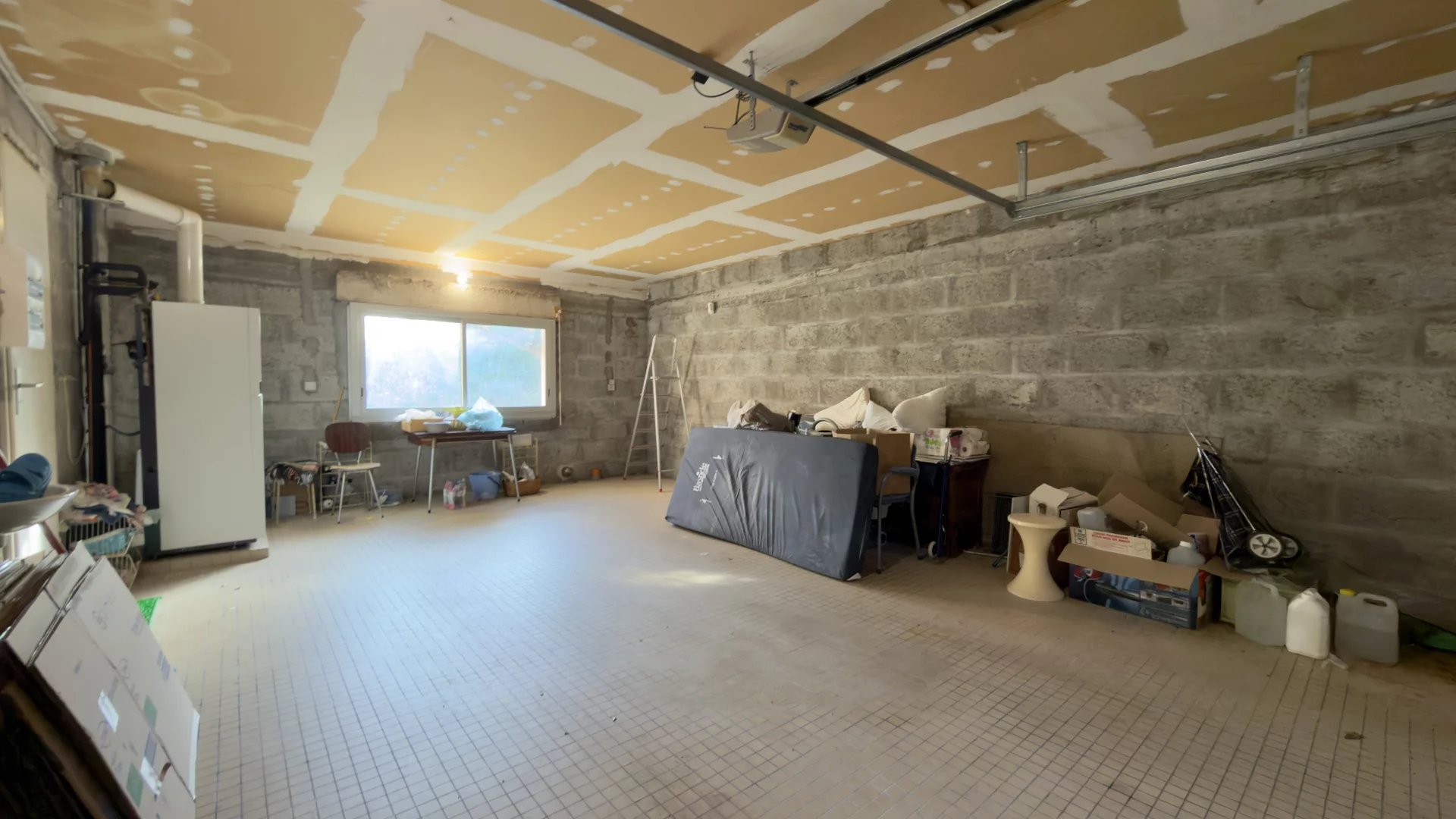 Rez-de-chaussée : entrée avec escalier, séjour lumineux avec cheminée, cuisine indépendante aménagée, deux chambres, salle d’eau, WC séparé, garage carrelé avec porte motorisée et espace buanderie (chauffage gaz de ville).