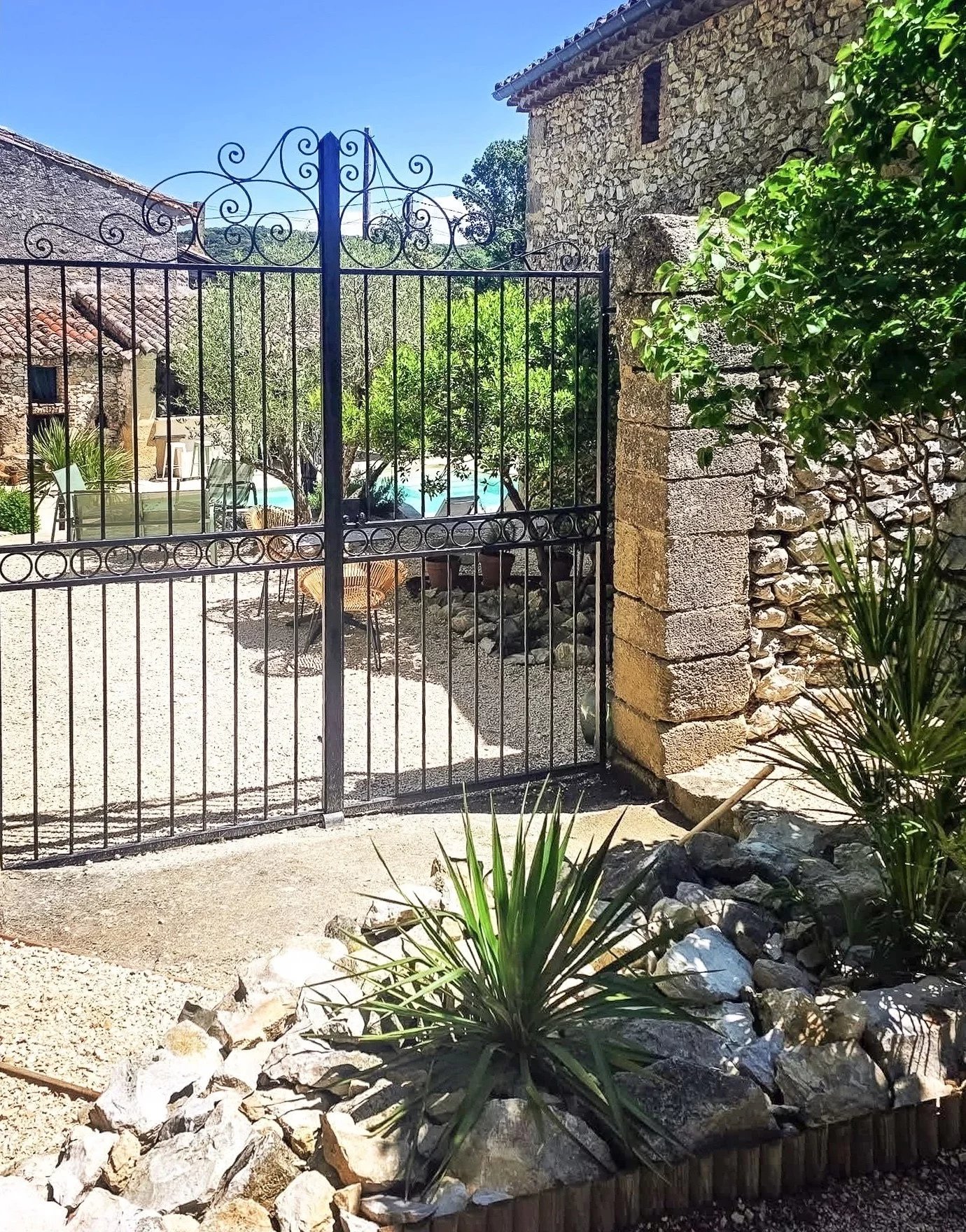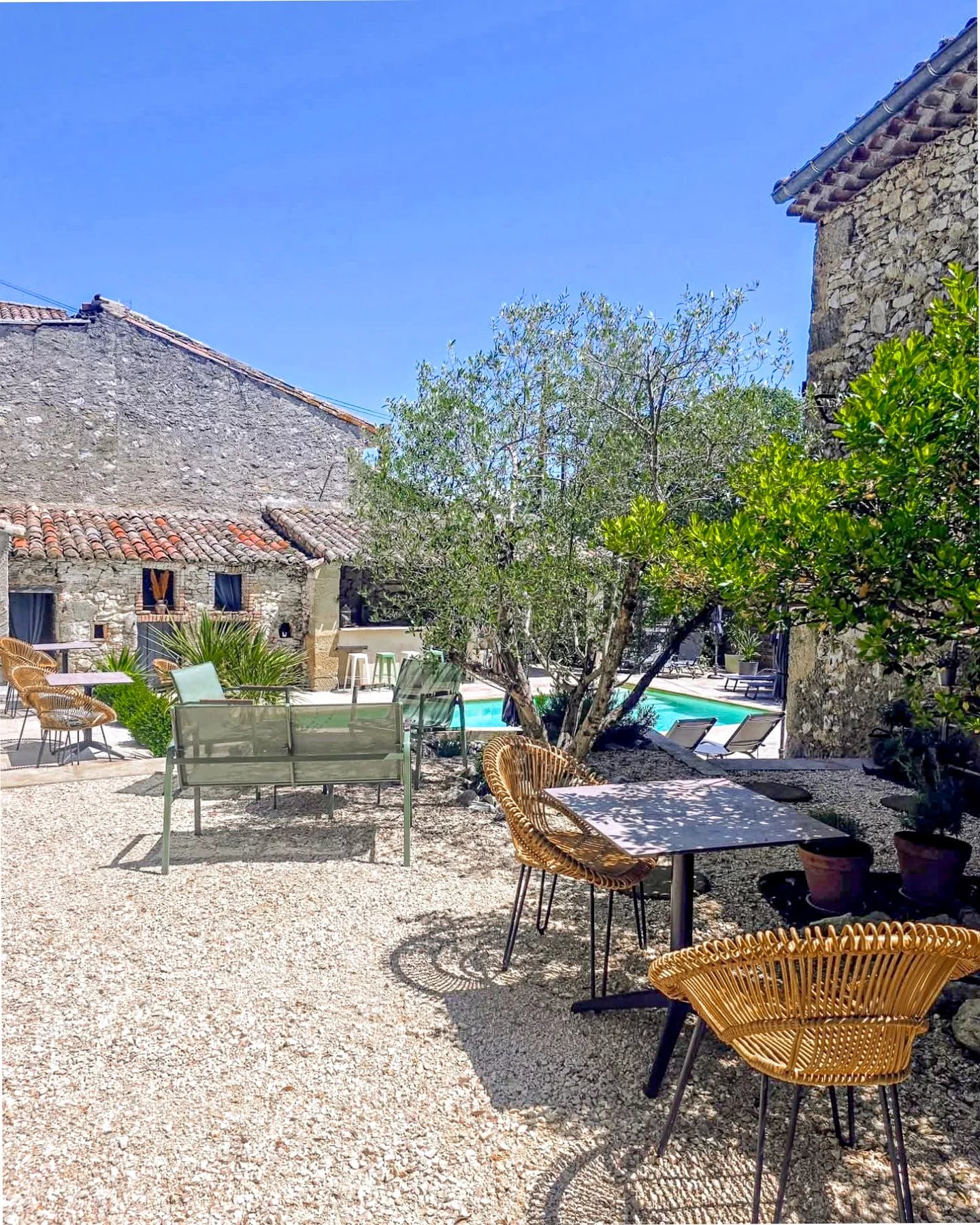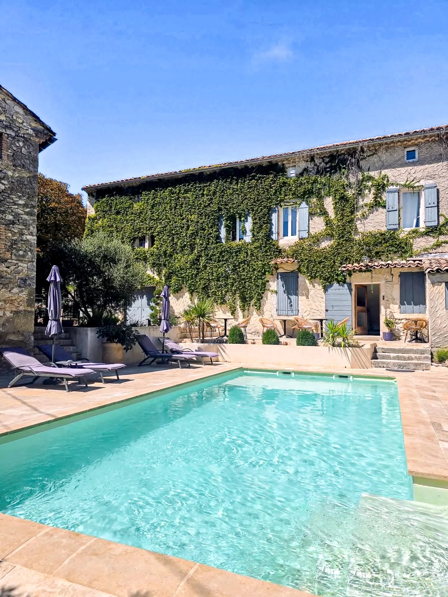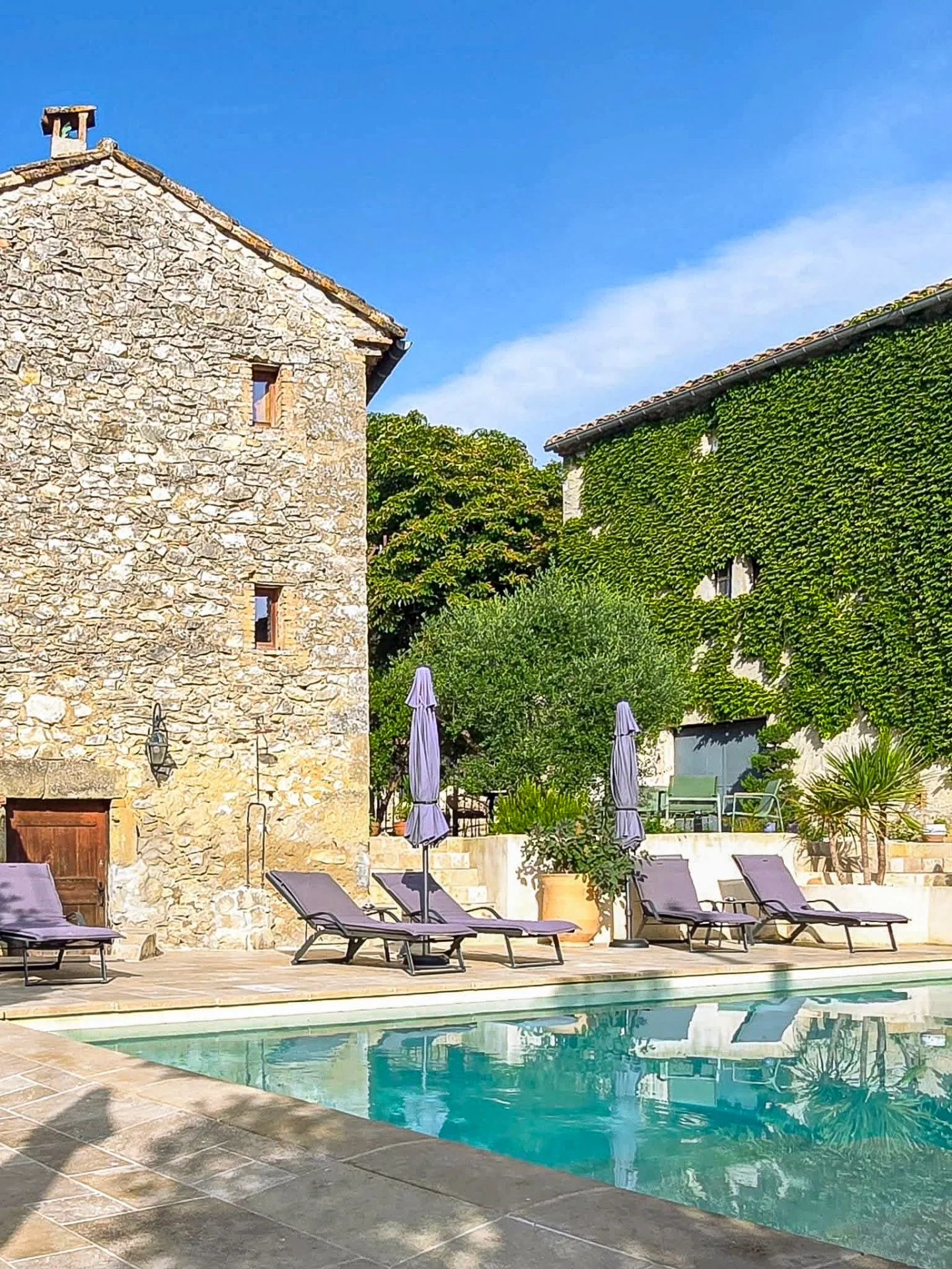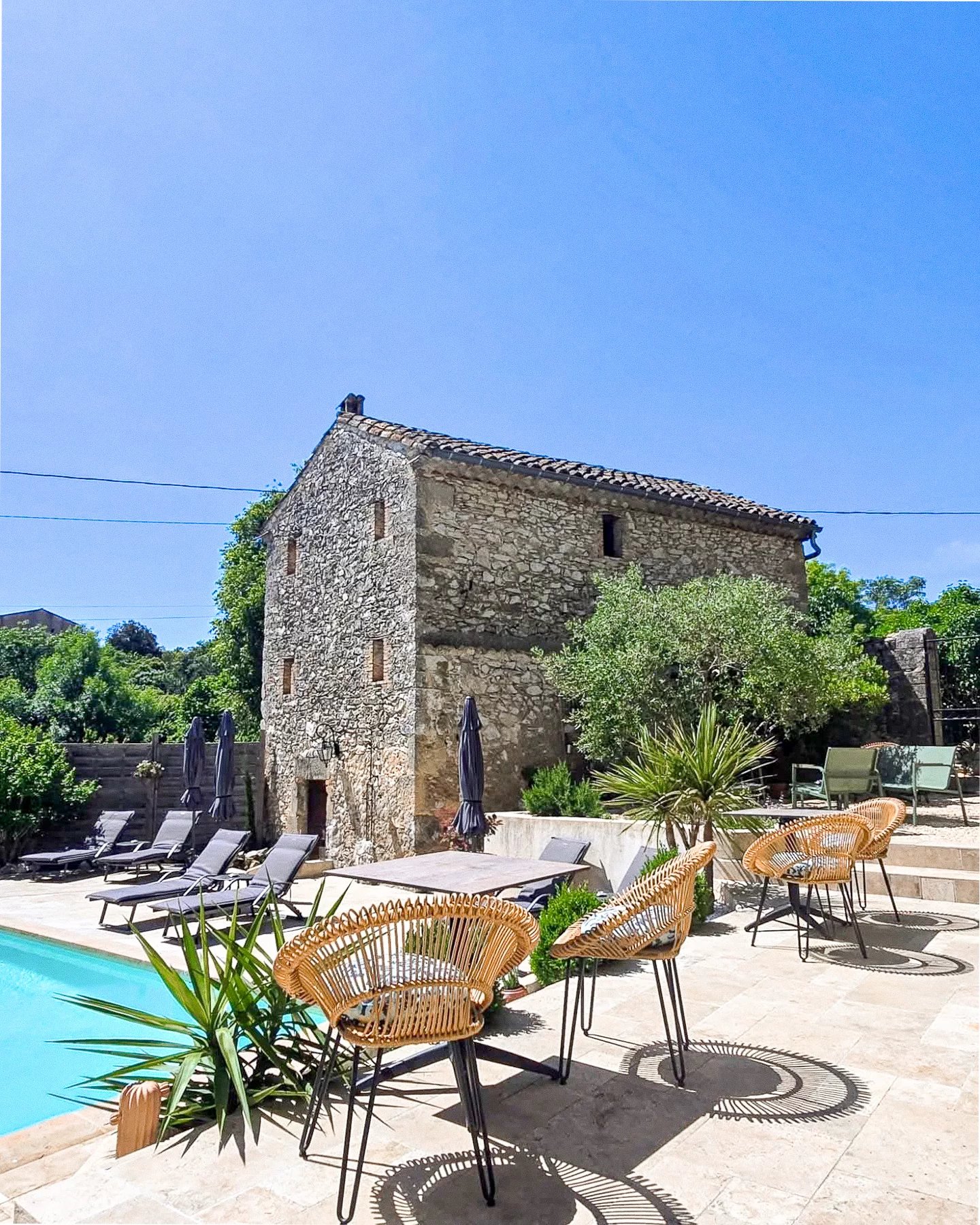 Mas en pierre rénové avec dépendances 5 chambres avec salles de bains privatives Bel espace extérieur avec terrasse, piscine et cuisine d’été Situé à 18 km d’Uzès dans un hameau authentique