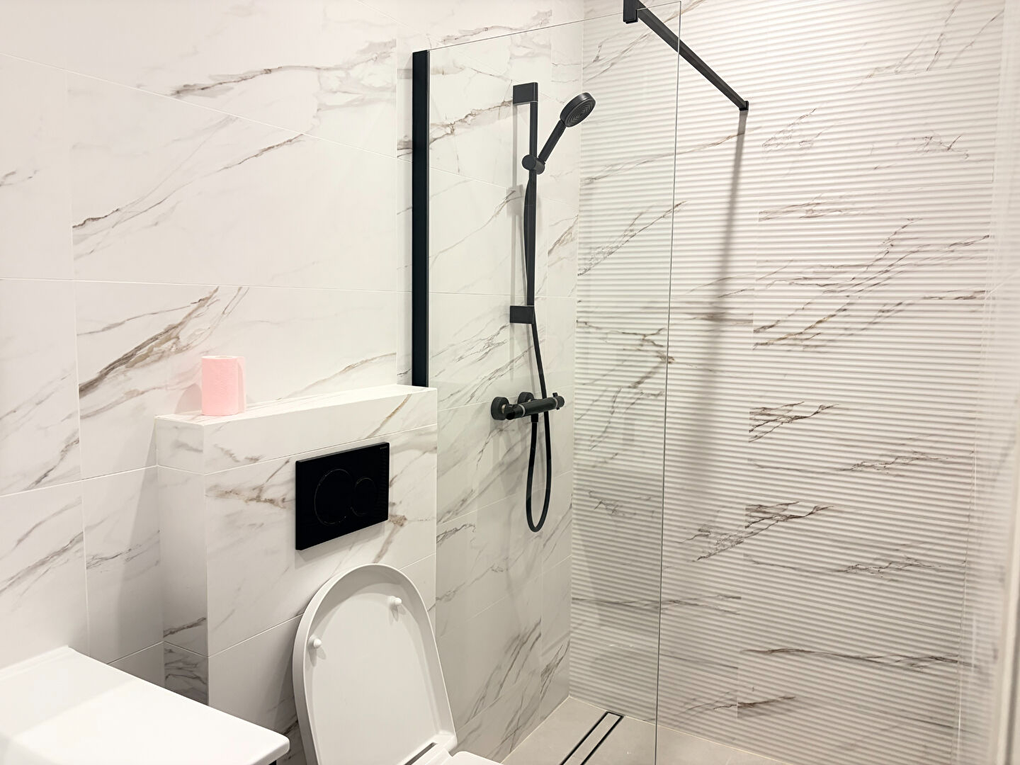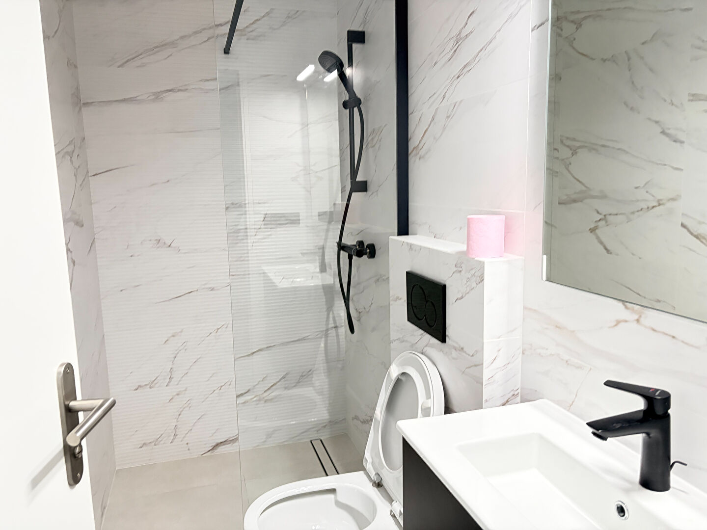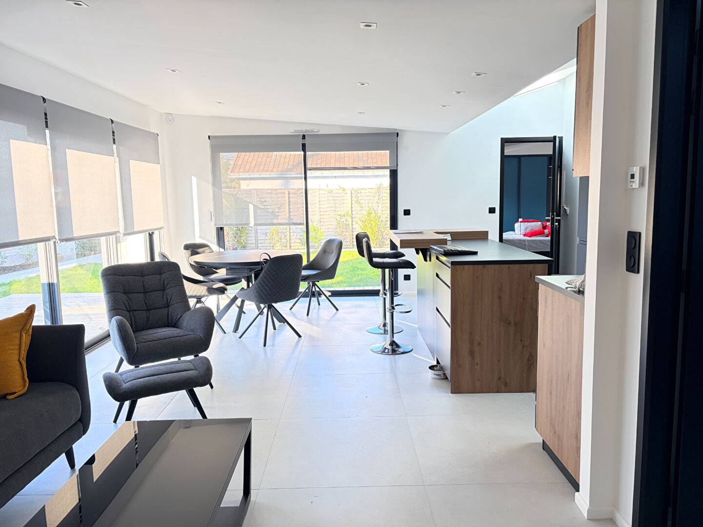Location à l'année MEUBLEE - Proche gare et Lycée Grand Air, dans une impasse, maison neuve de plain-pied sur un terrain clos de 248 m², comprenant : entrée avec placard, pièce de vie avec cuisine aménagée équipée ouverte, trois chambres avec placard avec leur salle d'eau-WC privative dont une donnant sur terrasse. Volets roulants électriques, chauffage par le sol. Belles prestations, terrasse, cabanon, 2 places extérieures.
