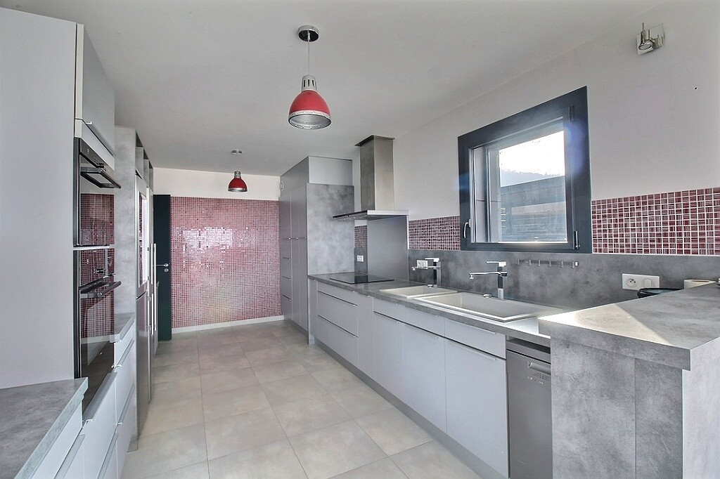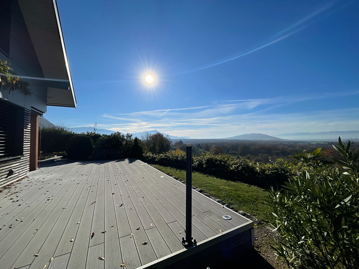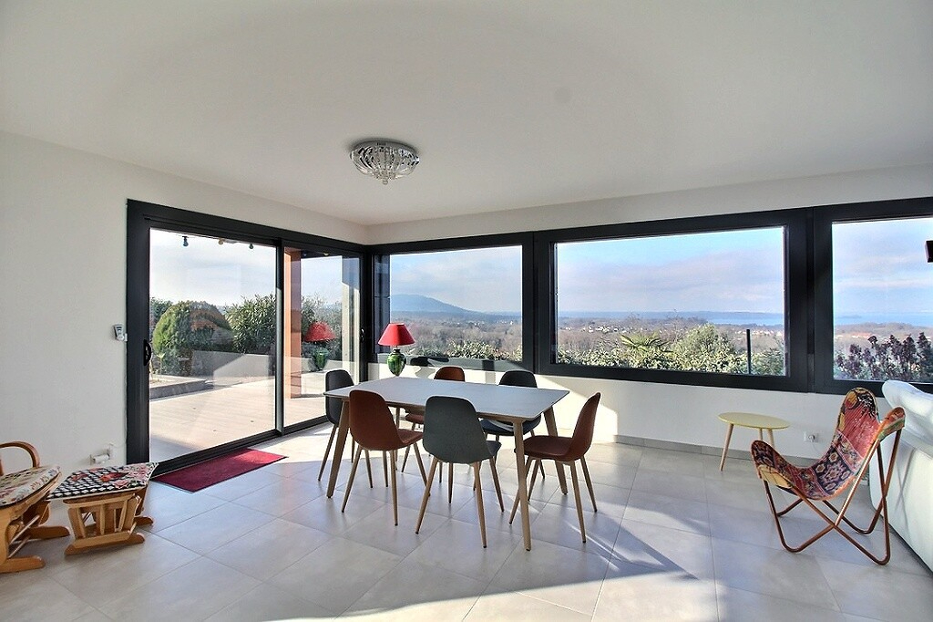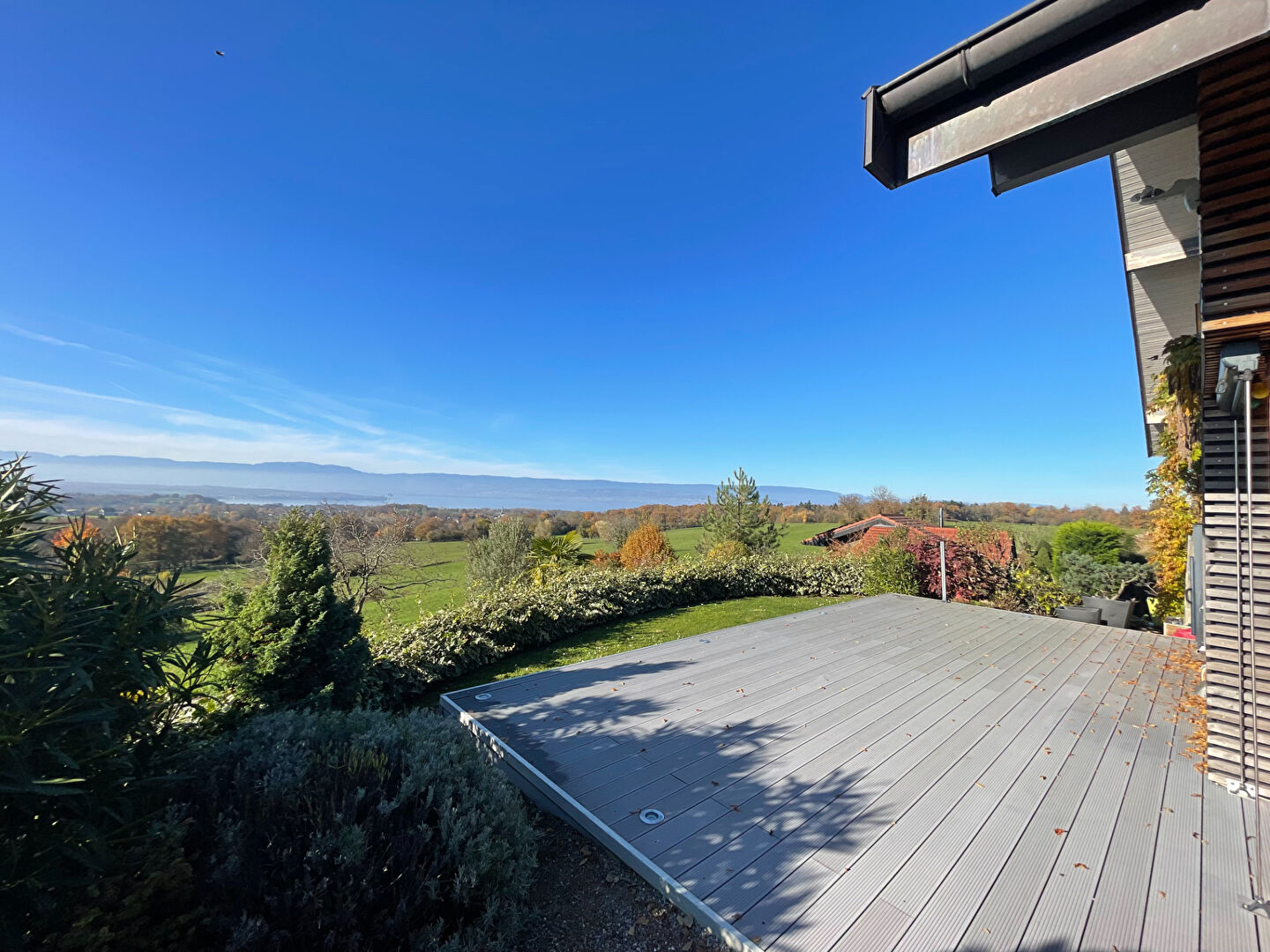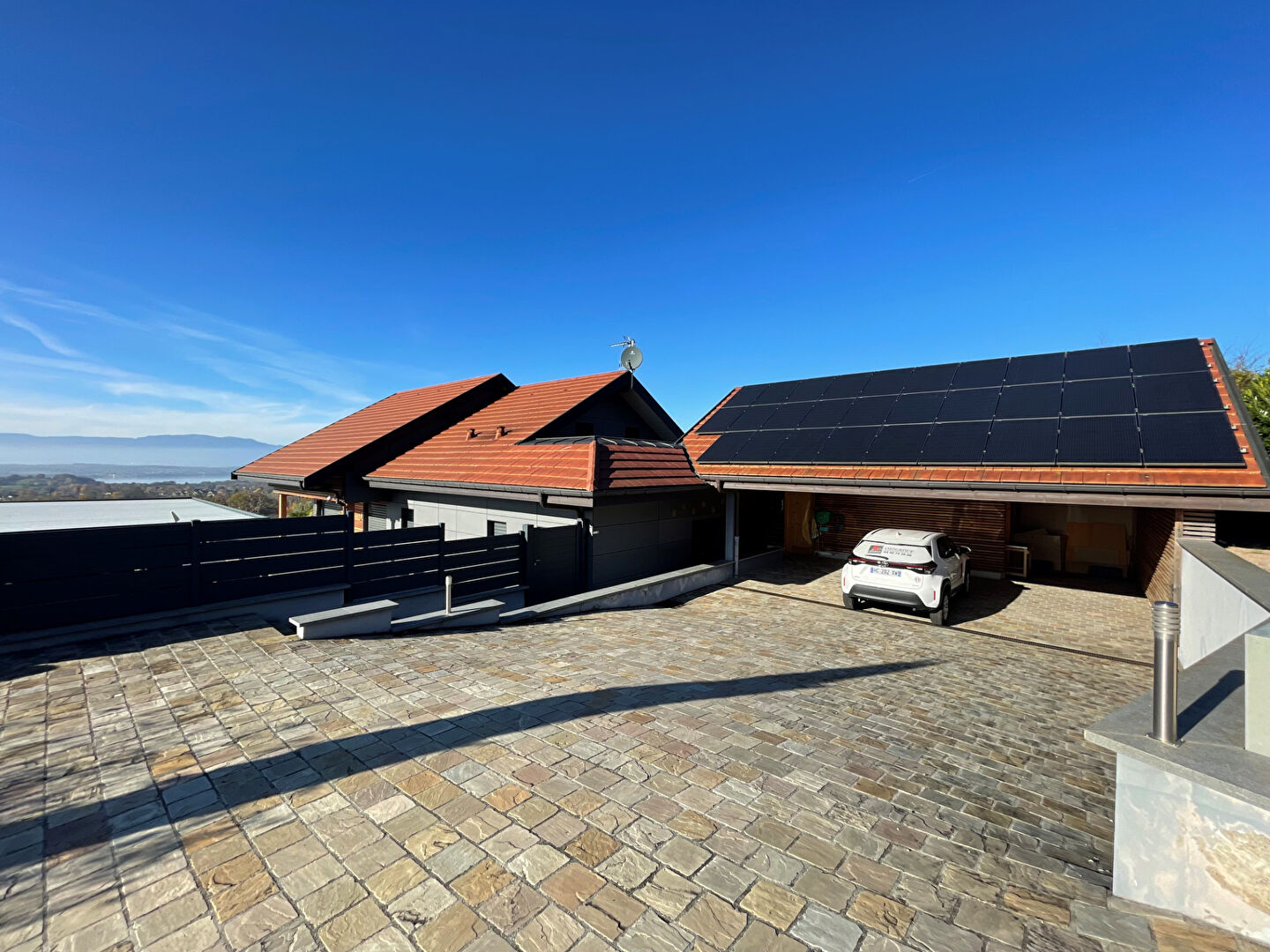 Maison d'architecte d'exception avec vue panoramique sur le lac Léman. Nichée au calme, dans un environnement privilégié, cette somptueuse maison d'architecte vous séduira par ses prestations haut de gamme et sa vue imprenable sur le lac Léman depuis le salon et ses terrasses. Offrant 202 m² habitables (pour 327 m² utiles), cette propriété baignée de lumière propose de vastes volumes et une circulation fluide, idéale pour une vie de famille confortable et agréable. Vous bénéficierez également d'un système de chauffage performant, avec l'installation d'une pompe à chaleur et de panneaux photovoltaïques permettant ainsi une économie notable d'énergie. Elle se compose d'une pièce de vie de 65 m² avec une cuisine totalement équipée et aménagée ouverte sur le salon-séjour donnant accès à une terrasse face au lac, offrant un panorama exceptionnel en toute saison. La maison comprend 5 chambres, dont une belle suite parentale de plain-pied, avec salle d'eau attenante, ainsi qu'un bureau, une buanderie, un dressing, une deuxième salle de bains avec douche et wc, et de nombreux espaces de rangement. Le sous-sol complet de 100 m², entièrement aménagé, offre de nombreuses possibilités : salle de sport, salle de jeux, home cinéma, cave, tout a été pensé pour le confort et la fonctionnalité. A l'extérieur, le charme opère tout autant : deux grandes terrasses, un joli bassin d'ornement, une double pergola bioclimatique avec spa de nage à contre-courant/jacuzzi, un grand car-port pour 3 véhicules, un atelier/local de rangement, et un magnifique jardin arboré entretenu par un paysagiste vous offrent un cadre de vie rare et apaisant.