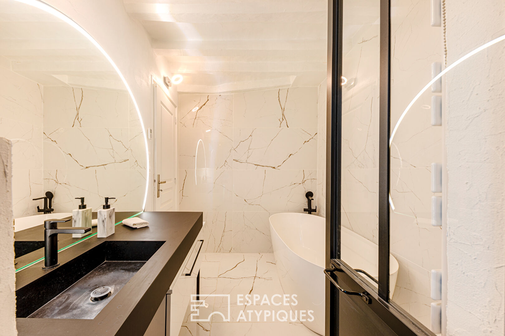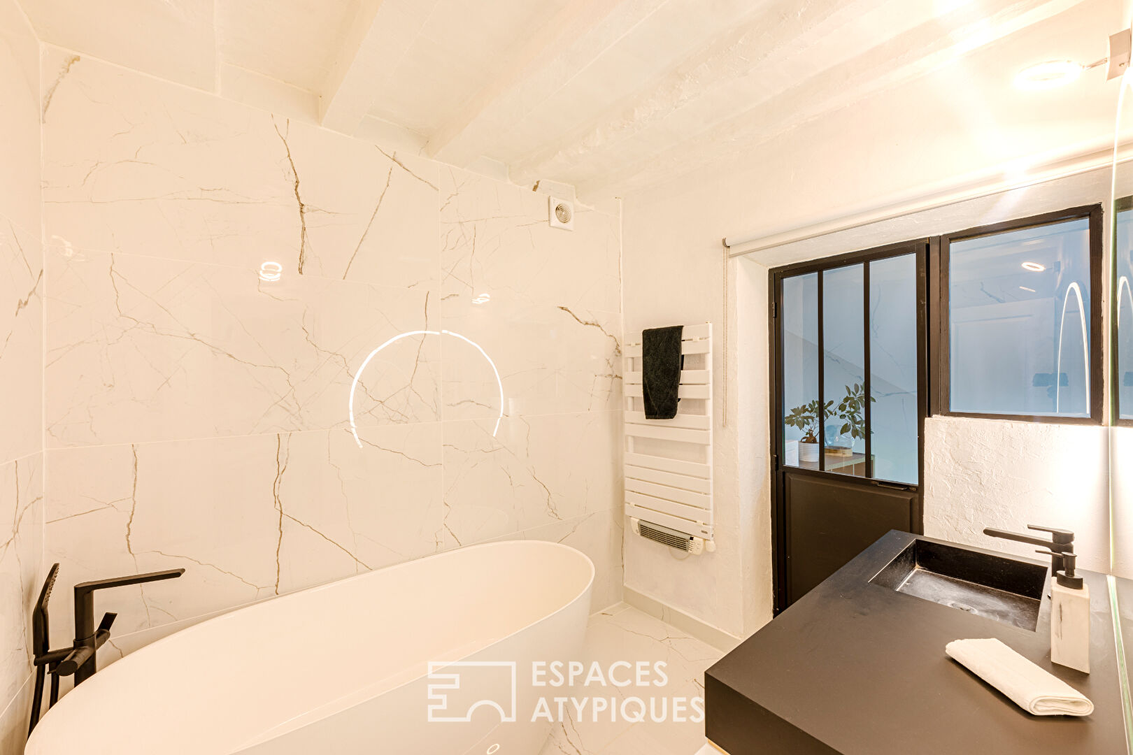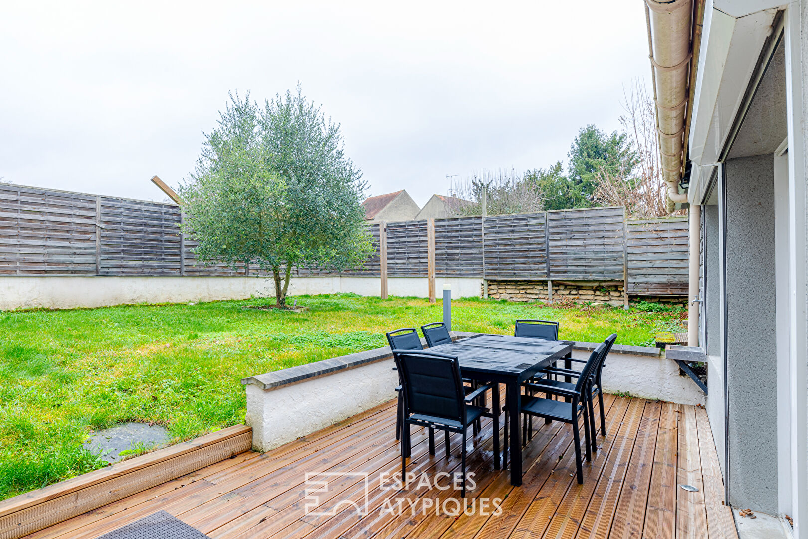 Située au coeur du village recherché de Guitrancourt, cette propriété est bien plus qu'une simple maison : c'est un véritable refuge de 145 m² habitables. Entièrement rénovée avec une exigence rare, elle marie à la perfection le charme de l'ancien ? poutres monumentales et volumes organiques ? et le confort d'un design contemporain. Une Architecture Intérieure Singulière La pièce de vie est spectaculaire baignée de lumière naturelle grâce à ses larges baies vitrées et ses ouvertures zénithales. Un vaste salon-cathédrale accueille un poêle à granulés, point d'ancrage chaleureux sous une mezzanine vitrée qui surplombe l'espace. Cuisine et Convivialité : La cuisine moderne, entièrement intégrée, communique avec l'espace dînatoire pour des moments de partage fluides. Côté Nuit : La maison dispose de 5 chambres aux univers distincts. On y découvre des suites sous combles où les poutres d'origine côtoient des finitions épurées, offrant une atmosphère "boho-chic" irrésistible. Bonus : Un espace au rez-de-chaussée peut accueillir une chambre de plain-pied, une salle de sport ou un bureau pour le télétravail. Extérieurs et Prestations Haut de Gamme Le jardin de 300 m², petit écrin de verdure avec son olivier, s'ouvre sur une terrasse idéale pour les soirées d'été. Confort et Technologie : Ravalement neuf, ballon thermodynamique, fibre optique et garage indépendant avec porte motorisée (adapté 4x4). Performance : Chauffage individuel performant et isolation de qualité Vie Pratique et Environnement Alliez le calme absolu d'un village du Mantois à une hyper-proximité stratégique : Transports : La gare de Gargenville à 10 min amenant via la ligne J à la gare Saint Lazare, ainsi que la gare d'Epône-Mézières à 15 min, future gare du RER Eole. L'accès à l'autoroute A13 se fait en seulement 5 minutes, plaçant Paris à portée de main. Commerces et Loisirs : Tous les commerces de proximité sont accessibles en 2 minutes. Le secteur est prisé pour ses balades en pleine nature et son cadre de vie paisible. Une opportunité rare pour les amoureux d'espaces singuliers et de rénovations "clés en main". Contact : Julie 07 77 84 74 57 RSAC Versailles 894 542 950 Julie VALODE RAUBER (EI) Agent Commercial - Numéro RSAC : 894 542 950 - Versailles.