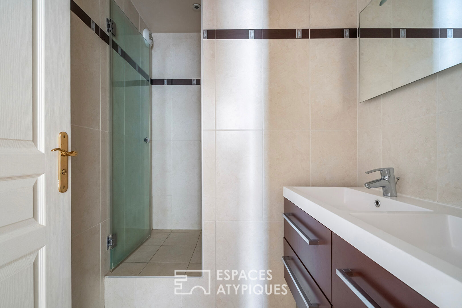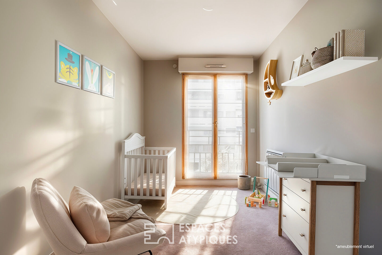 A quelques pas du métro Charenton-Écoles et littéralement à une enjambée du bois de Vincennes, cet appartement de 125 m² (124,53 m² Carrez) s'impose comme une adresse rare. Situé au 3ème étage d'une copropriété récente (2006), il conjugue volumes, lumière et qualité de vie urbaine. Dès l'entrée, un vestiaire généreux et un toilette invités signent la première touche d'un confort bien pensé. Le séjour, vaste d'environ 30 m², s'ouvre sur un balcon aux proportions confortables, invitant aussi bien aux repas en extérieur qu'aux instants de détente. L'orientation préserve du tumulte de la rue et offre une perspective originale sur les toits et les arbres alentour, un décor presque new-yorkais où l'architecture dialogue avec la végétation. Dans son prolongement, la cuisine séparée s'ouvre elle aussi sur l'extérieur, offrant un cadre lumineux et pratique pour la préparation des repas. La partie nuit, parfaitement distincte, décline pas moins de cinq chambres : une suite parentale avec salle de bain, deux chambres actuelles aménagées en bureaux, et deux autres, l'ensemble bénéficiant d'une belle luminosité grâce à la double orientation traversante de l'appartement. Deux salles de douche, un second toilette indépendant ainsi qu'une buanderie complètent cette distribution fonctionnelle. L'ensemble ne requiert aucun gros travaux : les bases sont saines, les espaces parfaitement calibrés. Il s'agira davantage d'une remise au goût du jour, laissant la liberté aux futurs propriétaires d'y insuffler leur propre identité esthétique. Une cave et une place de parking en sous-sol viennent parfaire le confort de cet appartement pensé pour la vie familiale contemporaine. Le Plateau de Saint-Maurice conjugue les atouts d'une vie presque parisienne - commerces de qualité, marché apprécié, établissements scolaires reconnus - avec la respiration du bois de Vincennes tout proche. Un contexte qui met en lumière l'ampleur et la fonctionnalité de cet appartement, véritablement unique par la combinaison de sa surface et de son emplacement. Métro Charenton-École: 4 min à pied Bois de Vincennes : Proximité immédiate CLASSE ÉNERGIE : C CLASSE CLIMAT : C Prix moyen des énergies indexés sur les années 2021,2022,2023 : 920 euros et 1290 euros. Les informations sur les risques auxquels ce bien est exposé sont disponibles sur le site Géorisques : https://www.georisques.gouv.fr Contact : Mélanie Famuliak 07 69 44 20 88 - EI - Agent Commercial - RSAC: 907 896 245 Bobigny Copropriété de 22 lots. Charges annuelles : 828 euros. Mélanie FAMULIAK (EI) Agent Commercial - Numéro RSAC : 907 896 245 - Bobigny.