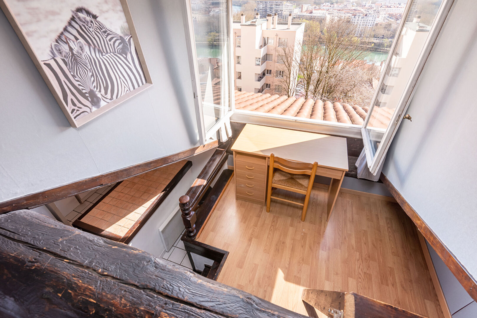 Au coeur de la Croix-Rousse, au 5ème et dernier étage d'une copropriété bien entretenue (ascenseur jusqu'au 4ème étage), cet appartement atypique développe 18 m² de surface utile et 9 m² Carrez, avec la possibilité de récupérer environ 3 m² Carrez supplémentaires grâce à un réaménagement. Orienté plein Est, il bénéficie d'une vue imprenable sur Lyon, apportant une belle luminosité dès le matin. L'appartement s'organise sur plusieurs niveaux, avec une cuisine, un séjour