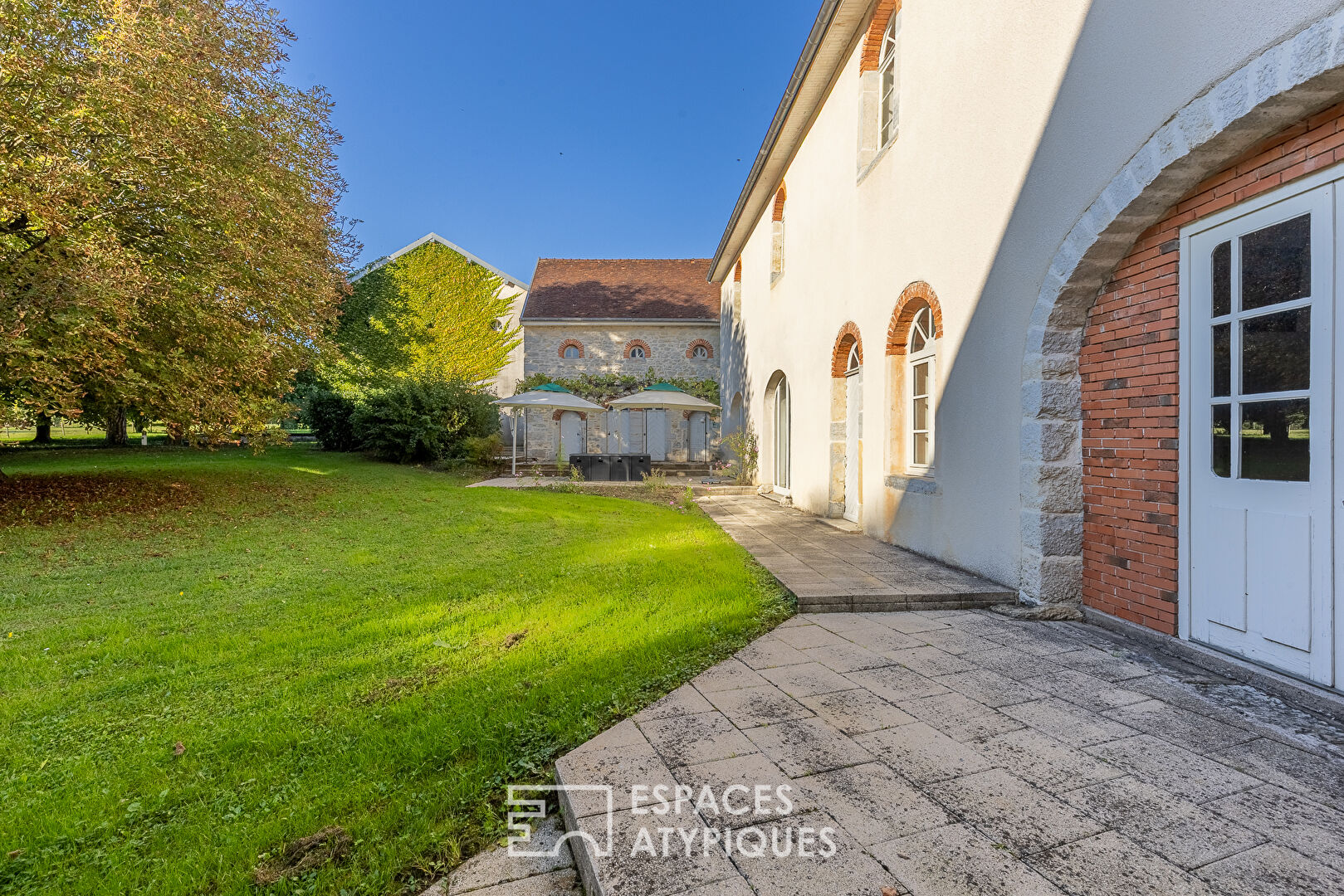 A la croisée du Jura, du Doubs et de la Haute-Saône, à 20 minutes de Dole et 35 minutes de Besançon, cette ancienne propriété de meunier forme un ensemble immobilier rare, composé de plusieurs bâtis en pierre organisés autour d'une cour close et intimiste. La maison principale développe de beaux volumes avec un salon-séjour chaleureux, une cuisine conviviale, plusieurs chambres réparties sur trois niveaux et une annexe attenante aux volumes atypiques, marquée par la présence de silos à grains d'origine. Deux autres bâtiments complètent l'ensemble : une seconde maison avec appartement d'environ 180 m² à réhabiliter, des caves voûtées, des chambres à restaurer et un vaste hangar offrant de multiples possibilités d'usage. Le parc arboré, ponctué d'allées ombragées et d'une fontaine, crée un cadre paisible à proximité de l'Ognon. Un bien de caractère au fort potentiel, idéal pour un projet familial, une résidence secondaire ou une activité d'accueil, dans une région à l'attractivité touristique reconnue. CLASSE ENERGIE : D / CLASSE CLIMAT : D. Montant moyen estimé des dépenses annuelles d'énergie pour un usage standard, établi à partir des prix moyens des énergies indexés sur les années 2021, 2022, 2023 : : entre 5561 euros et 7523 euros. Les informations sur les risques auxquels ce bien est exposé sont disponibles sur le site Géorisques pour les zones concernées. Contact : Alexis Monterrat 0649103904