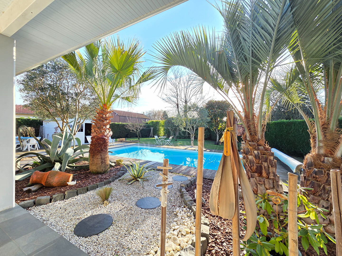 Située au coeur de Lacanau de Mios, dans un environnement calme, cette maison contemporaine construite en 2010 développe une surface habitable de 176 m². Édifiée sur une parcelle de 1 204 m², elle offre un cadre de vie agréable, alliant confort moderne et beaux volumes, à proximité immédiate des commodités. Dès l'entrée, équipée de deux grands placards, on accède à un vaste salon-séjour avec cheminée à récupérateur de chaleur, baigné de lumière et pensé pour des moments conviviaux en famille ou entre amis. La baie vitrée à galandage prolonge naturellement l'espace de vie vers la terrasse et la piscine exposées sud-ouest, offrant une belle continuité entre intérieur et extérieur. La cuisine, fonctionnelle et bien agencée, est complétée par un cellier buanderie apportant un espace de rangement appréciable. Une pièce supplémentaire pouvant servir de bureau, ouverte sur le jardin, constitue un atout agréable en toute saison. L'espace nuit se compose de trois chambres confortables, d'un dressing, d'un WC indépendant ainsi que d'une salle de bains complète avec double vasque, douche à l'italienne et baignoire. L'agencement actuel offre également la possibilité de créer facilement une suite parentale, selon vos envies et vos besoins, pour un espace nuit encore plus intimiste et fonctionnel. A l'extérieur, le jardin paysagé, soigneusement entretenu avec arrosage automatique, invite à la détente et à la convivialité. La piscine 9x4 s'intègre harmonieusement dans cet espace verdoyant, offrant un véritable lieu de loisirs durant les beaux jours. Un cabanon permet le rangement du matériel de jardin et des équipements de piscine. La maison dispose également d'un garage de plus de 20 m² isolé et carrelé ainsi que d'un abri voiture, offrant des solutions de stationnement pratiques et sécurisées (au moins 3 véhicules). Cette maison, bien entretenue et idéalement située, représente une opportunité rare sur le secteur de Lacanau de Mios, parfaite pour une famille à la recherche d'espace, de calme et de qualité de vie tout en étant à proximité des écoles. Contactez Marie SEPULLE L'EYRE DU BASSIN (3.81 % honoraires TTC à la charge de l'acquéreur.) Marie SEPULLE (EI) Agent Commercial - Numéro RSAC : 949 817 217 - BORDEAUX.