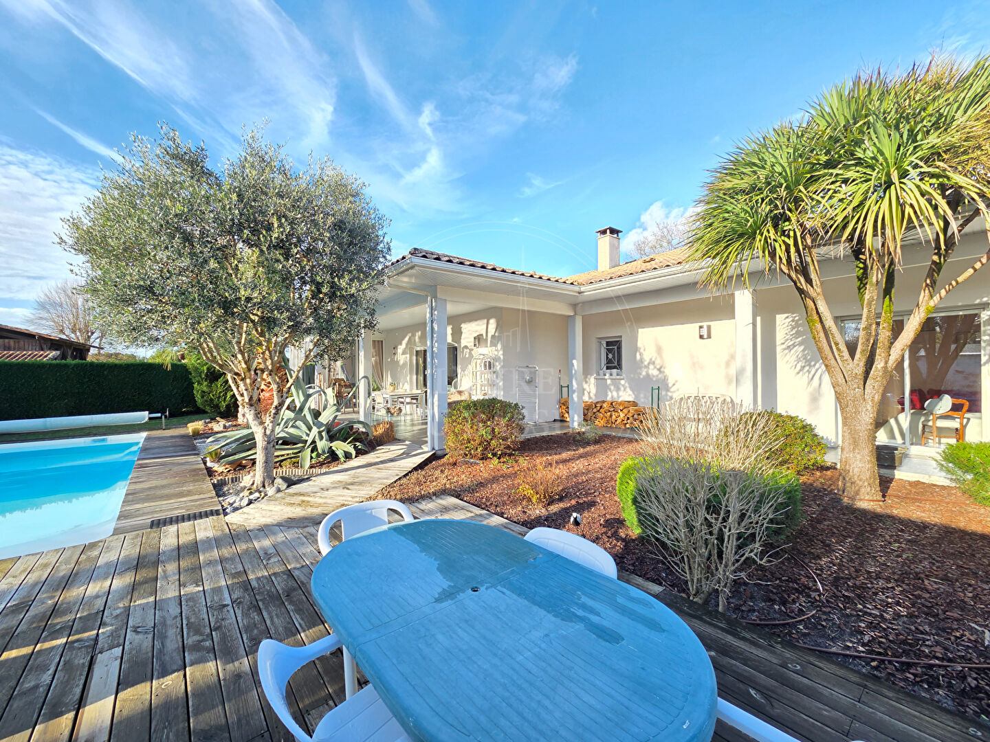 Située au coeur de Lacanau de Mios, dans un environnement calme, cette maison contemporaine construite en 2010 développe une surface habitable de 176 m². Édifiée sur une parcelle de 1 204 m², elle offre un cadre de vie agréable, alliant confort moderne et beaux volumes, à proximité immédiate des commodités. Dès l'entrée, équipée de deux grands placards, on accède à un vaste salon-séjour avec cheminée à récupérateur de chaleur, baigné de lumière et pensé pour des moments conviviaux en famille ou entre amis. La baie vitrée à galandage prolonge naturellement l'espace de vie vers la terrasse et la piscine exposées sud-ouest, offrant une belle continuité entre intérieur et extérieur. La cuisine, fonctionnelle et bien agencée, est complétée par un cellier buanderie apportant un espace de rangement appréciable. La véranda pouvant servir de bureau, ouverte sur le jardin, constitue une véritable pièce supplémentaire, agréable en toute saison. L'espace nuit se compose de trois chambres confortables, d'un dressing, d'un WC indépendant ainsi que d'une salle de bains complète avec double vasque, douche à l'italienne et baignoire. L'agencement actuel offre également la possibilité de créer facilement une suite parentale, selon vos envies et vos besoins, pour un espace nuit encore plus intimiste et fonctionnel. A l'extérieur, le jardin paysagé, soigneusement entretenu avec arrosage automatique, invite à la détente et à la convivialité. La piscine 9x4 s'intègre harmonieusement dans cet espace verdoyant, offrant un véritable lieu de loisirs durant les beaux jours. Un cabanon permet le rangement du matériel de jardin et des équipements de piscine. La maison dispose également d'un garage de plus de 20 m² isolé et carrelé ainsi que d'un abri voiture, offrant des solutions de stationnement pratiques et sécurisées (au moins 3 véhicules). Cette maison, bien entretenue et idéalement située, représente une opportunité rare sur le secteur de Lacanau de Mios, parfaite pour une famille à la recherche d'espace, de calme et de qualité de vie tout en étant à proximité des écoles. Contactez Marie SEPULLE L'EYRE DU BASSIN (4.00 % honoraires TTC à la charge de l'acquéreur.) Marie SEPULLE (EI) Agent Commercial - Numéro RSAC : 949 817 217 - BORDEAUX.