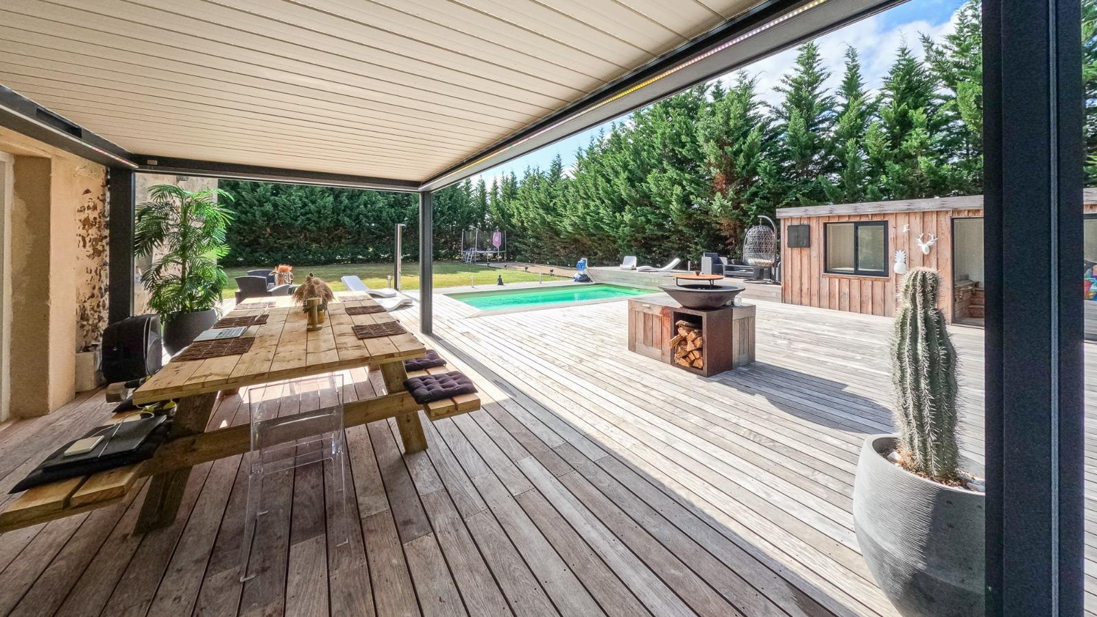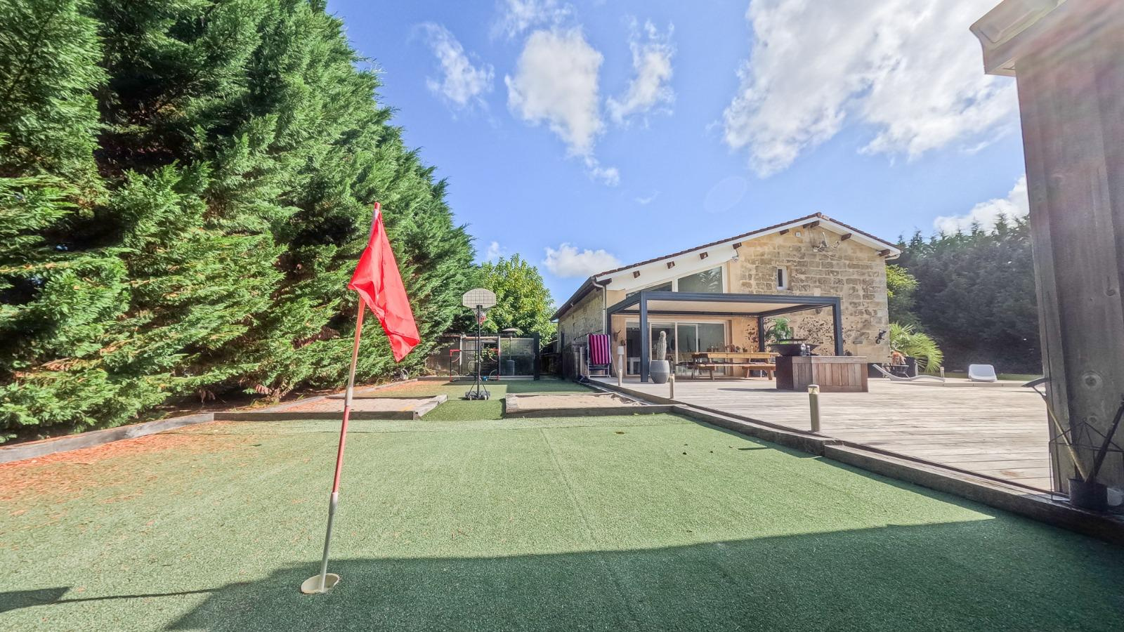 Vous trouverez sur cette parcelle d'environ 1473 m2 issue d'une parcelle de plus grande contenance en cours de division, une belle terrasse en bois avec une pergola bioclimatique, une piscine, un practice de golf, un jacuzzi et un terrain de pétanque.