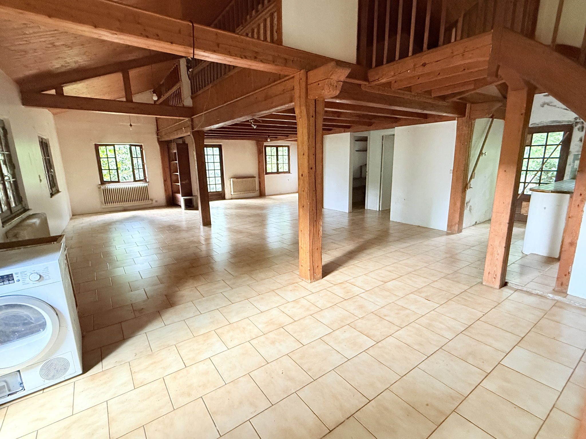 1ère Bâtisse d'environ 180m2 Maison d'habitation sur trois niveaux avec cave :oNiveau principal (rez-de-chemin) : Un logement spacieux de 87 m2 comprenant un vaste séjour avec cuisine ouverte, une chambre confortable, un espace sanitaire, ainsi qu'une mezzanine de 36 m2 offrant un espace supplémentaire.oNiveau inférieur : Un second logement avec un séjour/cuisine de 14,62 m2, une salle d'eau de 6,25 m2, et deux grandes chambres de 15,20 m2 et 20,12 m2.oÉquipements : Chauffage central via deux chaudières a refaire, cave, fenêtres en simple vitrage bois, fosse septique non conforme.
