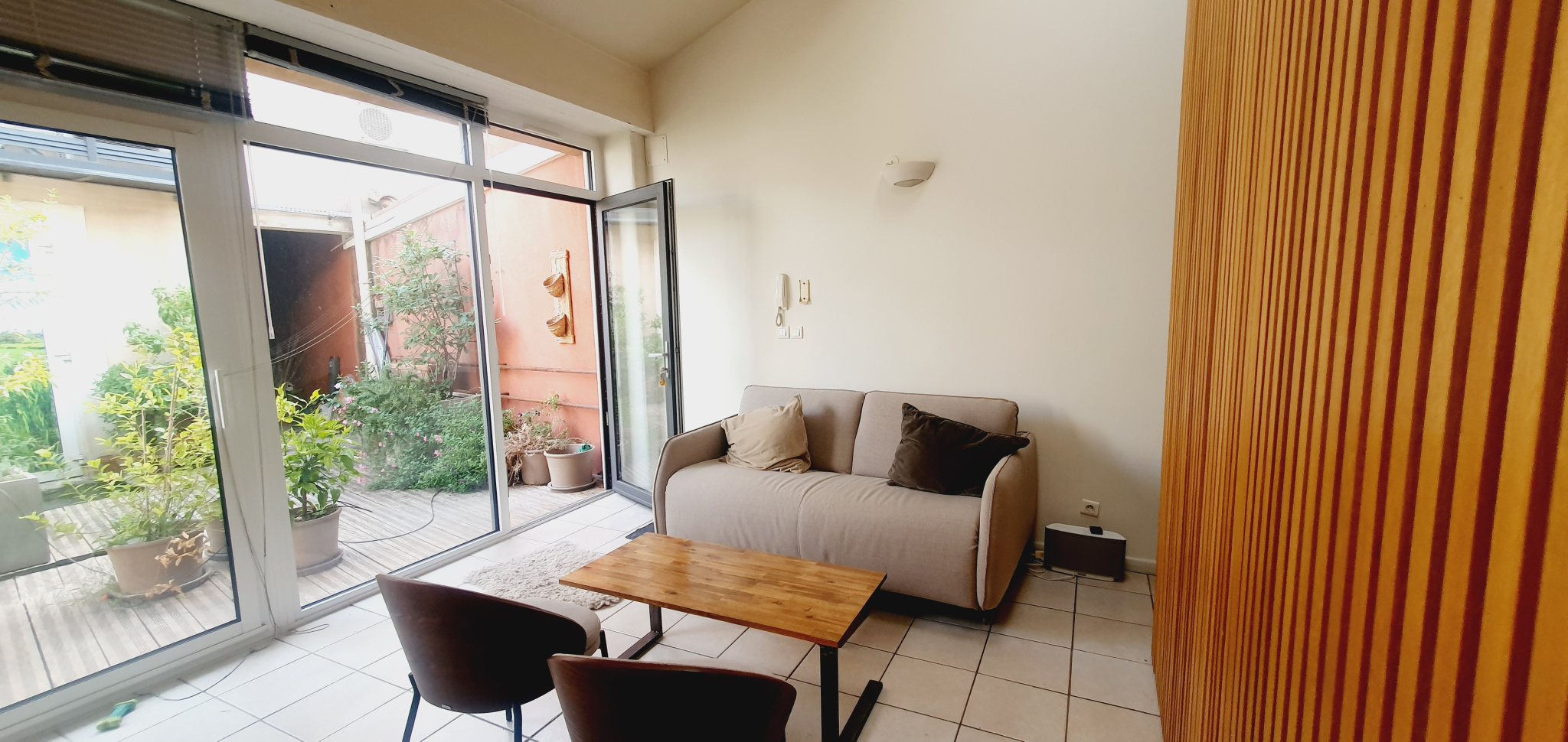 Une maison de ville en fond de cour d'environ 40 m2, avec : Une belle pièce principale avec coin cuisine, Un dégagement avec grand placard, toilettes indépendantes avec lave-mains, Une mezzanine de 7 m2 accessible par entrée indépendante, idéale pour un bureau ou un espace nuit.