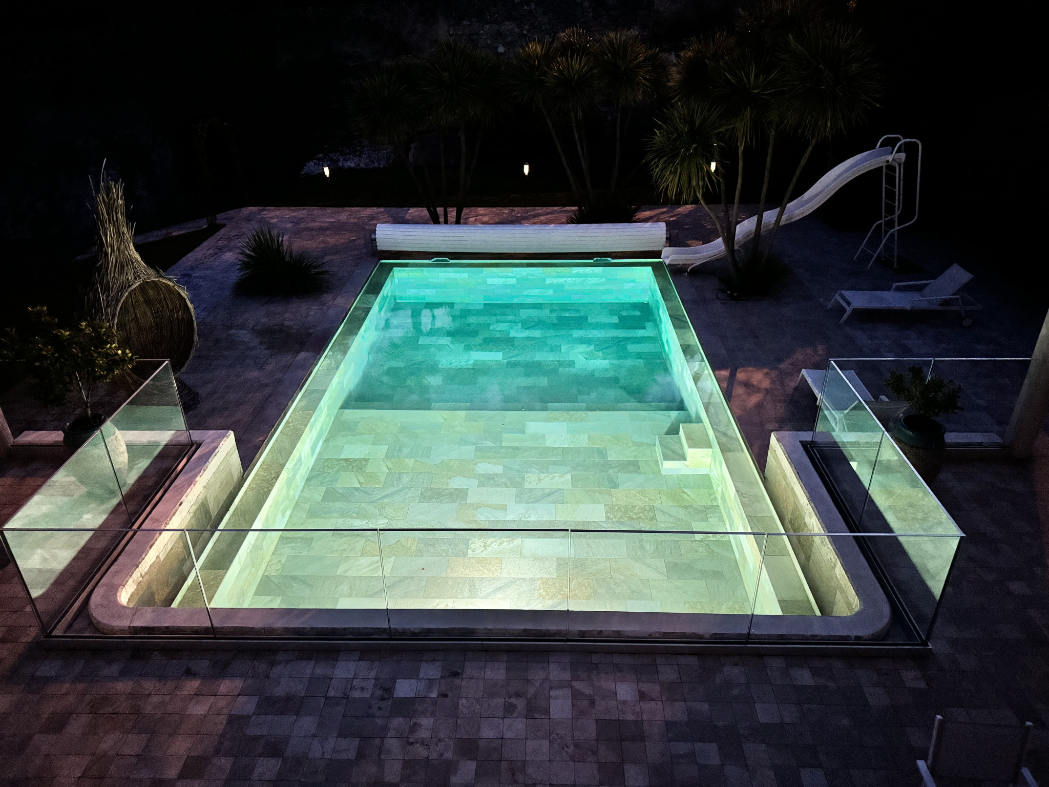 Piscine chauffée et couverte, au sel, 5,5 x 11 m, en Pierre de Bali.