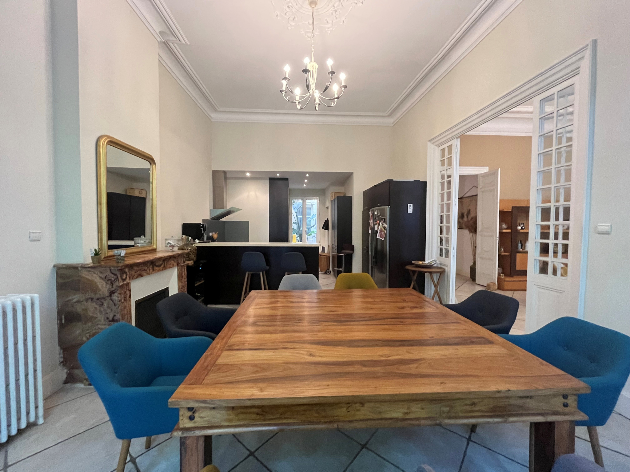 NIMES GAMBETTA C'est au premier étage d'un superbe immeuble de type Haussmannien que se situe cet appartement bourgeois. Dès l'entrée vous serez séduits par les volumes généreux qu'offre ce bien de 140 m2. Les pièces de vie, avec salon, salle à manger et cuisine américaine donnent sur les micocouliers du boulevard, grâce à de belles ouvertures avec volets intérieurs. Deux belles chambres de 16 et 26 m2 assurent un indéniable confort de vie, le tout accentué par de spéctaculaires hauteurs sous plafond avec moulures. Le charme de l'ancien combiné à un confort de vie moderne font de cet appartement un bien d'exception. Vous bénéficierez également d'un petit patio au centre de l'appartement. Aucun travaux à prévoir.