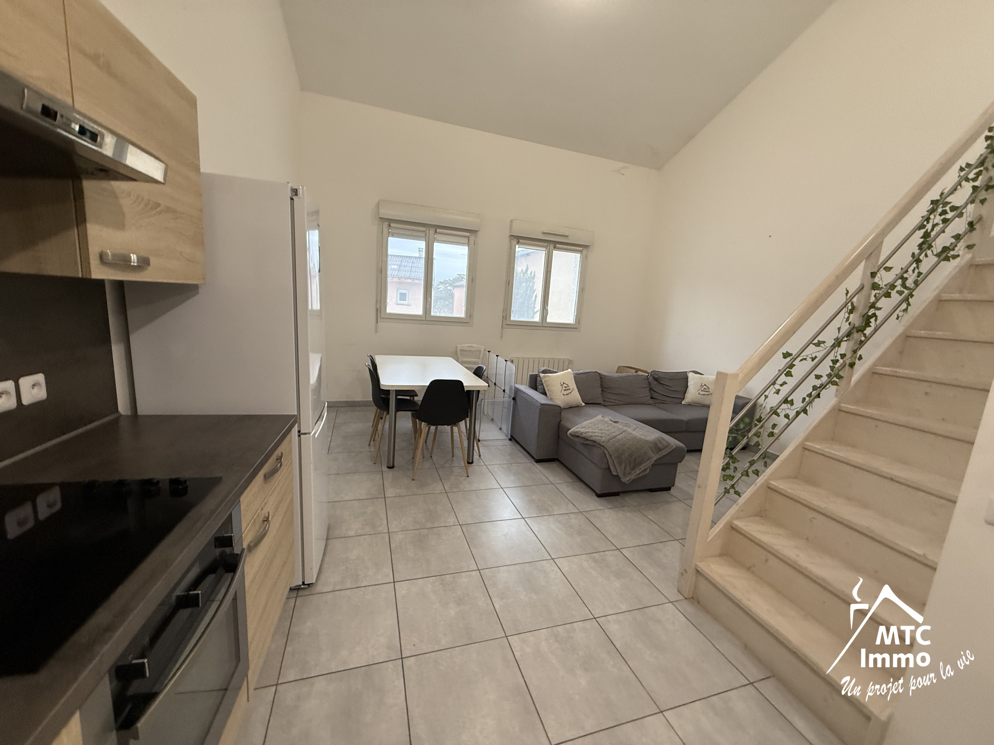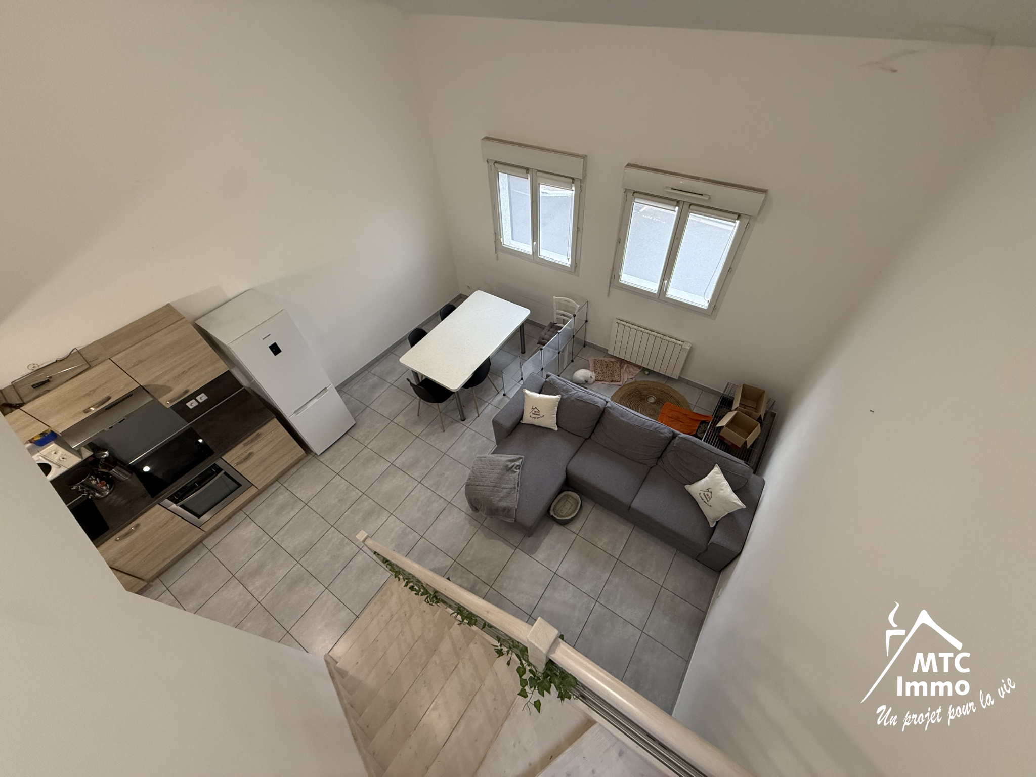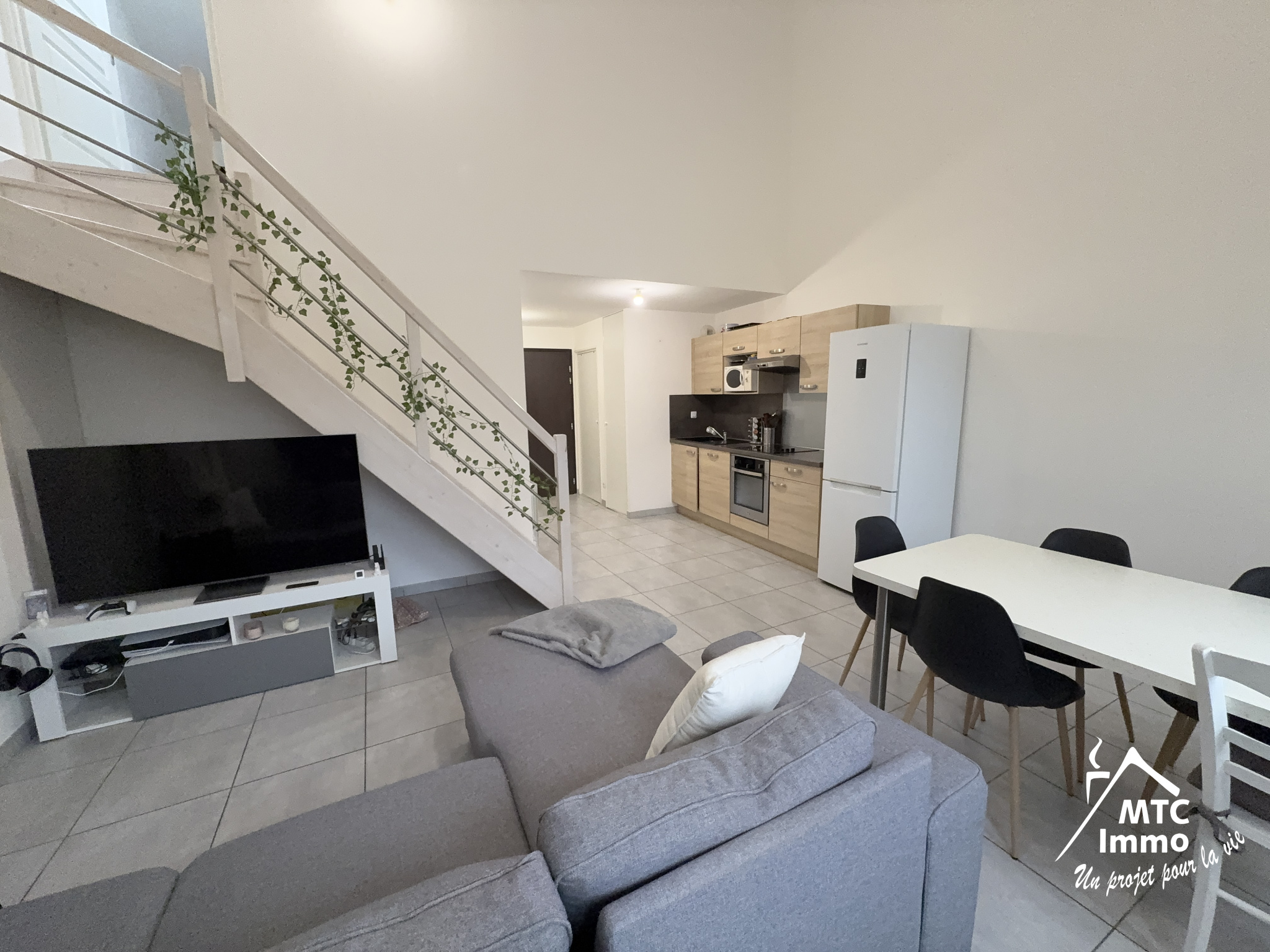 L'appartement se compose d'une entrée avec placard mural qui dessert une belle pièce de vie lumineuse avec cuisine ouverte, sublimée par une belle hauteur sous plafond qui apporte volume et caractère. À ce niveau, vous trouverez également une chambre, une salle d'eau et un WC indépendant. À l'étage, le duplex dispose d'une seconde chambre, idéale pour un espace nuit, bureau ou chambre d'enfant.