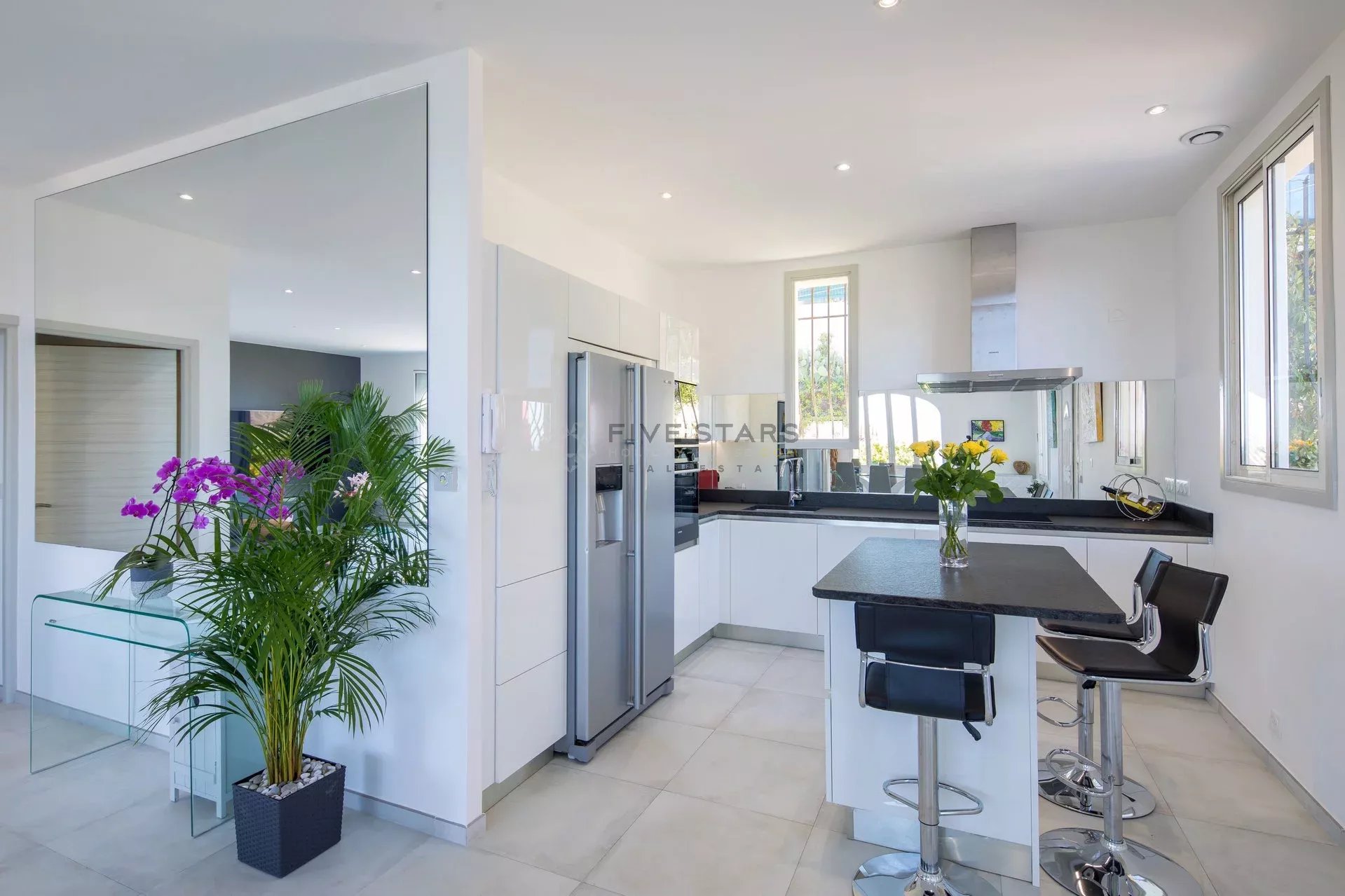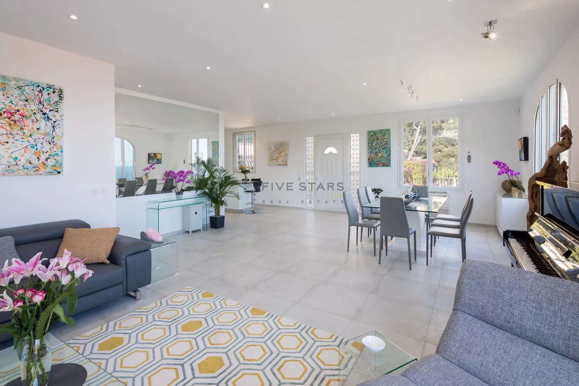 Cette propriété méditerranéenne de plain-pied, construite en 1960, a été entièrement rénovée en 2017. Deux terrasses plein sud, une vue magnifique et panoramique sur la mer et les montagnes.