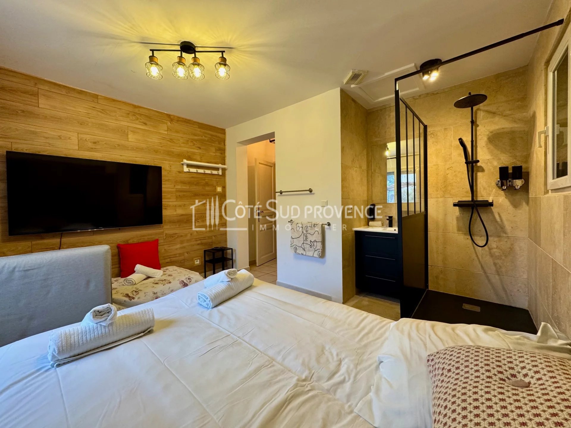 Au calme, 5 minutes à pieds du centre de Pernes-les-Fontaines, Villa d'environ 150 m² sur 2 niveaux, 4 chambres, 2 salles d'eau, terrain clos et arboré d'environ 1400 m², piscine 6 x 8 ml et chalet studio d'environ 12,5 m². Quartier résidentiel.