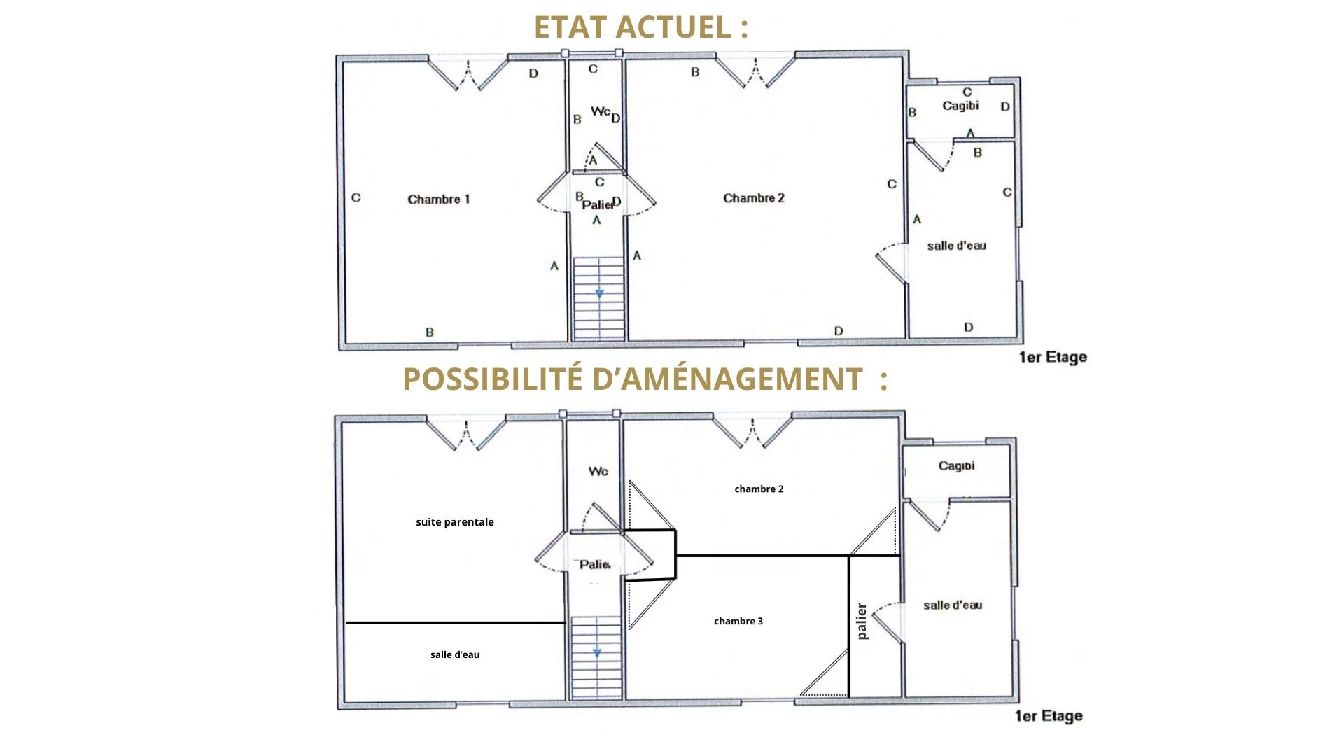 - à l'étage : palier, deux chambres (une des chambres peut être divisé en deux chambres afin d'avoir trois chambres - photo d'un plan d'aménagement possible présente sur l'annonce), une salle d'eau, wc.