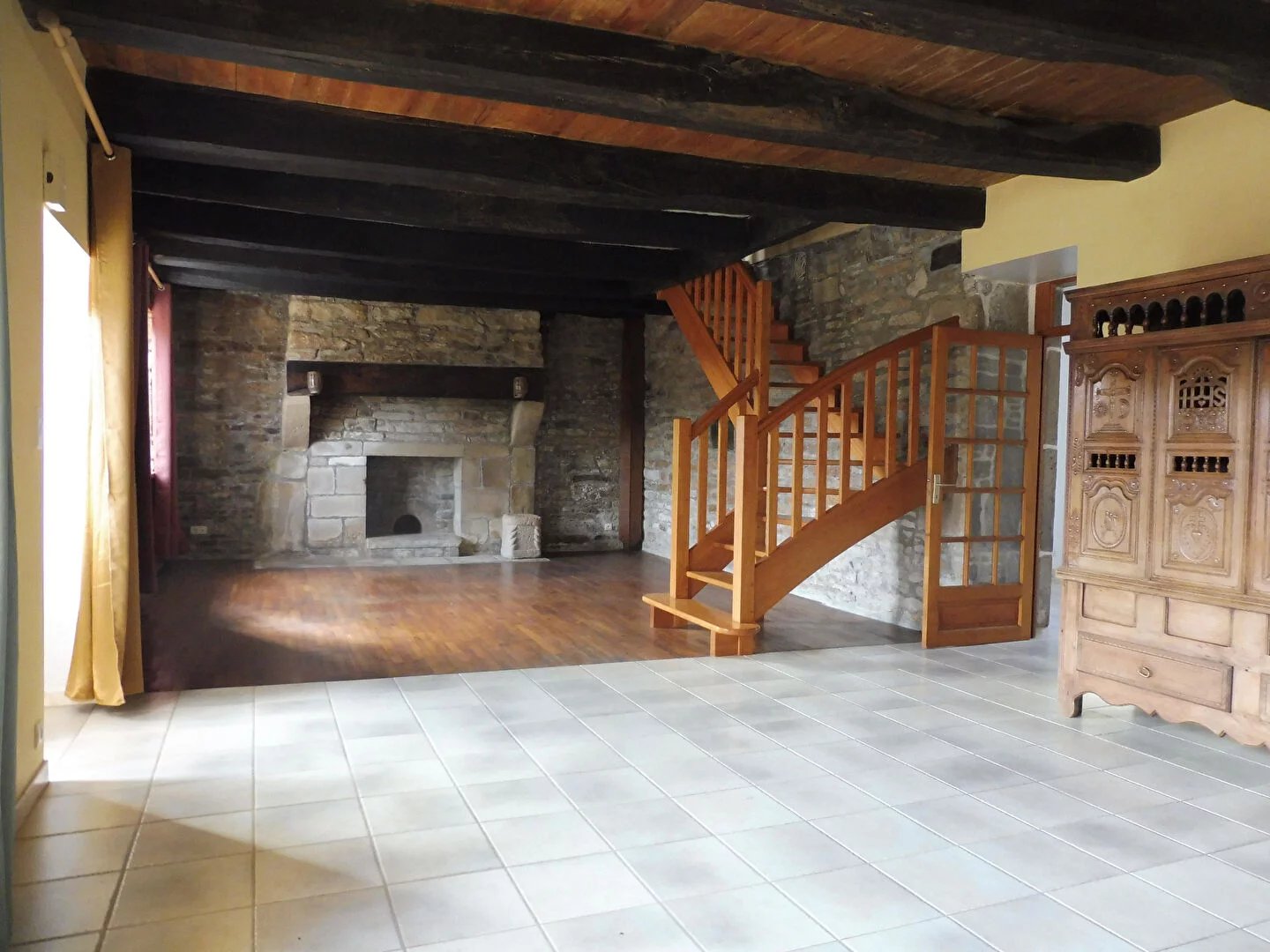 En campagne, grande maison d'habitation en pierres, elle comprend en rdc: une grande pièce de vie avec poele à granulés, une cuisine simple, une salle d'eau et wc. Au 1er étage: 2 chambres, salle de bains, wc, grenier Au 2 èmeétage : 2 chambres, wc. Divers : chauffage fioul et poèle à pellets, garage, cour