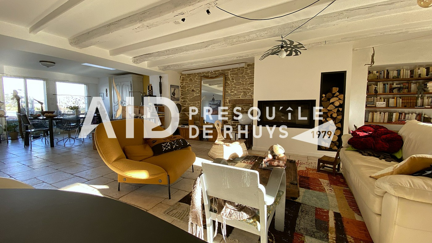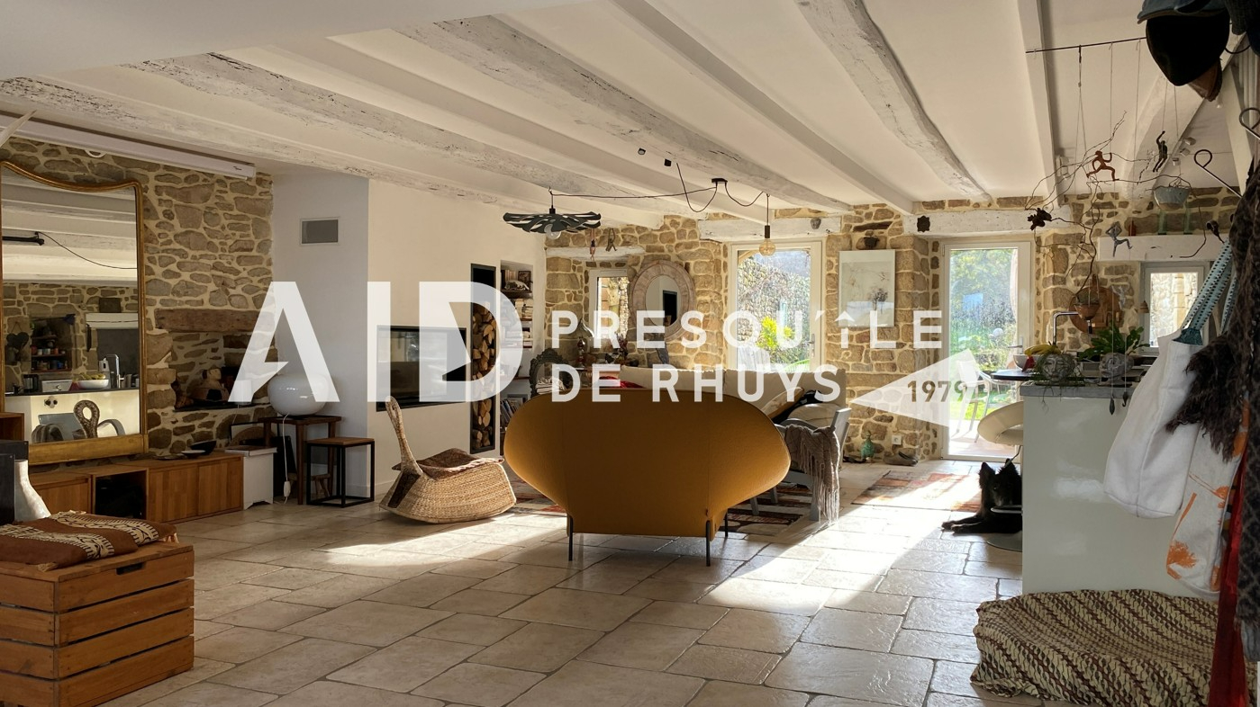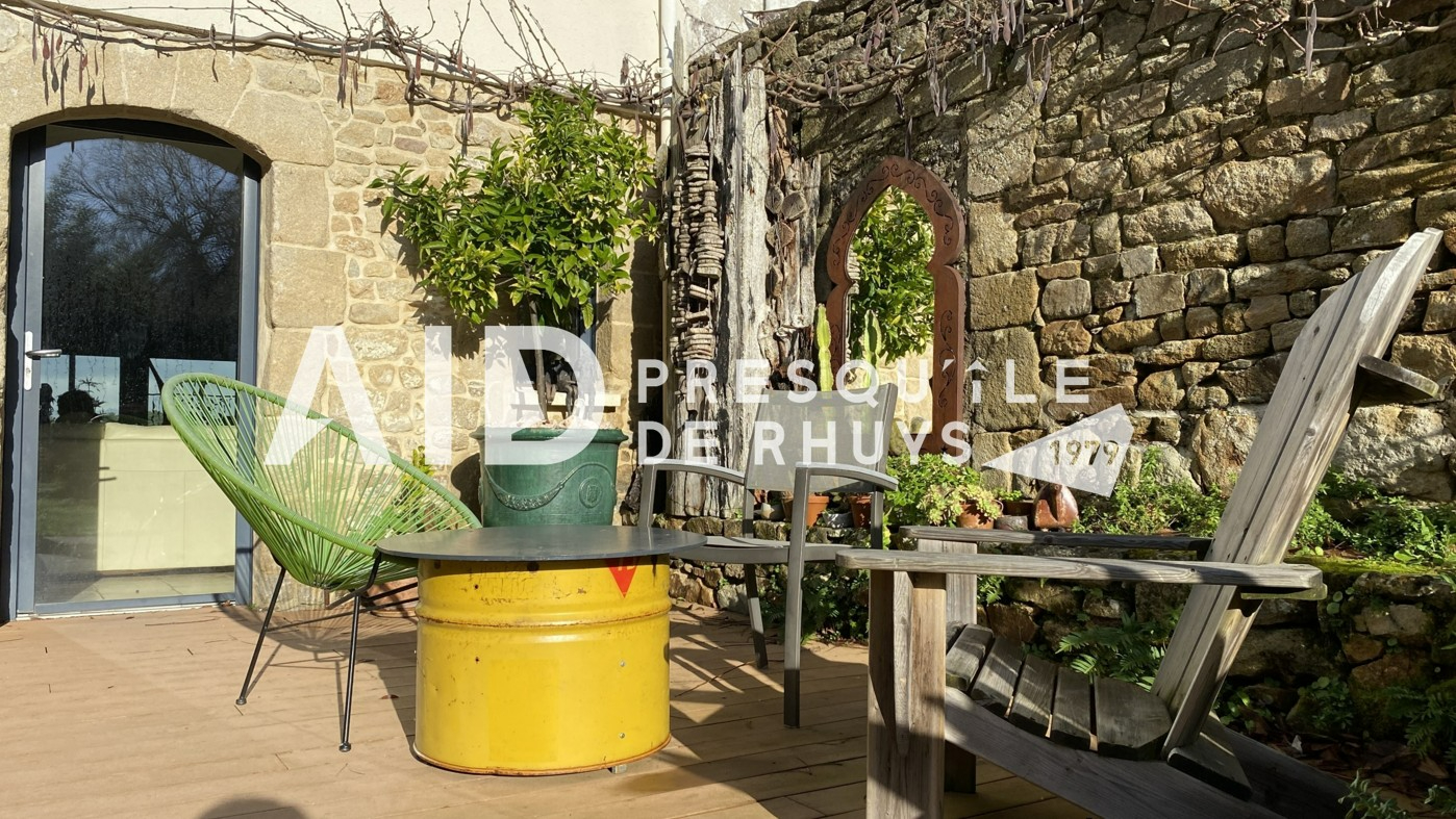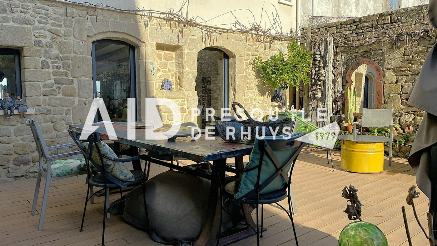Sur la commune d'Arzon en première ligne face à la mer, l'agence AID vous fait découvrir cet ensemble immobilier composé d'une maison en pierres de 139,20m² habitables rénovée en 2009 et d'une dépendance de 18,72m² habitables à proximité immédiate des commerces et des plages. L'entrée dessert une vaste pièce de vie de 66m² à l'ambiance chaleureuse et conviviale avec sa cuisine ouverte et sa cheminée contemporaine. Les ouvertures au Nord et au Sud permettront d'apprécier la vue mer d'un côté et le joli jardin intimiste bordé de murs en pierres de l'autre. Vous monterez l'escalier pour rejoindre un espace nuit articulé sur deux niveaux comprenant une suite parentale vue mer de 31m² avec salle d'eau privative et WC, deux chambres et une seconde salle d'eau avec WC. Les larges baies vitrées et la terrasse du premier étage vous permettront de voir évoluer au fil de la journée ce paysage de carte postale animée et d'être aux premières loges pour contempler le balais majestueux des bateaux qui passent devant Locmariaquer. Le jardin calme et verdoyant avec sa terrasse ensoleillée sera propice à la détente en famille. Vous le traverserez pour rejoindre la dépendance actuellement aménagée en atelier avec douche et WC. Cet espace pourra facilement être transformé en garage, salle de sport ou en studio pour accueillir vos convives en leur garantissant indépendance et tranquillité. Vous serez charmés par l'atmosphère unique et le charme du lieu : une véritable havre de paix à partir duquel toutes les activités et commodités sont accessibles à pieds ! (3.00 % honoraires TTC à la charge de l'acquéreur.)