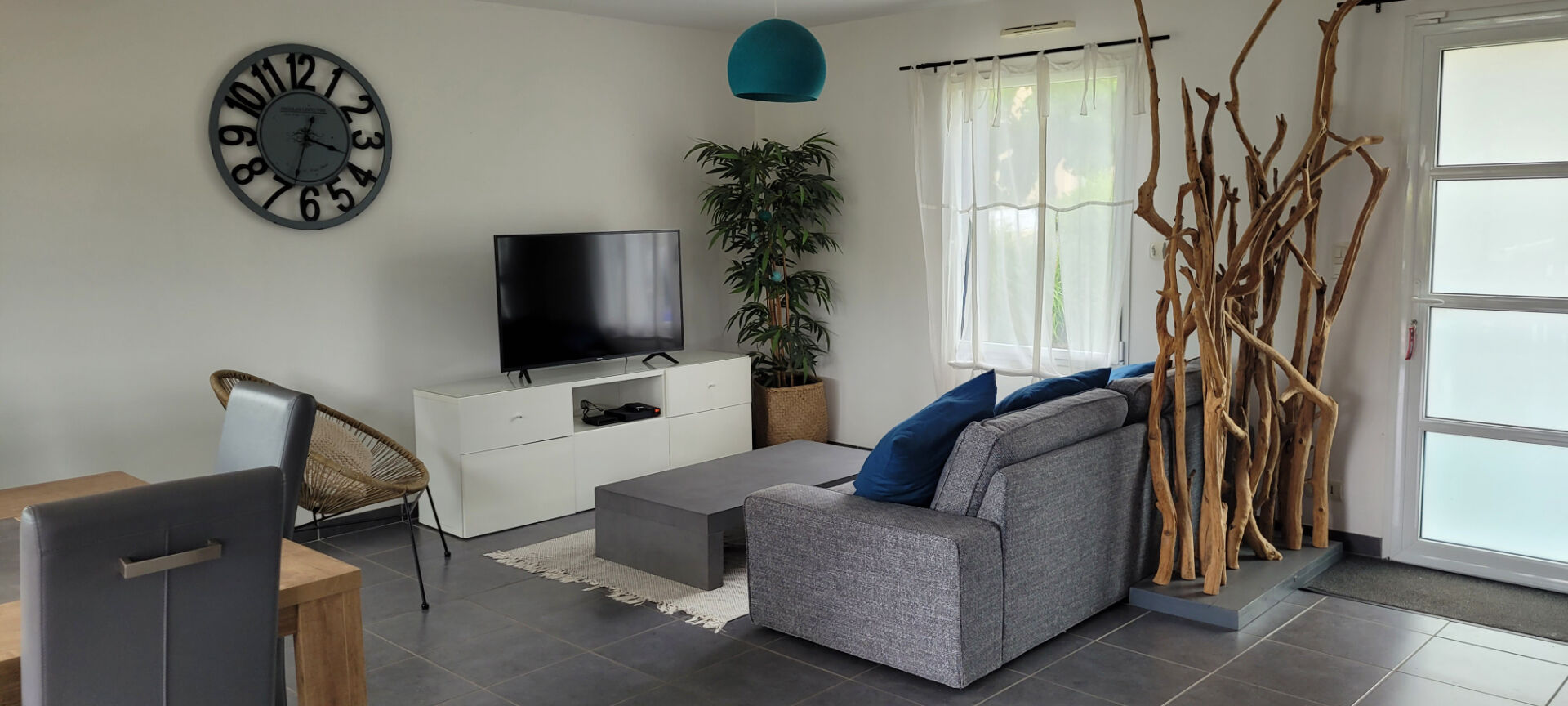 LAMBALLE dans quartier de La ville Merrien Maison récente de 2008 MEUBLEE, dans lotissement calme près du collège et des grands axes Séjour de plus de 30 m² avec cuisine américaine aménagée équipée, accès terrasse bois plein sud, 1 chambre, salle d'eau wc. A l'étage, un palier/bureau, 3 chambres équipées, salle de bains, wc. Garage porte automatisée (1 voiture), parking bitumé devant Jardin arboré et clos sans vis à vis Chauffage pompe à chaleur. Entretien PAC et taille des haies compris dans les charges. Libre Honoraires : 709 euros (bail et état des lieux d'entrée) + dépôt de garantie : 1000 euros