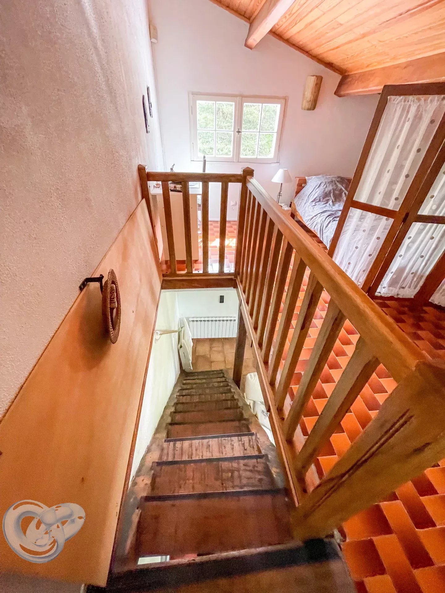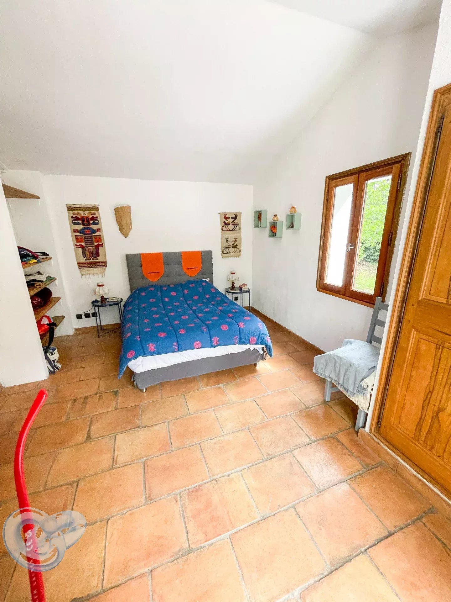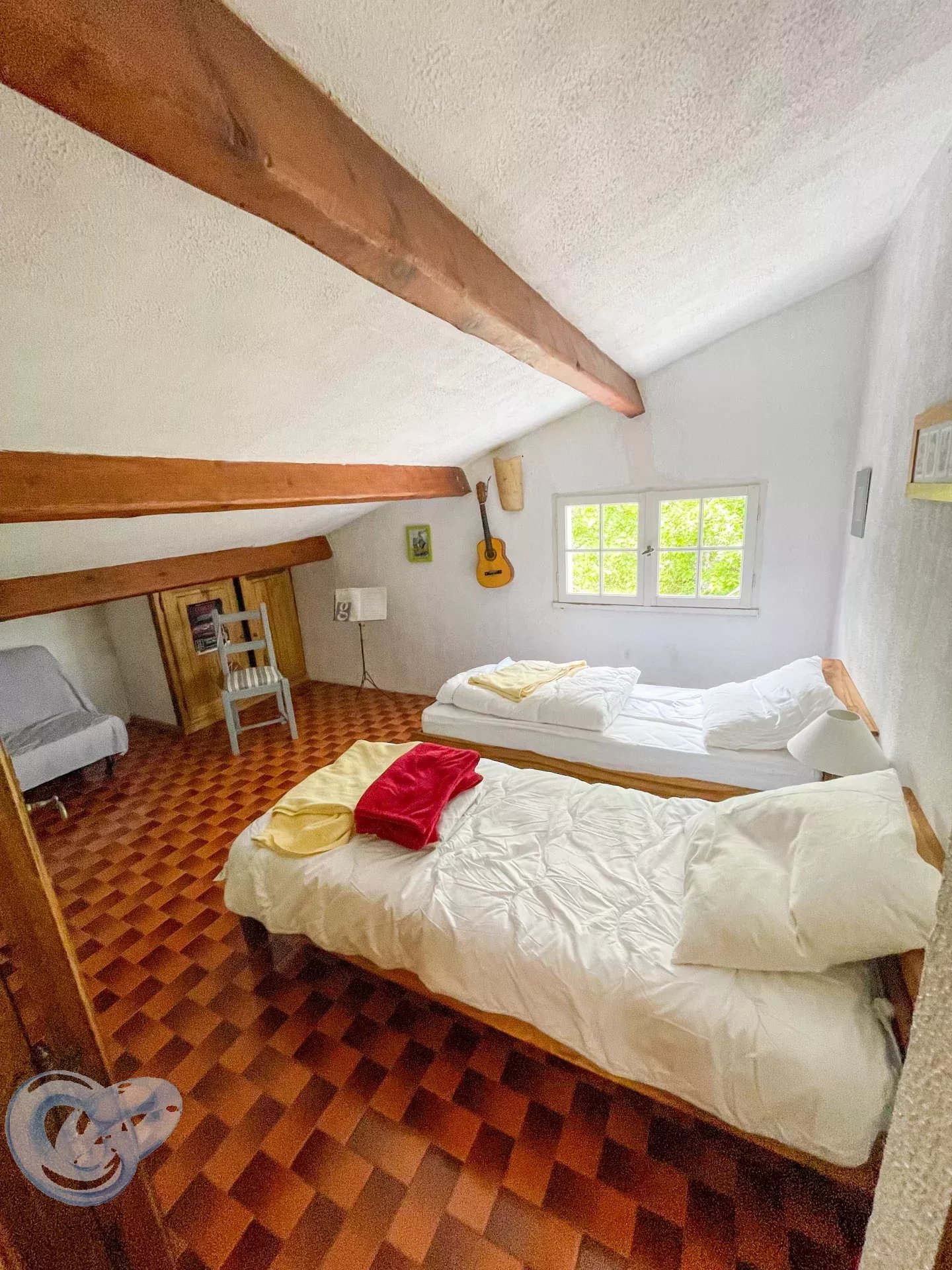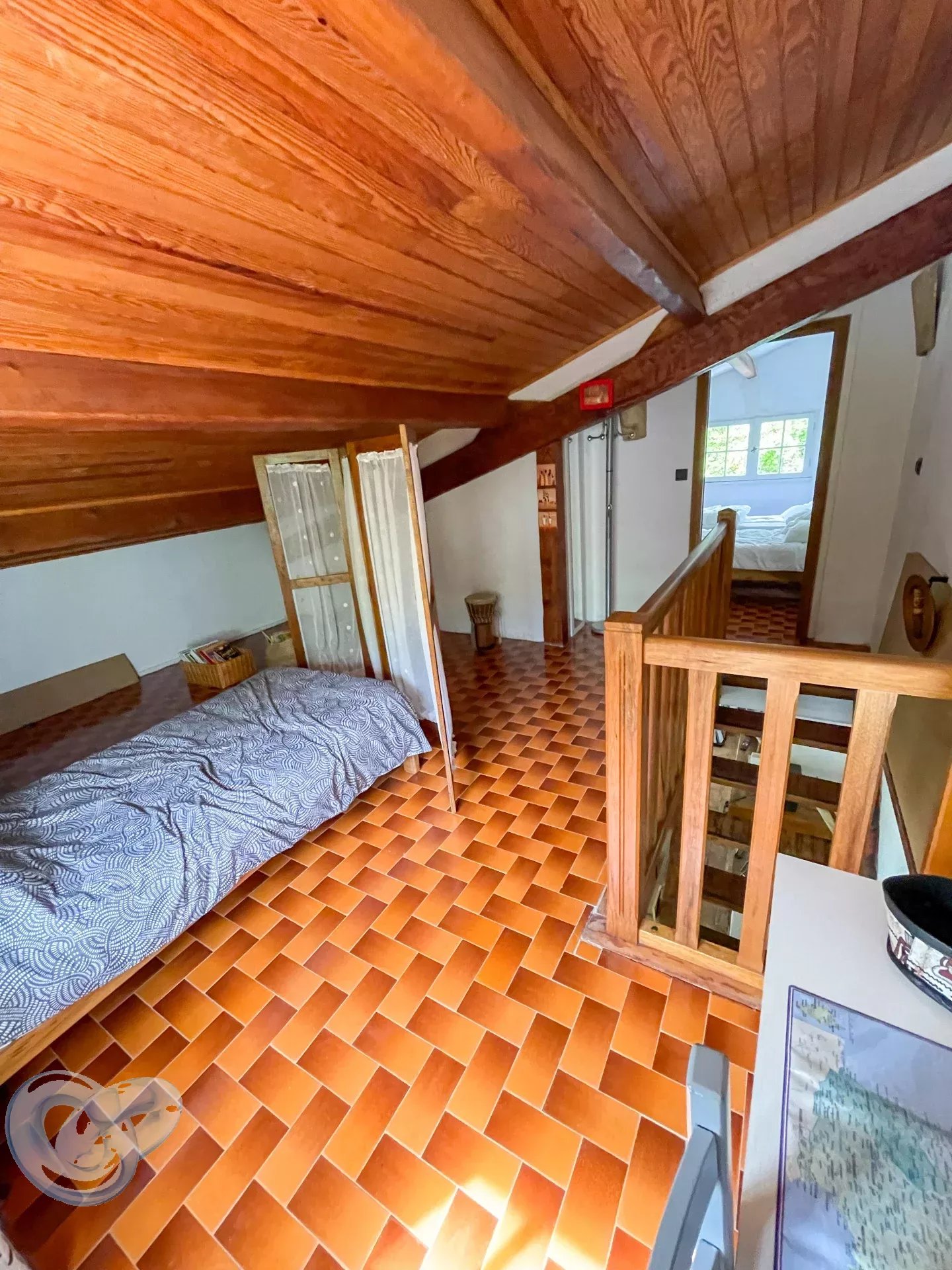À l’étage : deux chambres aménagées sous les combles, apportant tout le charme des volumes mansardés.