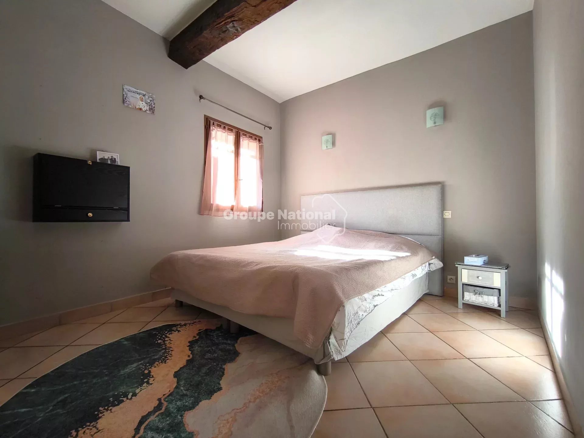 Au rez-de-chaussée, vous trouverez une cuisine équipée et aménagée/salle à manger, agrémentée d’un poêle à granulés, avec un accès direct à un jardin entièrement carrelé. Le charme de l’ancien est préservé grâce au plafond à la provençale avec poutres apparentes.