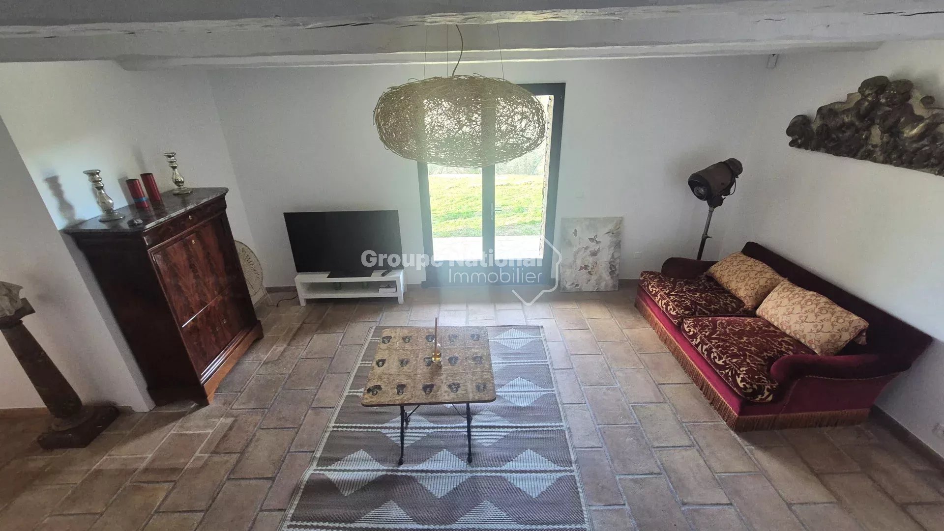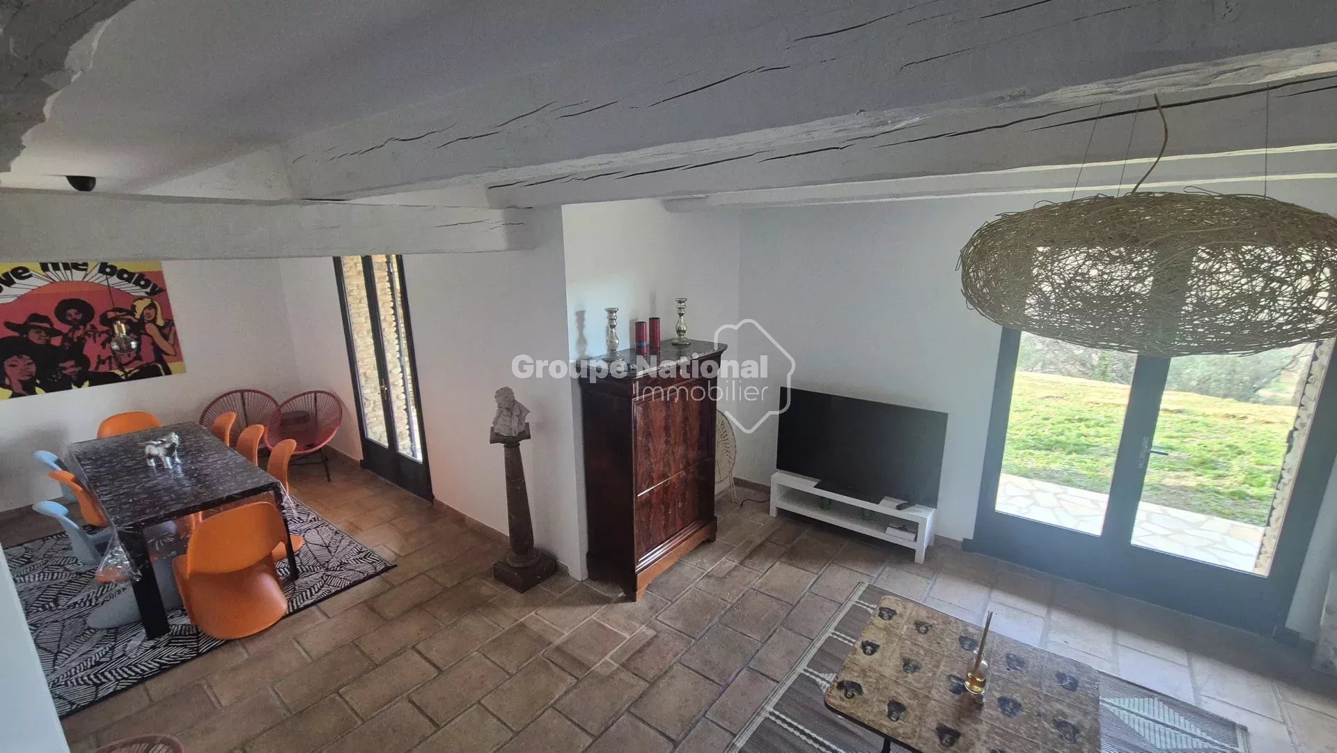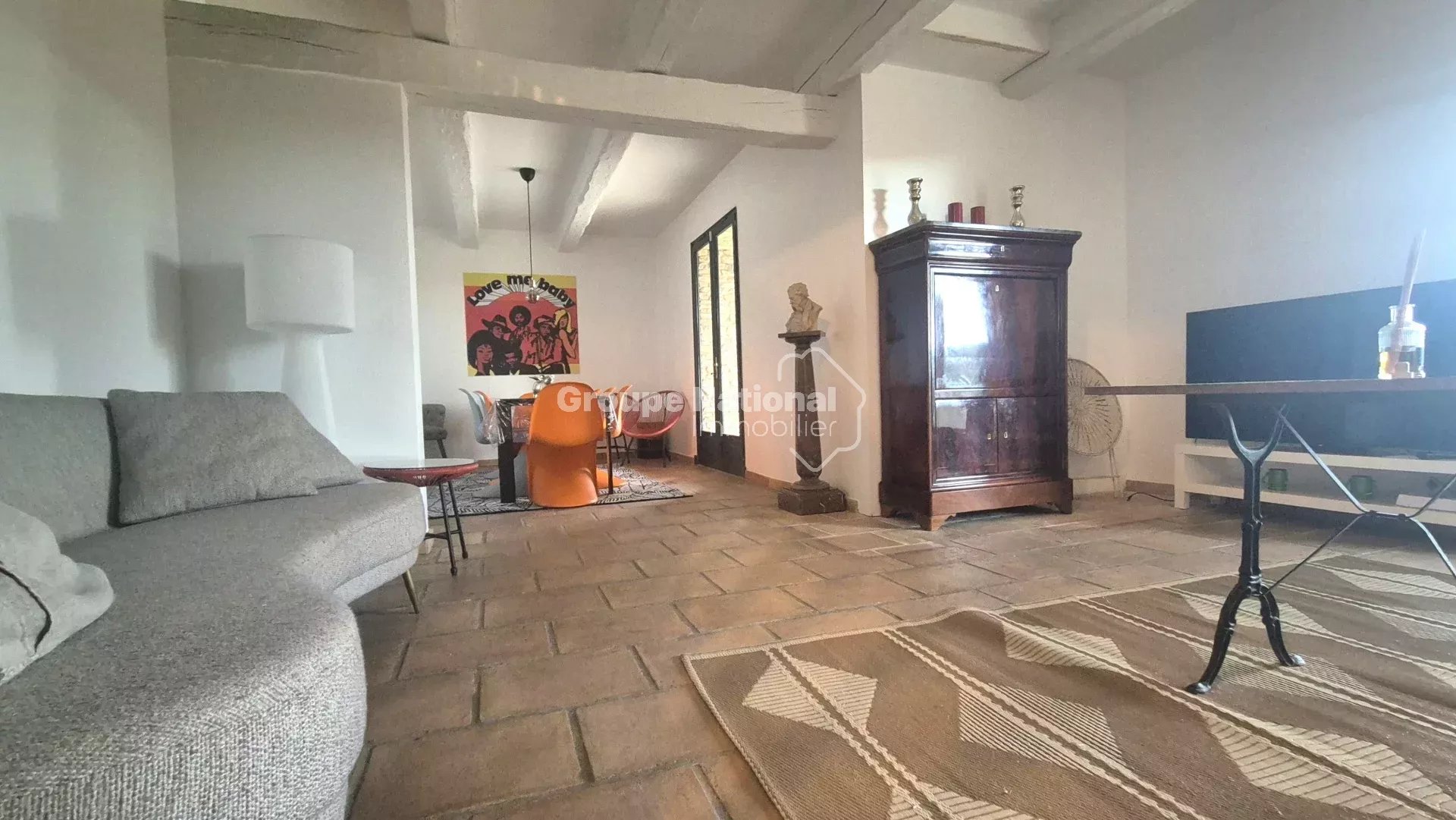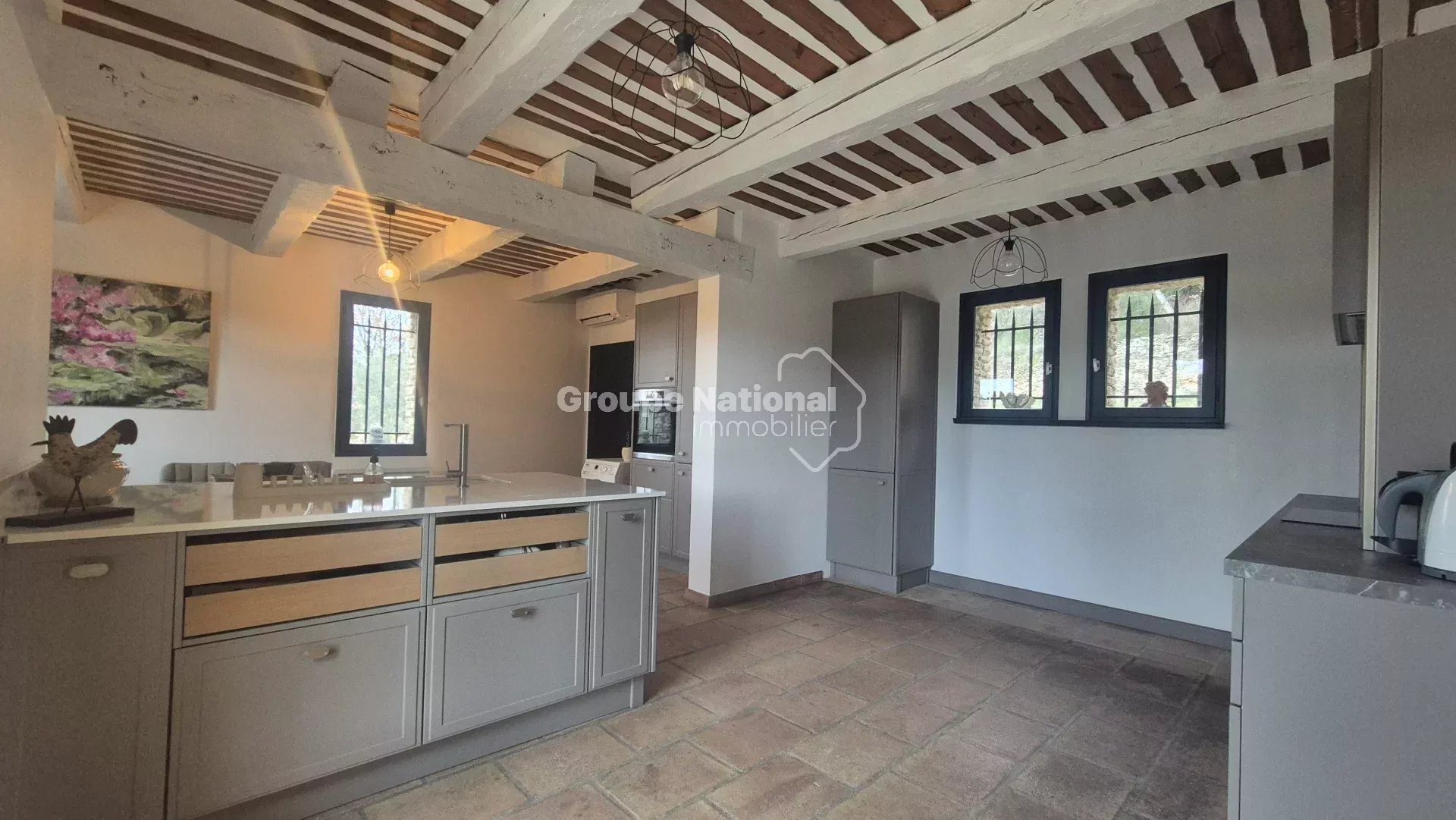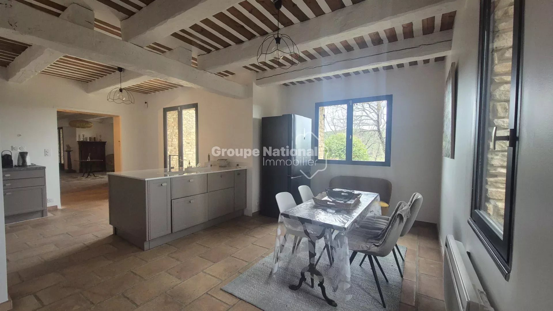 Elle est composée de 4 chambres, deux salles de bain, une grande cuisine équipée aménagée avec des poutres apparentes, séjour/ salon avec du parefeuille au sol.