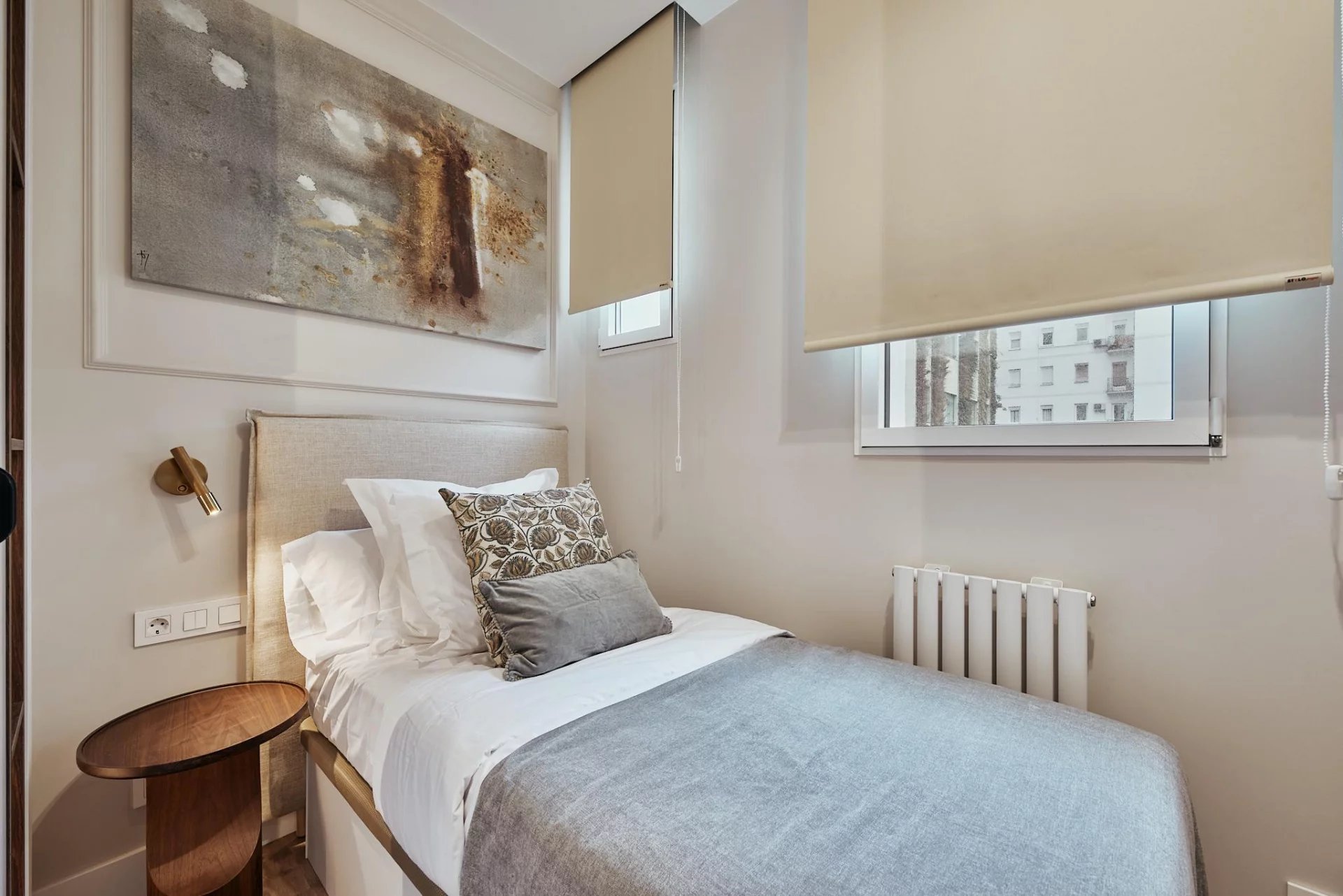 The apartment has been refurbished and is delivered fully furnished, with a south-facing orientation that provides excellent natural light. It includes an equipped kitchen, individual gas heating, air conditioning, and fitted finishes that enhance comfort.