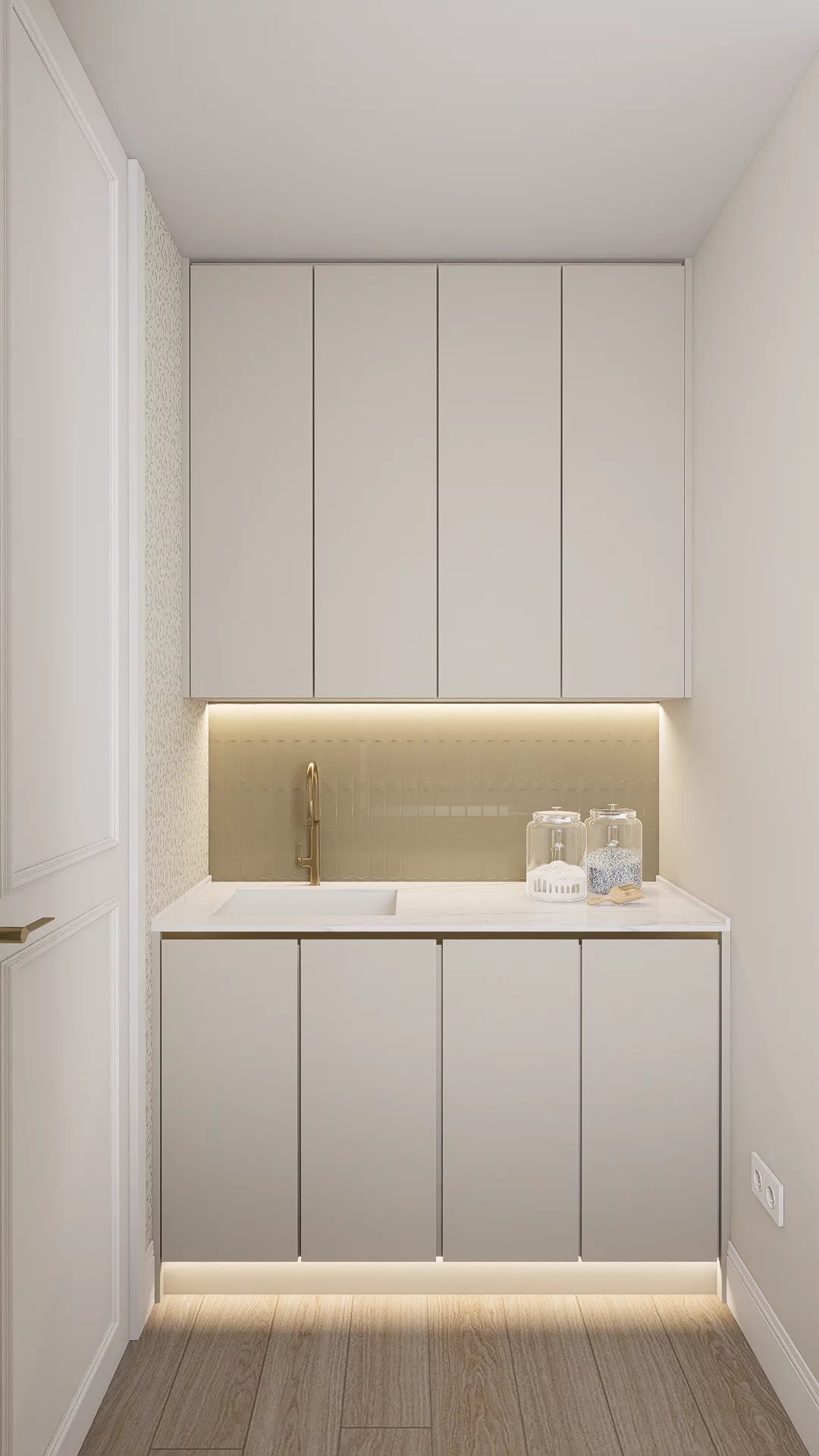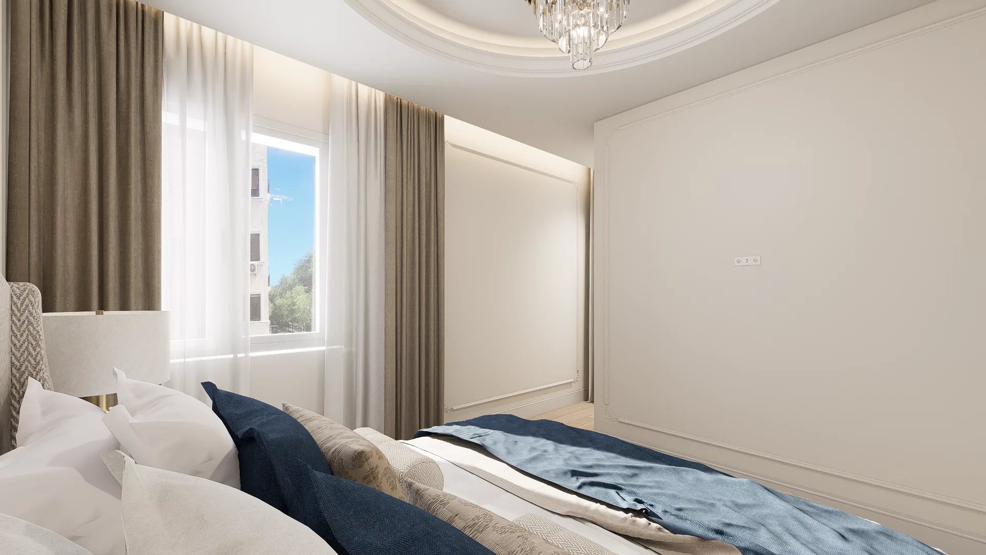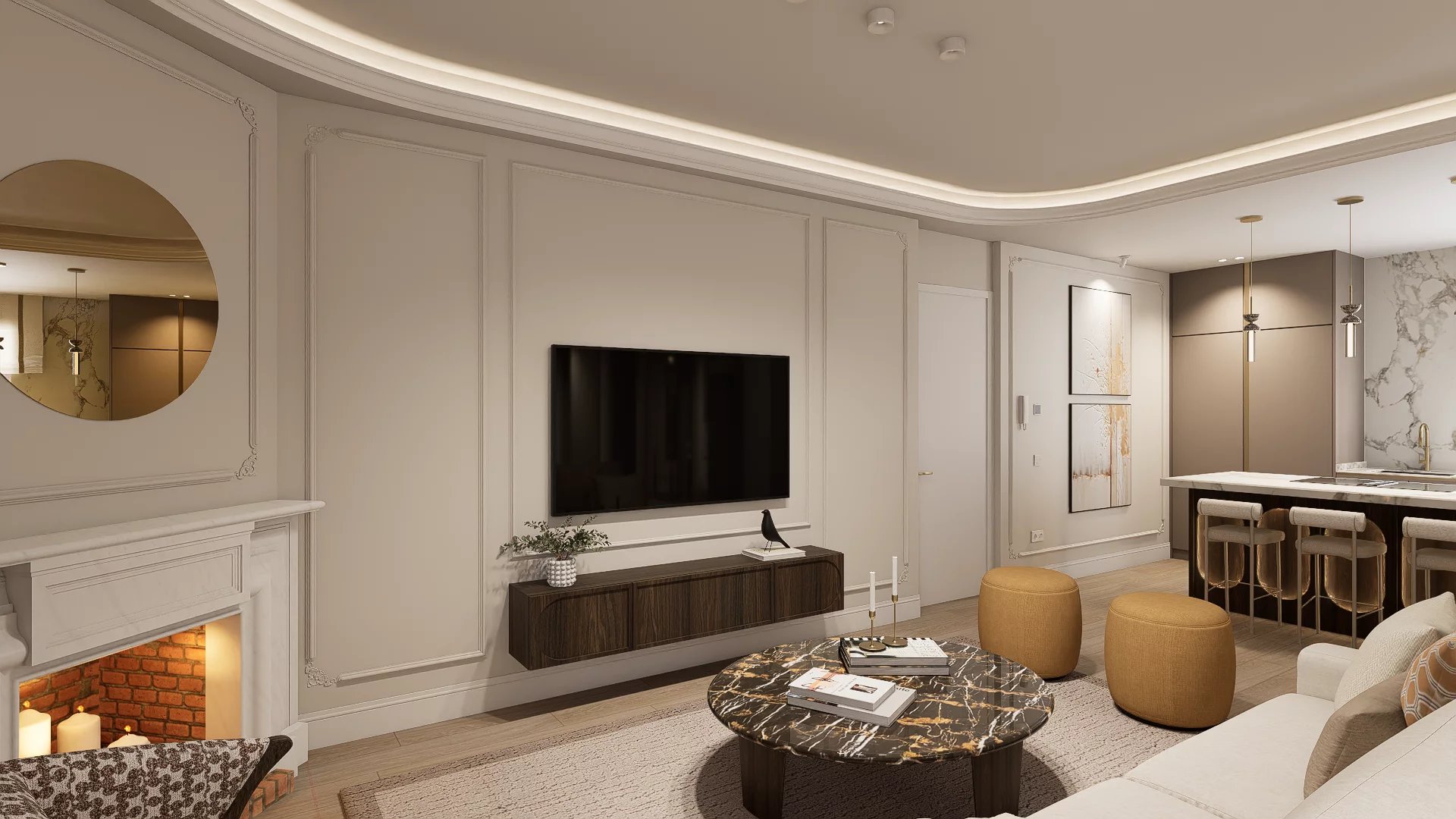 The south-facing orientation maximizes natural light, complemented by a fully equipped open kitchen, community heating, air conditioning, and smart home features. Delivered fully furnished, the building includes elevator and concierge service.
