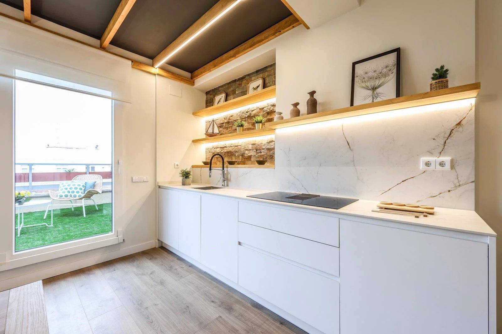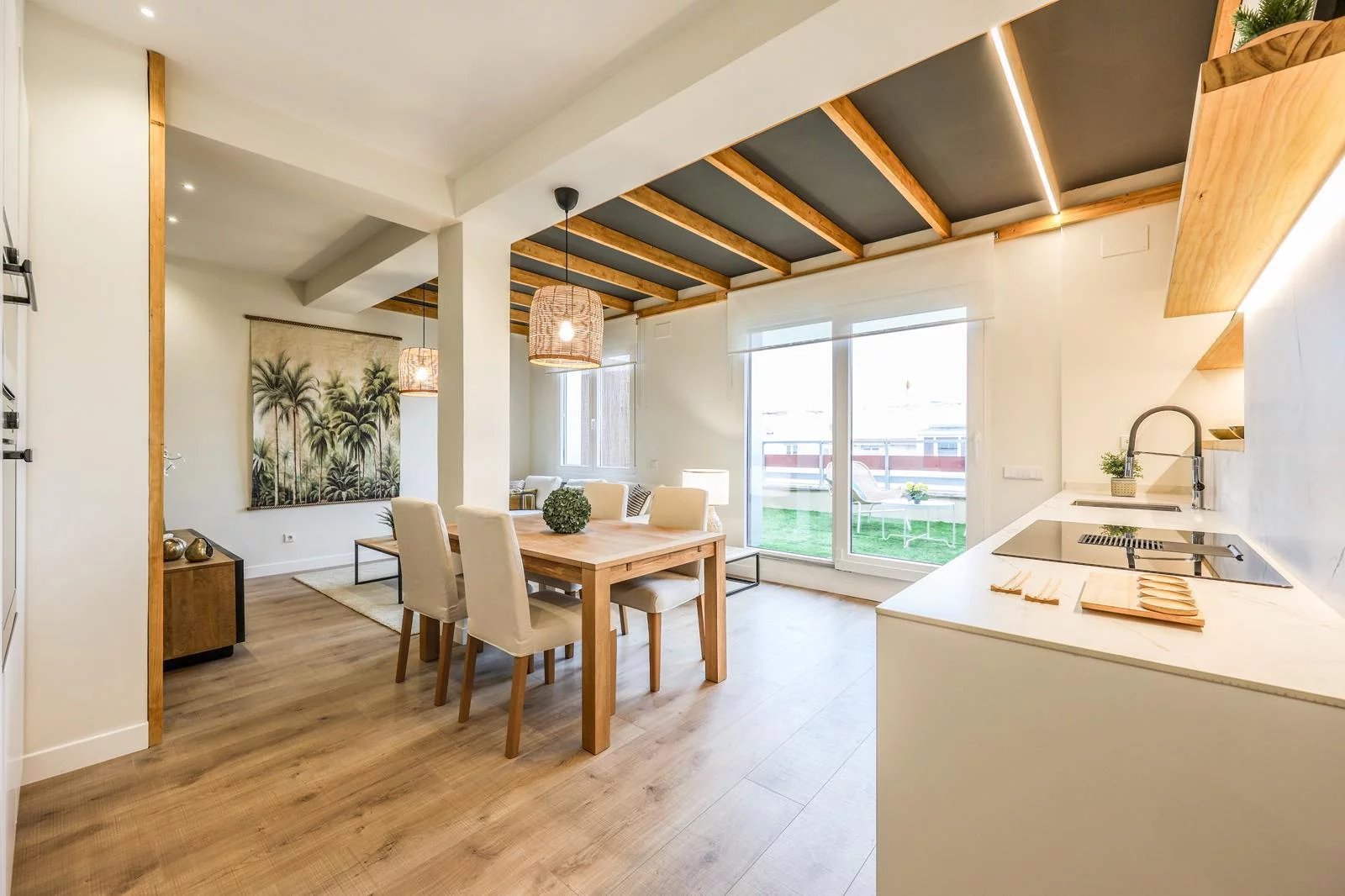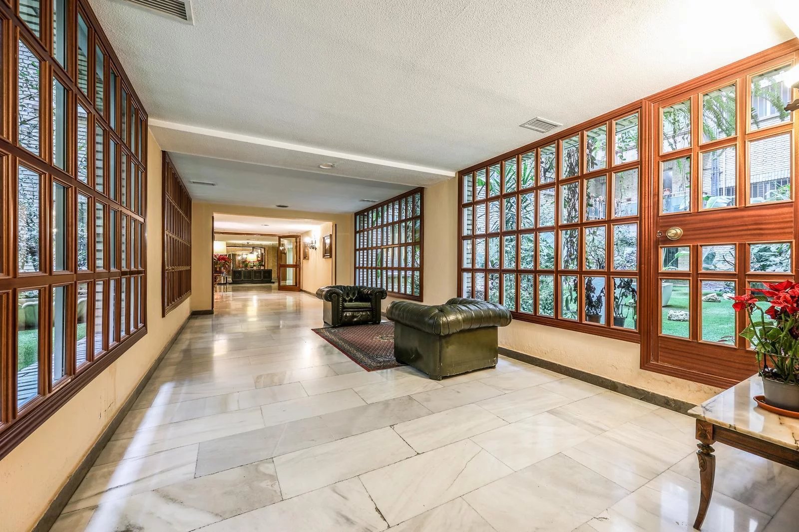 The spacious living room with American kitchen opens directly onto the generous terrace, perfect for outdoor living. Built-in wardrobes in all bedrooms, a comprehensive refurbishment with premium materials, ducted air conditioning throughout, PVC tilt-and-turn windows with motorized blinds, and delivered fully furnished. The building features a grand entrance hall and physical concierge service.