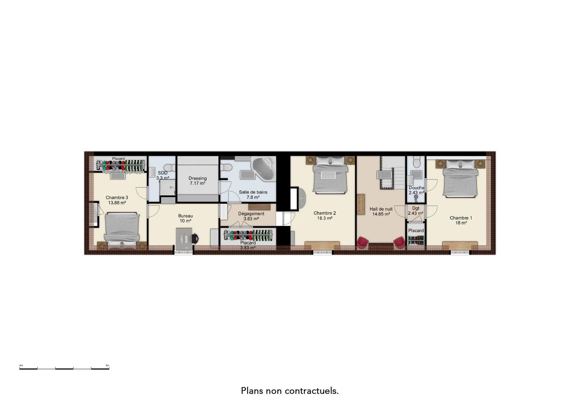 La maison, d’une surface habitable de 250 m² organisée sur deux niveaux, comprend de chaleureux espaces de vie au rez-de-chaussée et quatre chambres réparties entre les deux niveaux, dont trois agencées en suite avec salle d’eau / WC et espace dressing privatifs.