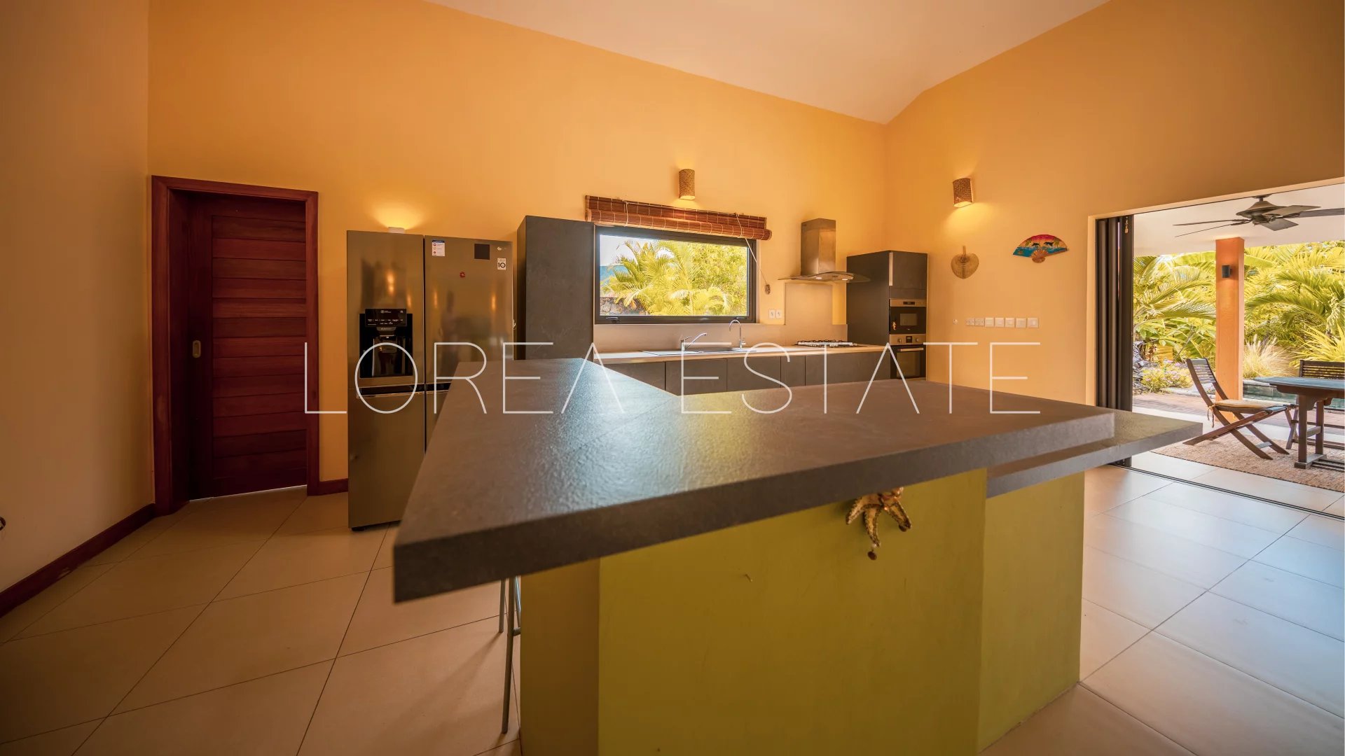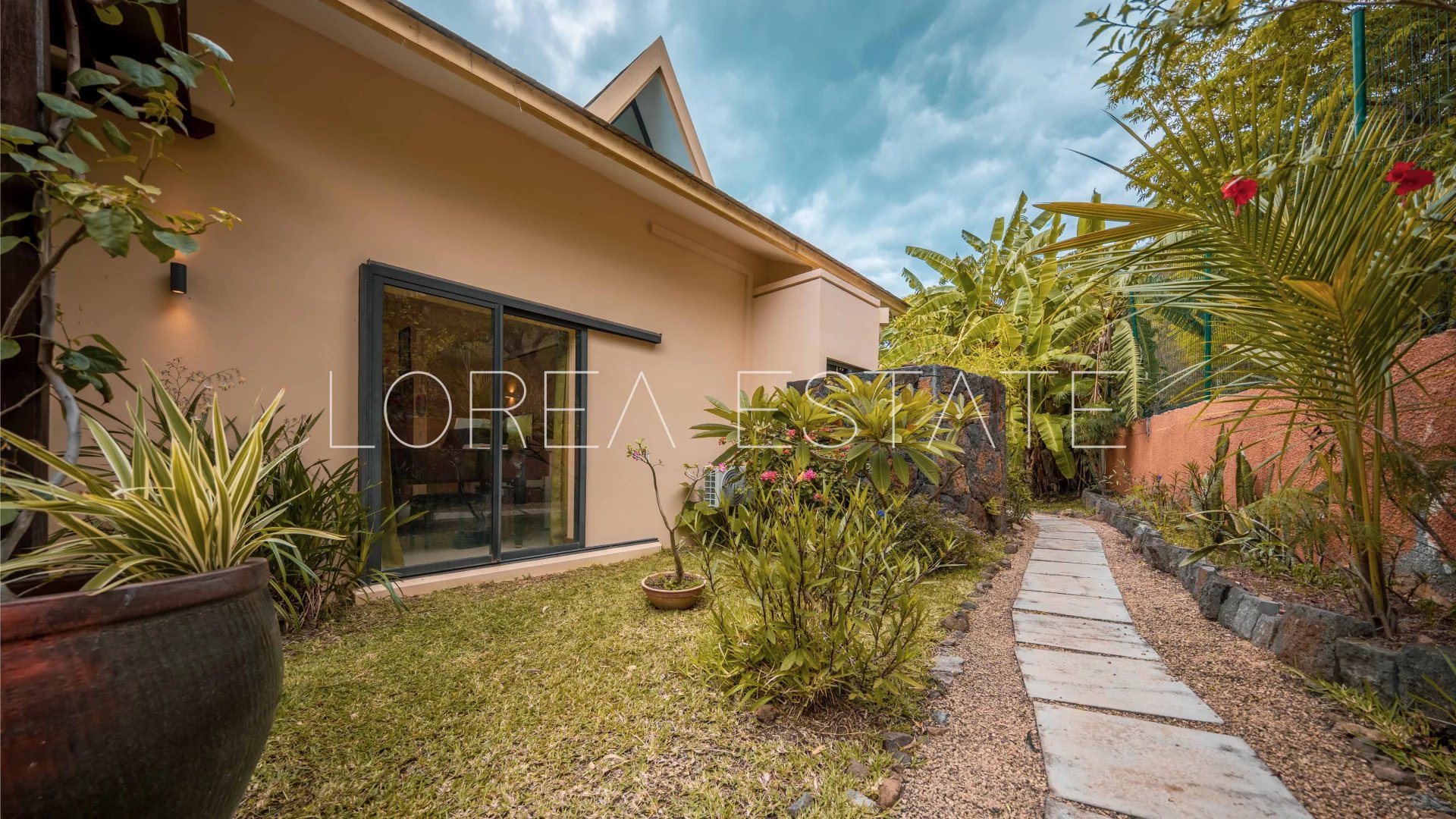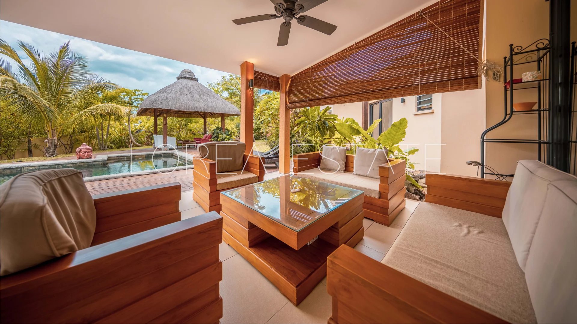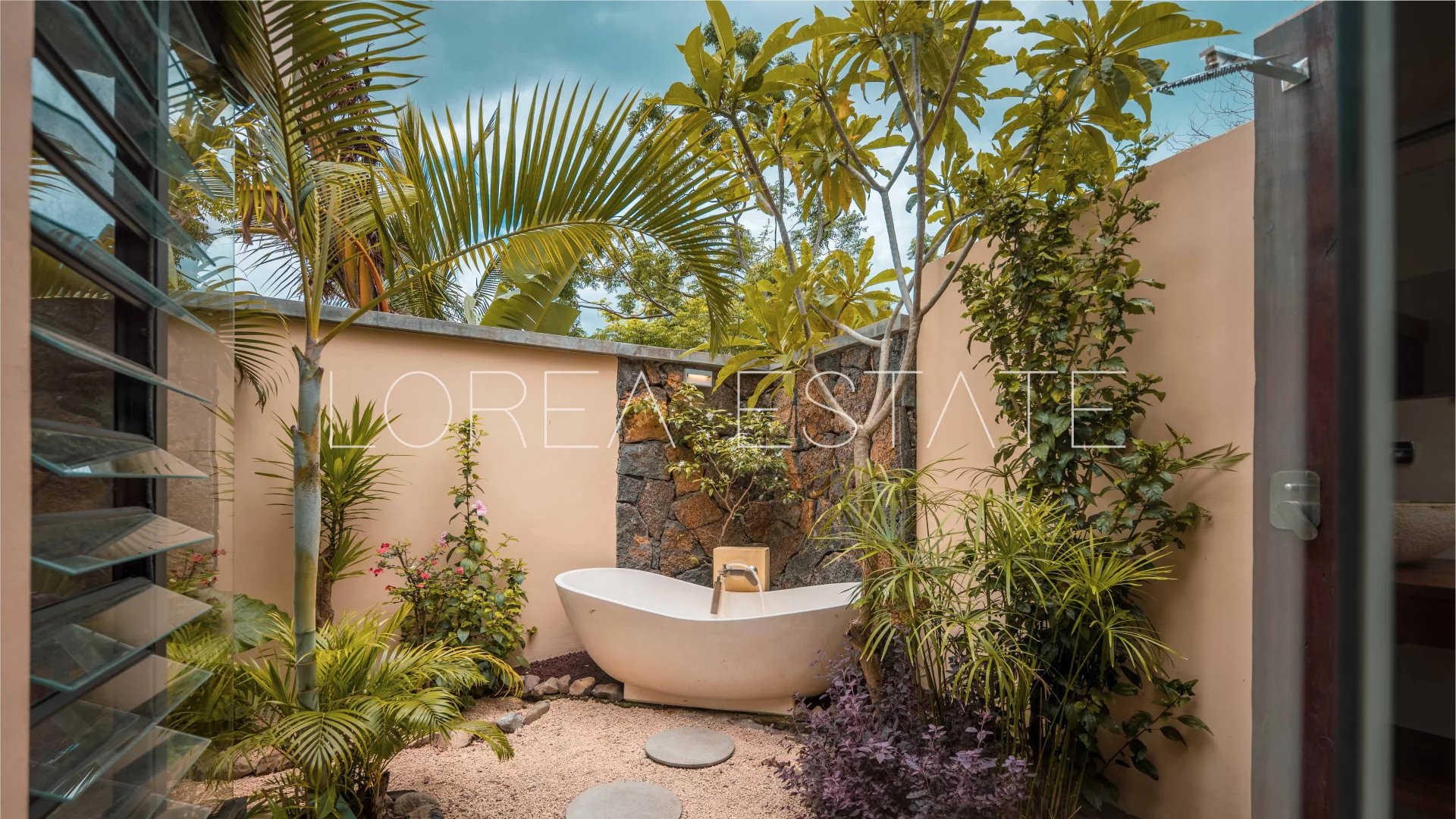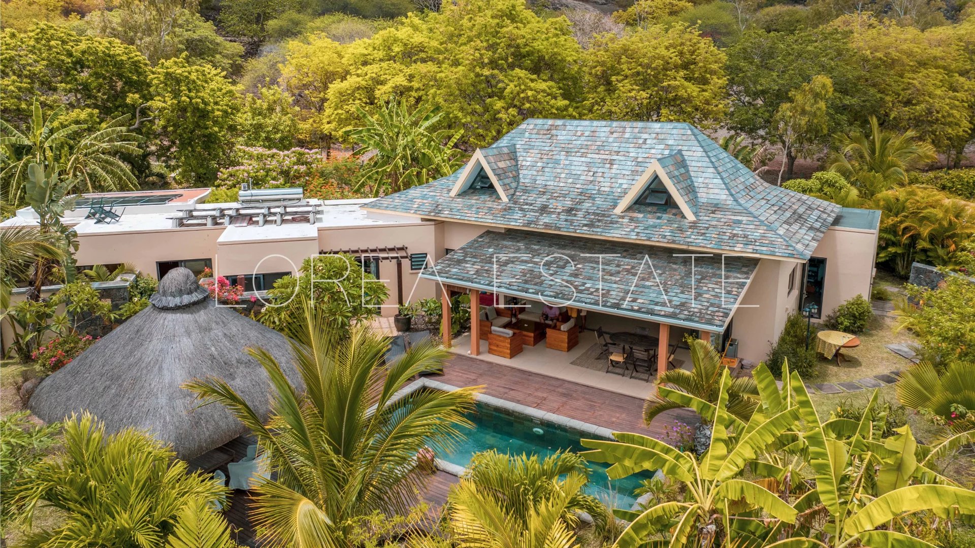 Nichée au milieu des magnifiques montagnes de la côte ouest de l'île Maurice, cette villa exquise de style balinais est un havre de tranquillité et de charme tropical. Entourée par une nature luxuriante, la maison est conçue pour inviter la lumière naturelle et les brises rafraîchissantes à travers ses intérieurs spacieux et aérés et ses grandes ouvertures. Le jardin parfaitement entretenu, orné d'arbres fruitiers, dispose d'un charmant kiosque idéal pour les apéritifs au bord de la piscine carrelée d'ardoise.